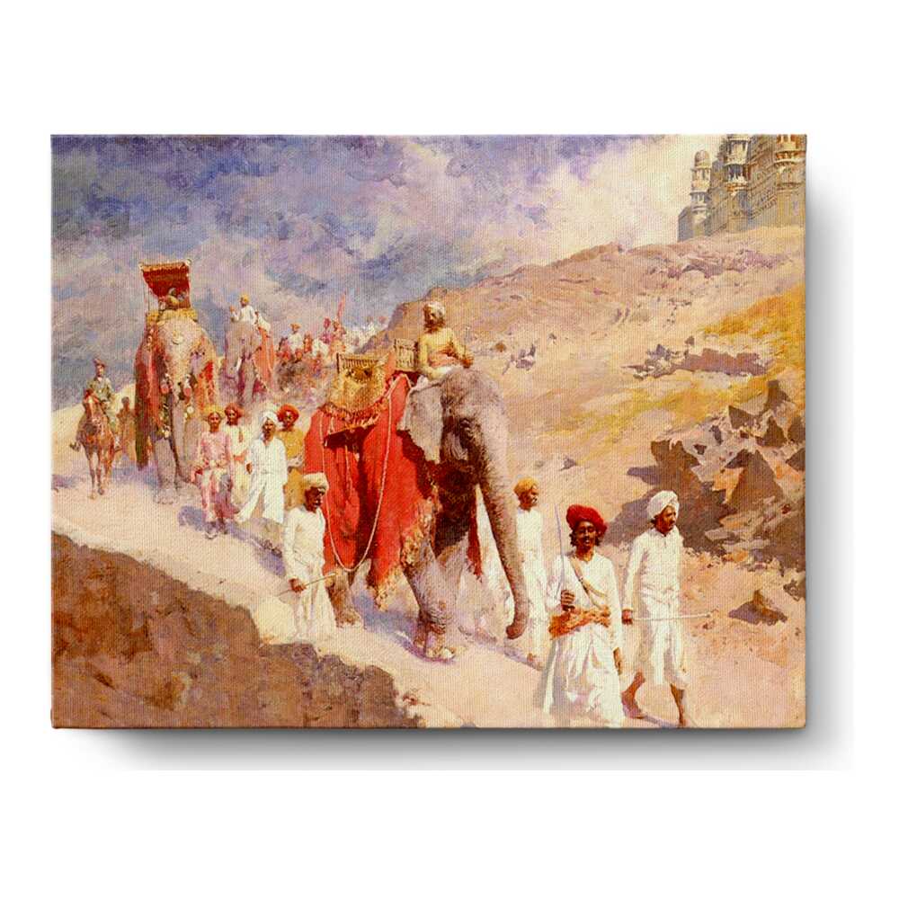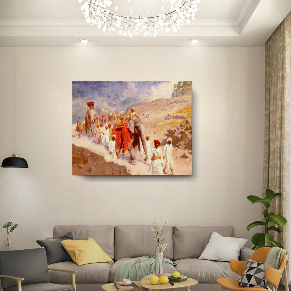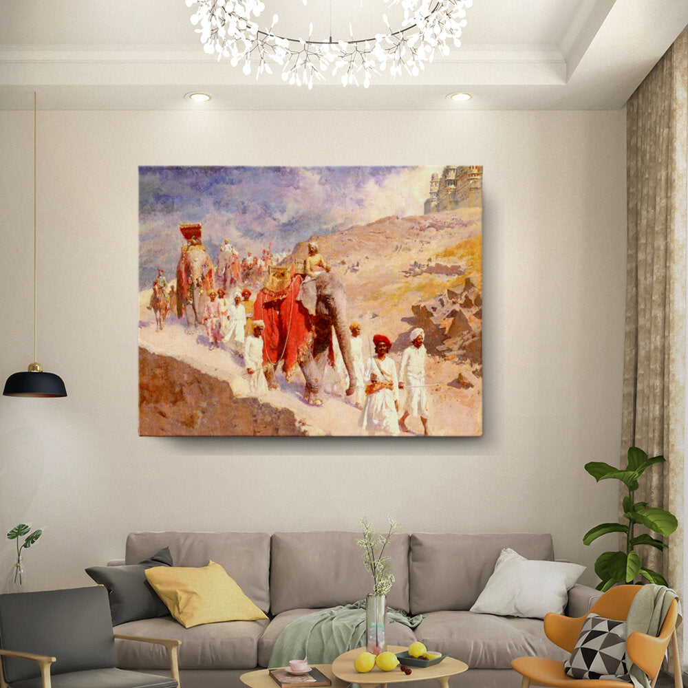 This artwork captures a majestic royal procession featuring elephants and elegantly dressed figures against a dramatic landscape, showcasing the rich cultural heritage of India. The vibrant colors and intricate details highlight the grandeur of the scene, making it a focal point for any art lover.