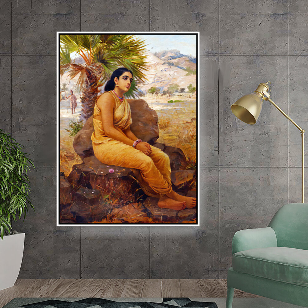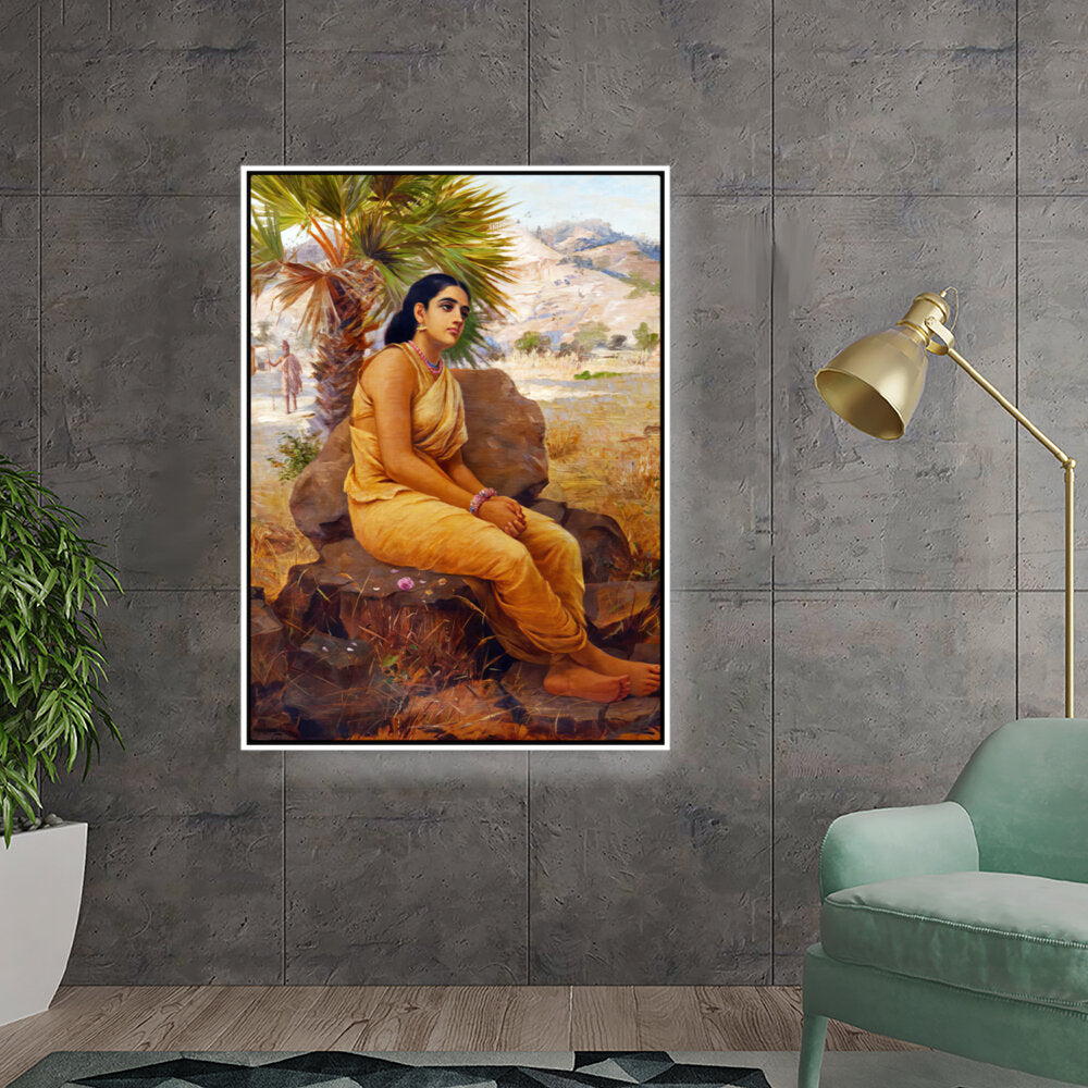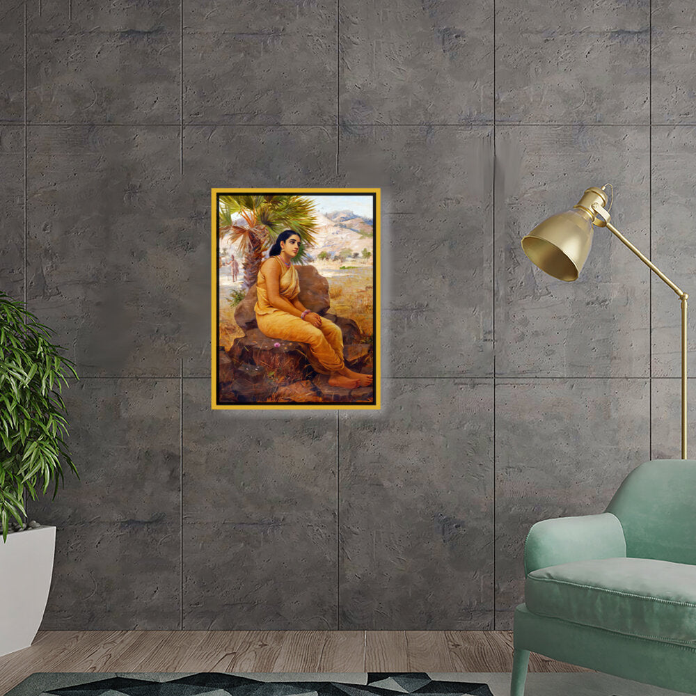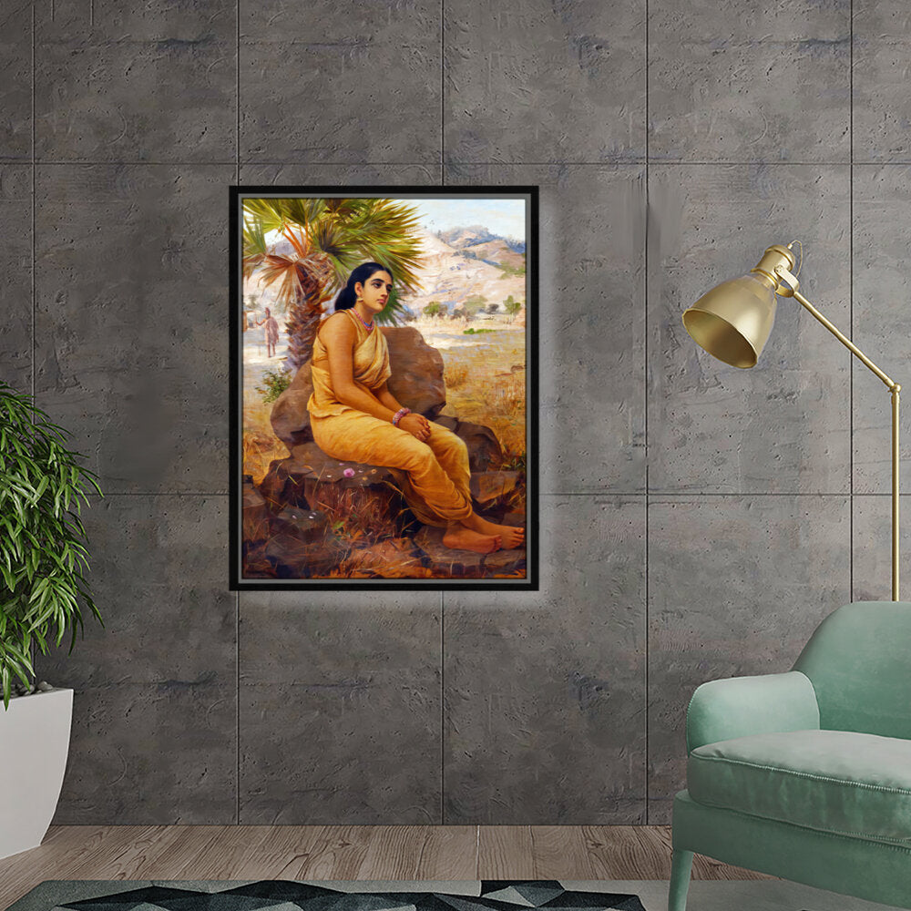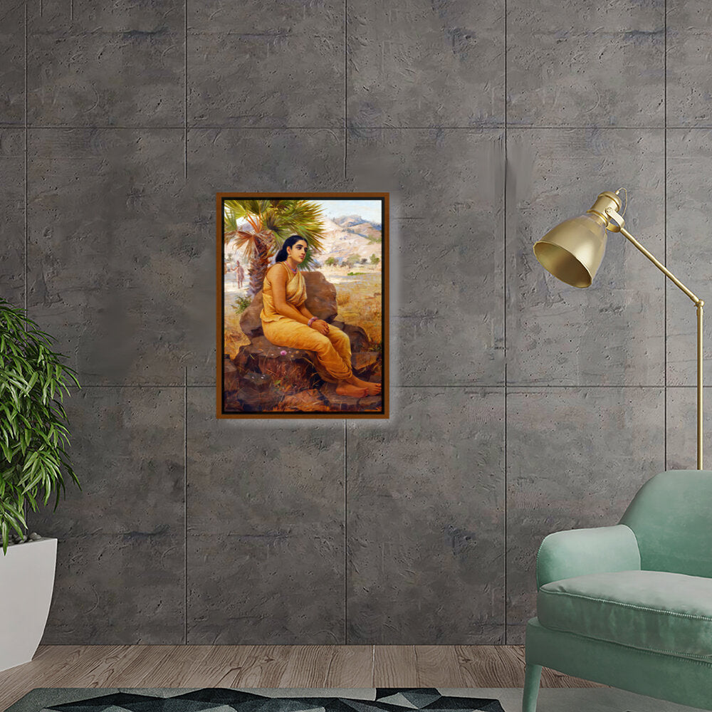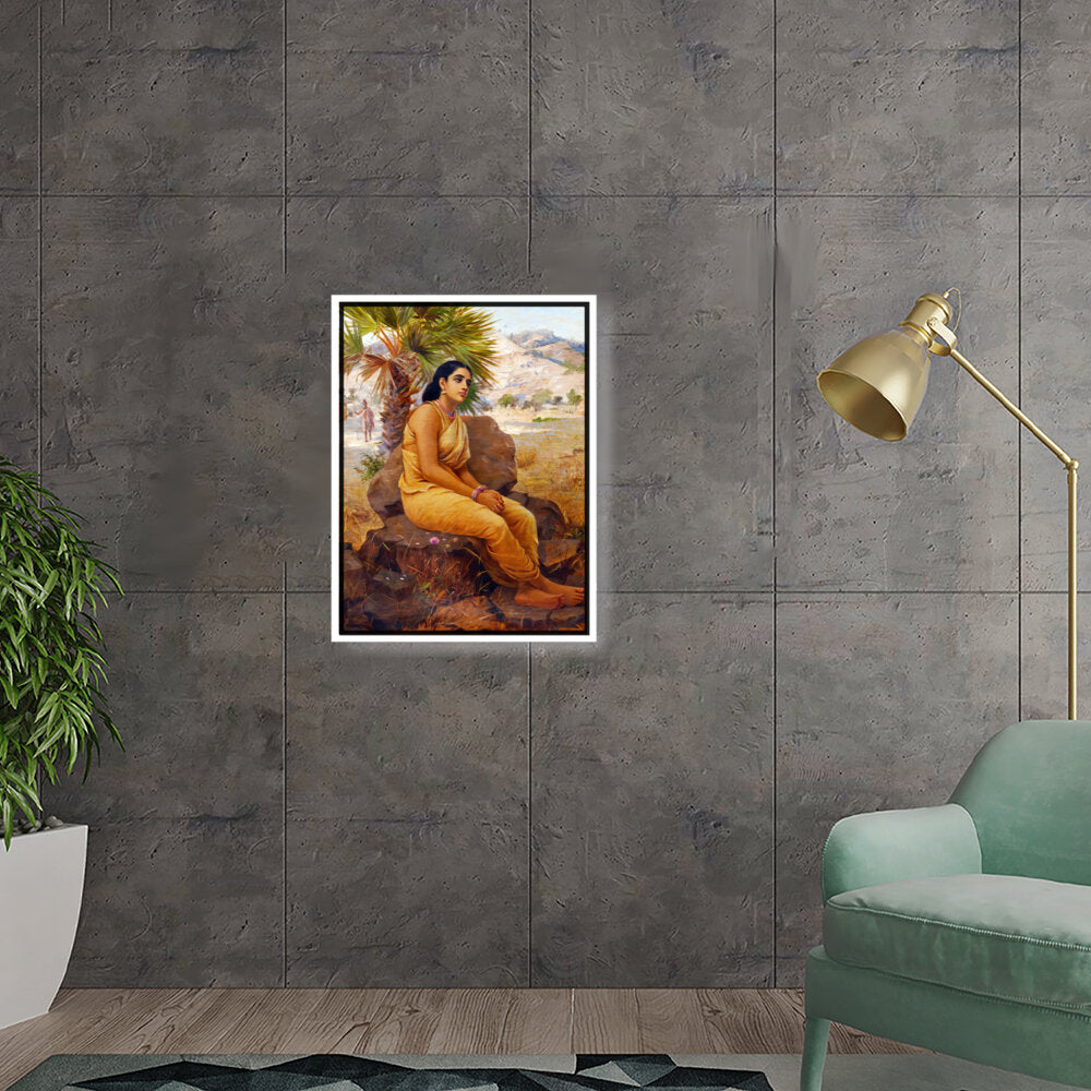 This exquisite oil on canvas piece captures a moment of introspection with a serene figure draped in traditional attire, set against a picturesque landscape. The artist beautifully combines realism and cultural elements to evoke a sense of tranquility and grace.