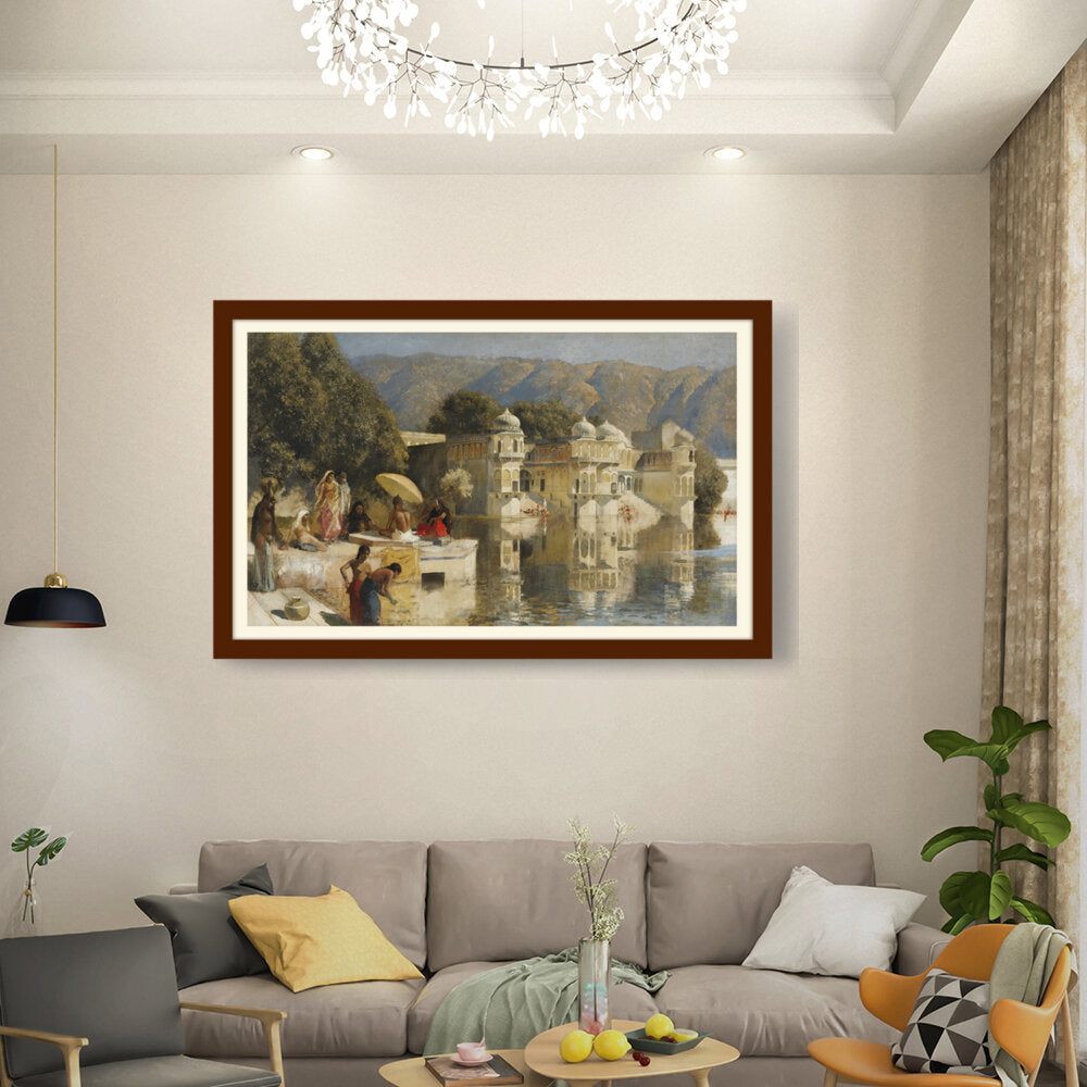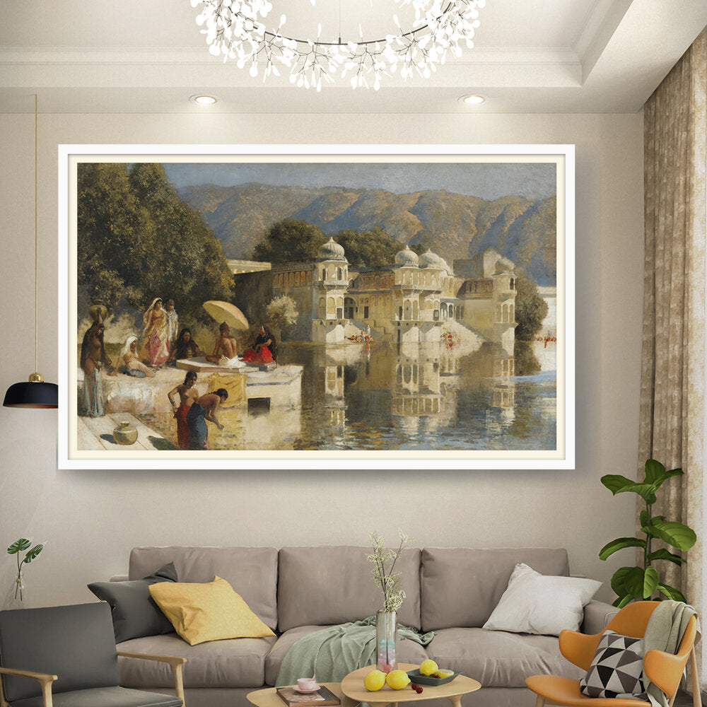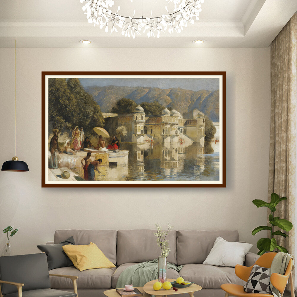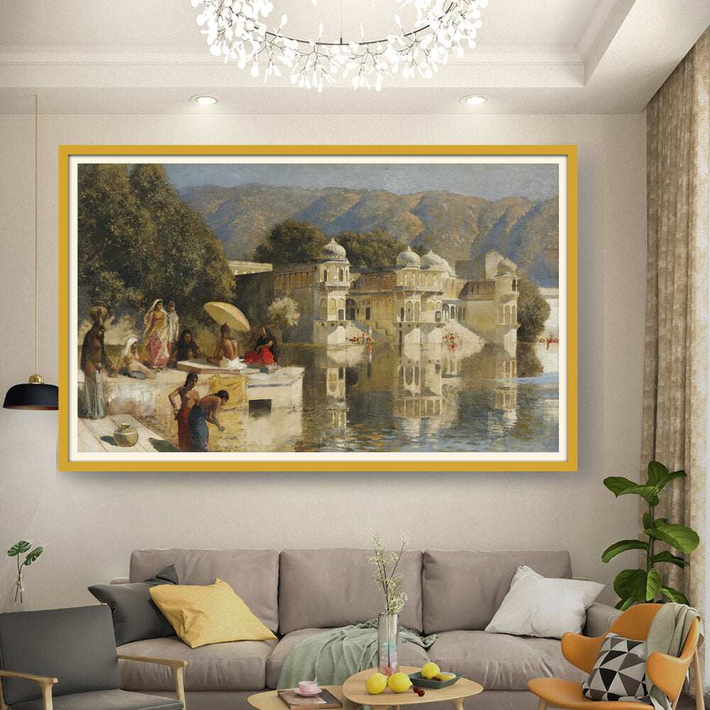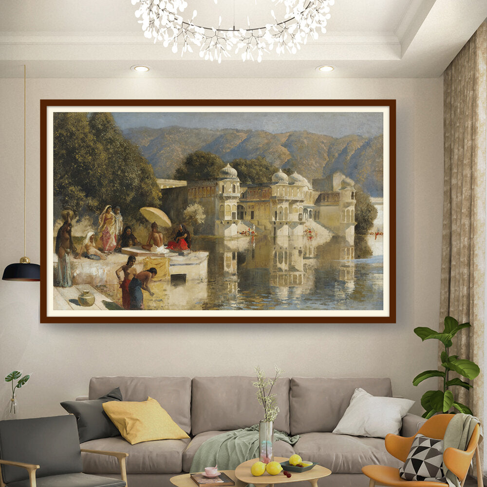 This captivating oil painting showcases a serene scene by the water, featuring figures in traditional attire engaged in daily activities. With its realistic portrayal of the Indian cultural landscape, this artwork invites viewers to experience the tranquility of life by the lakeside.