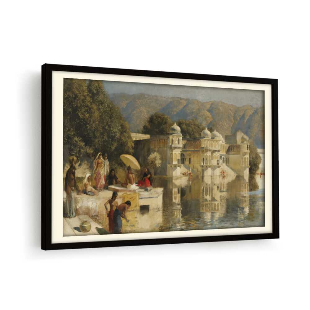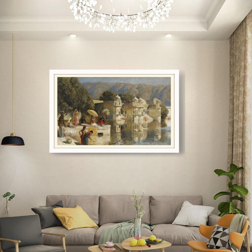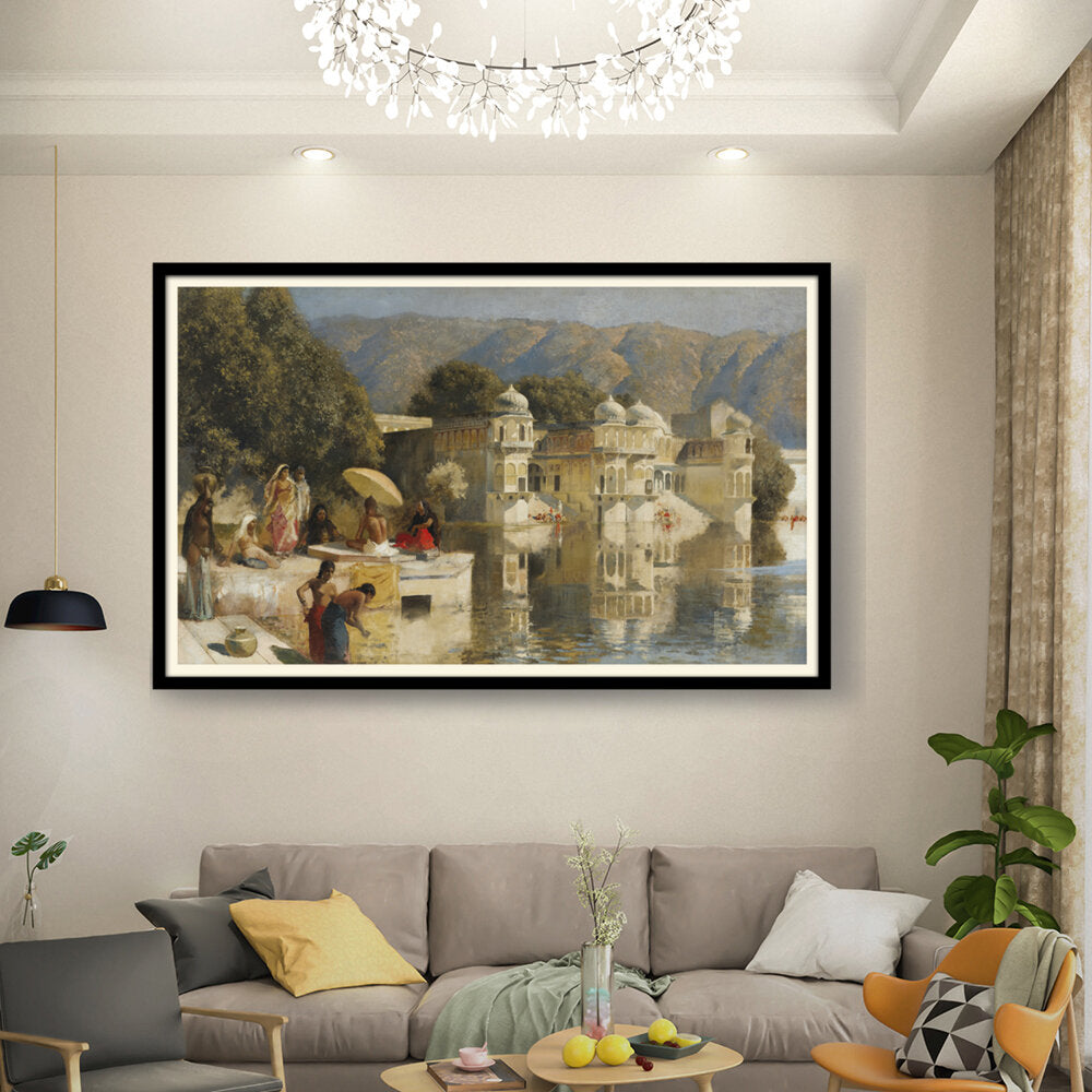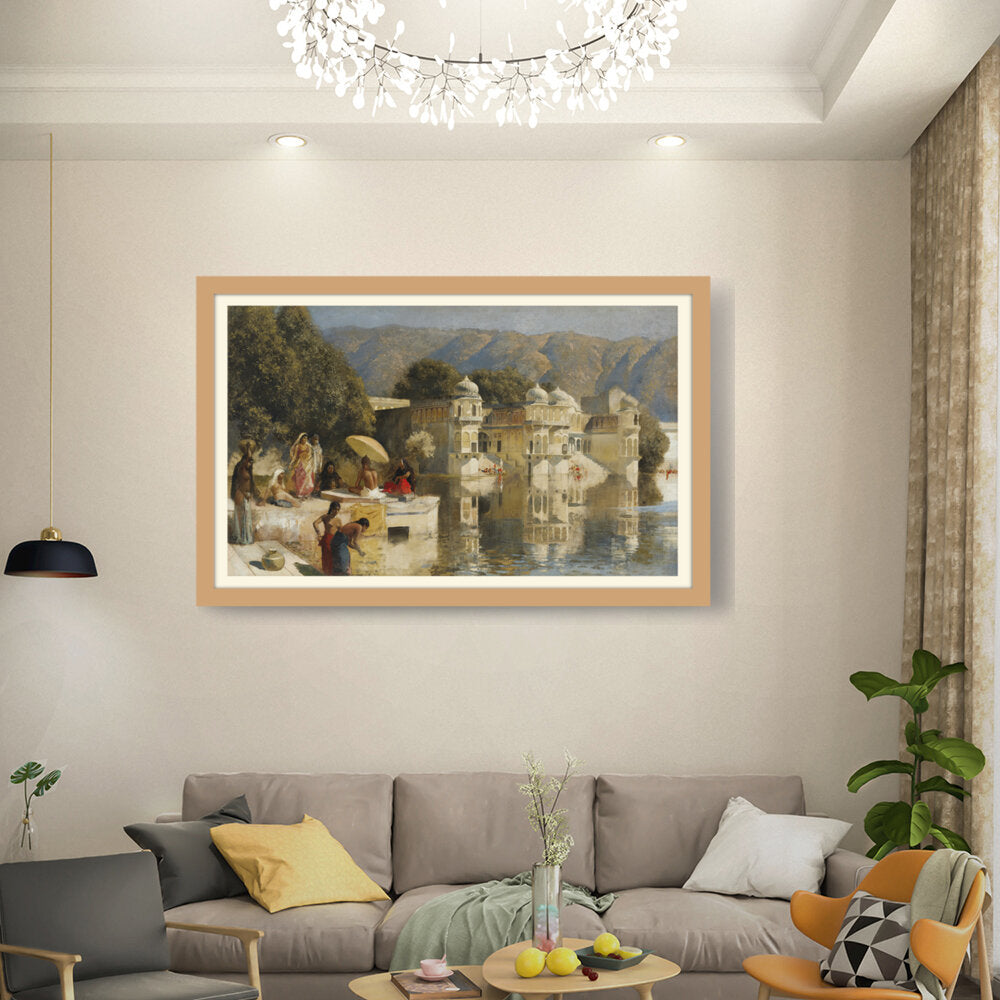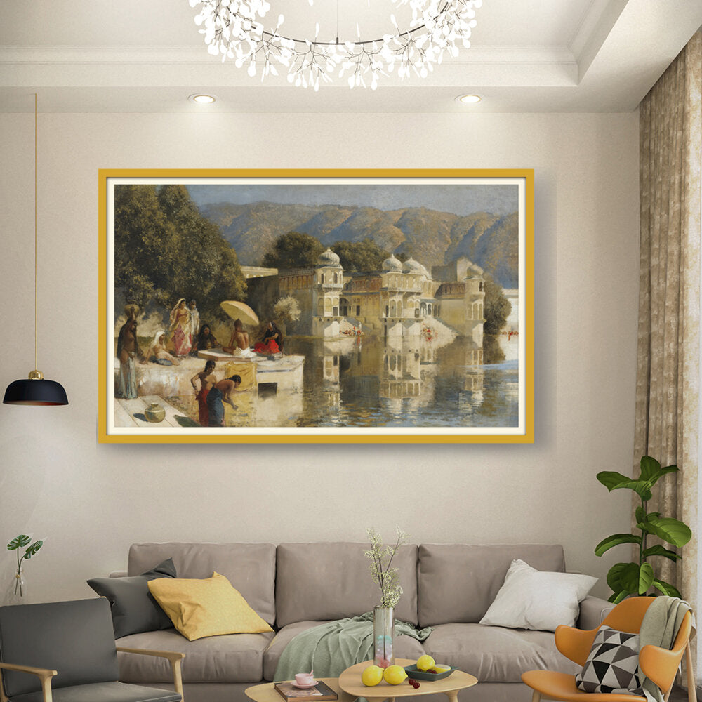 This captivating oil painting showcases a serene scene by the water, featuring figures in traditional attire engaged in daily activities. With its realistic portrayal of the Indian cultural landscape, this artwork invites viewers to experience the tranquility of life by the lakeside.
