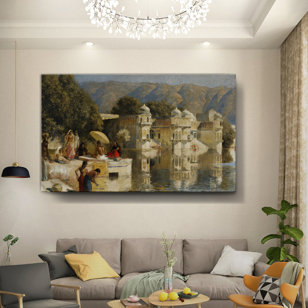 This captivating oil painting showcases a serene scene by the water, featuring figures in traditional attire engaged in daily activities. With its realistic portrayal of the Indian cultural landscape, this artwork invites viewers to experience the tranquility of life by the lakeside.
