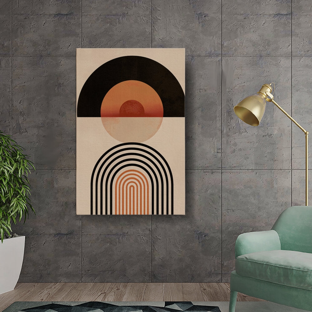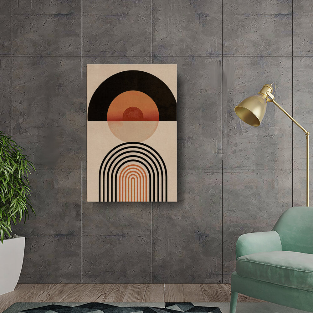 This minimalist digital artwork features a harmonious blend of geometric shapes and warm, earthy tones. Perfect for enhancing your living space, it adds a touch of modern elegance and tranquility to any room.