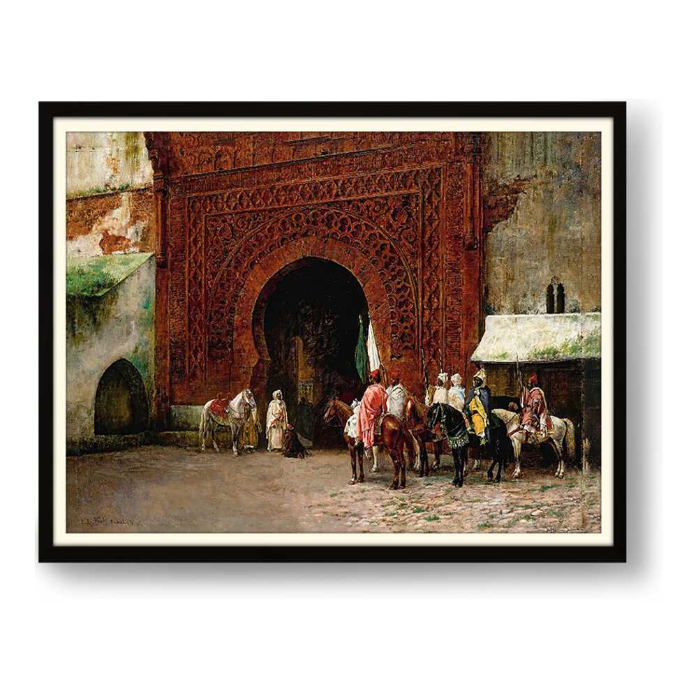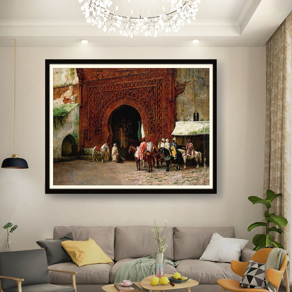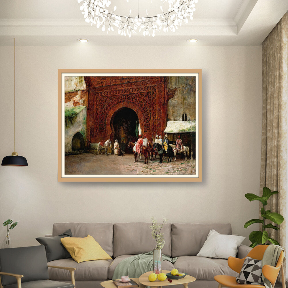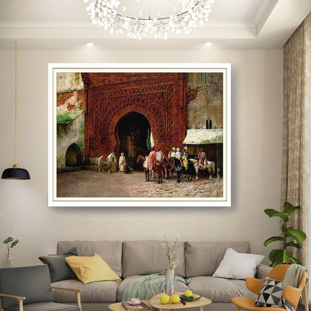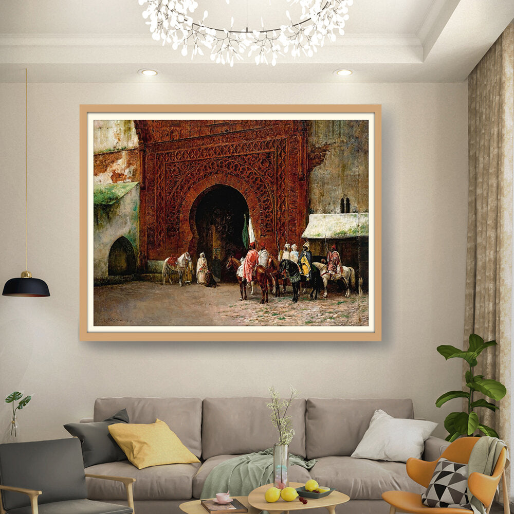 This captivating oil painting depicts a historic scene of figures and horses gathered at an intricately carved gate, showcasing the grandeur of architectural design. The rich colors and detailed brushwork invite viewers into a narrative of time and place, making it an ideal centerpiece for any living space.