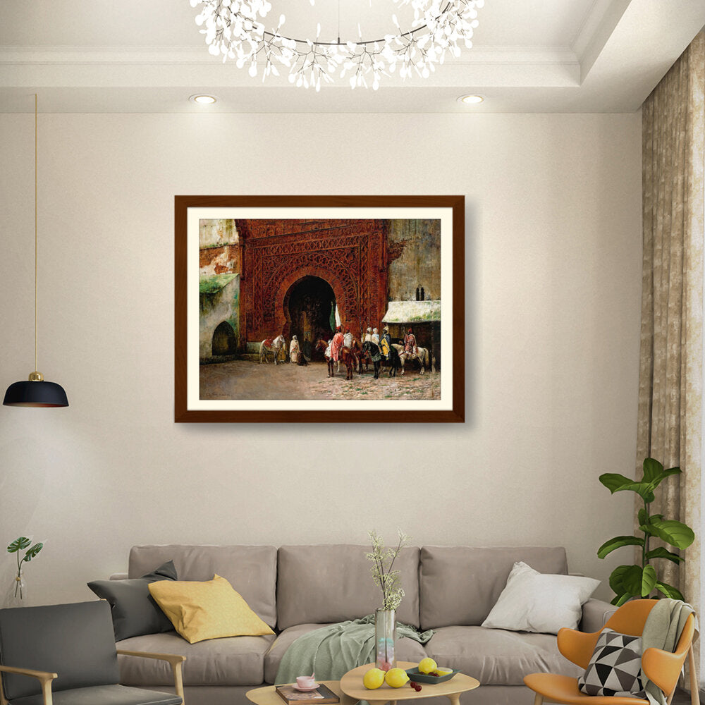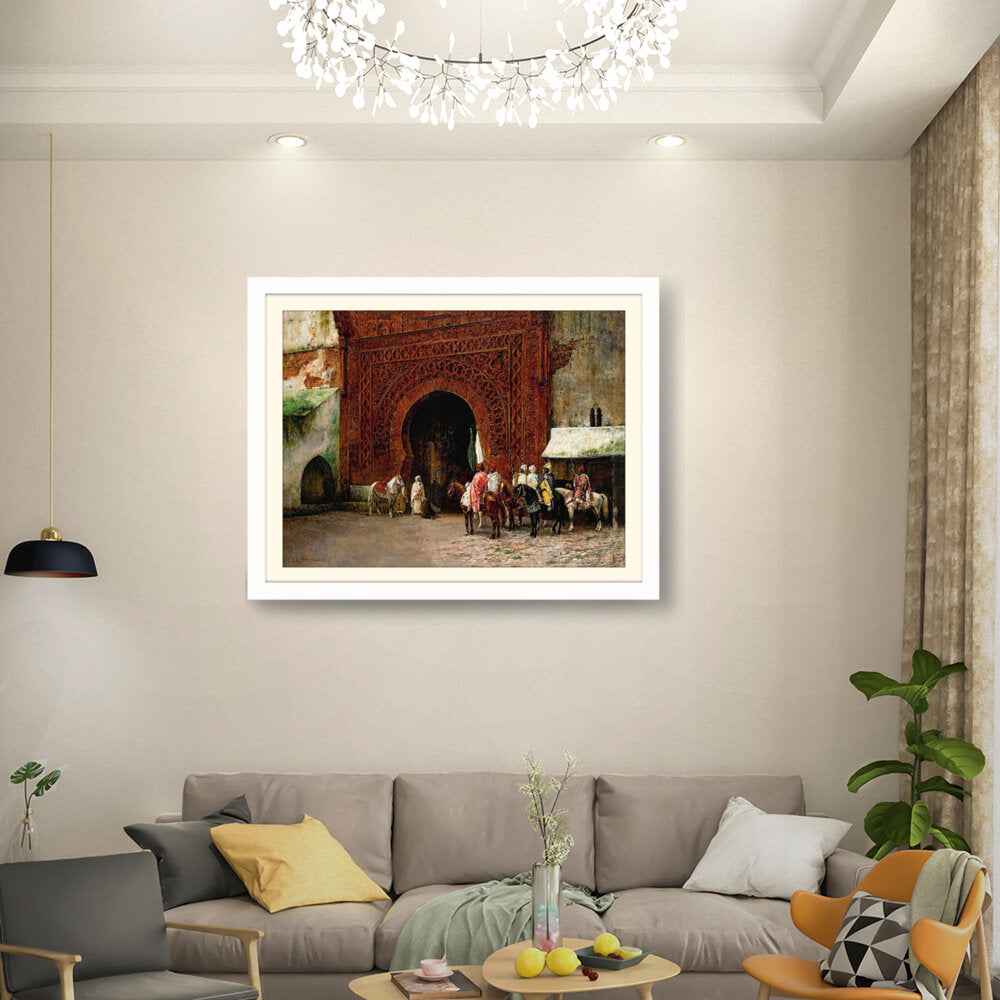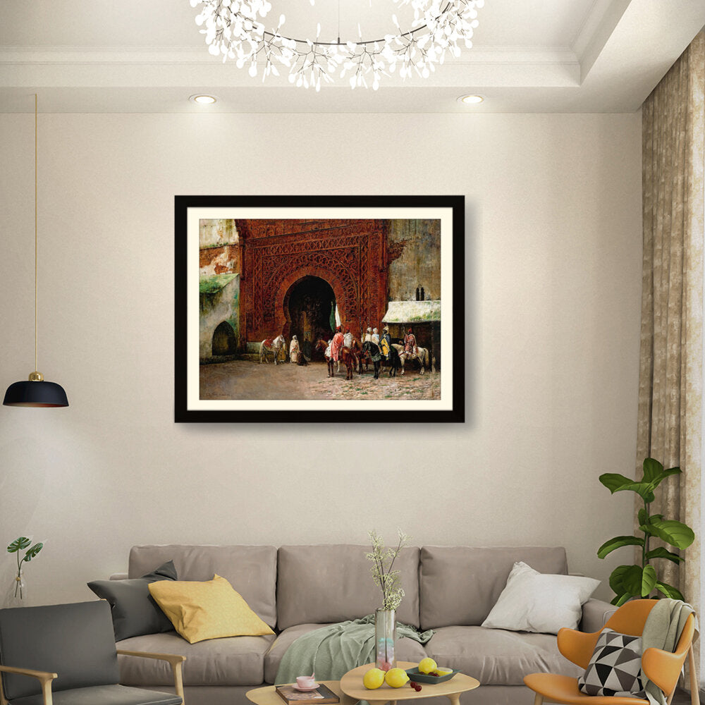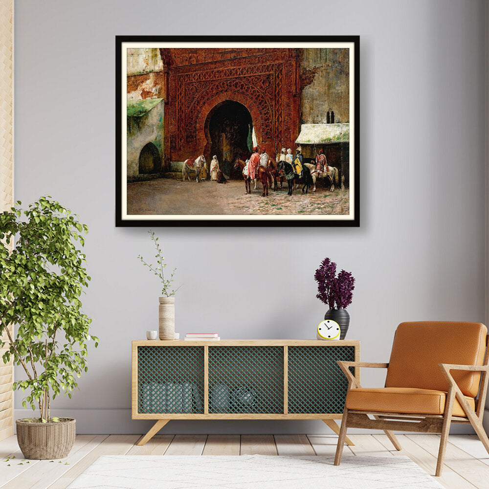 This captivating oil painting depicts a historic scene of figures and horses gathered at an intricately carved gate, showcasing the grandeur of architectural design. The rich colors and detailed brushwork invite viewers into a narrative of time and place, making it an ideal centerpiece for any living space.