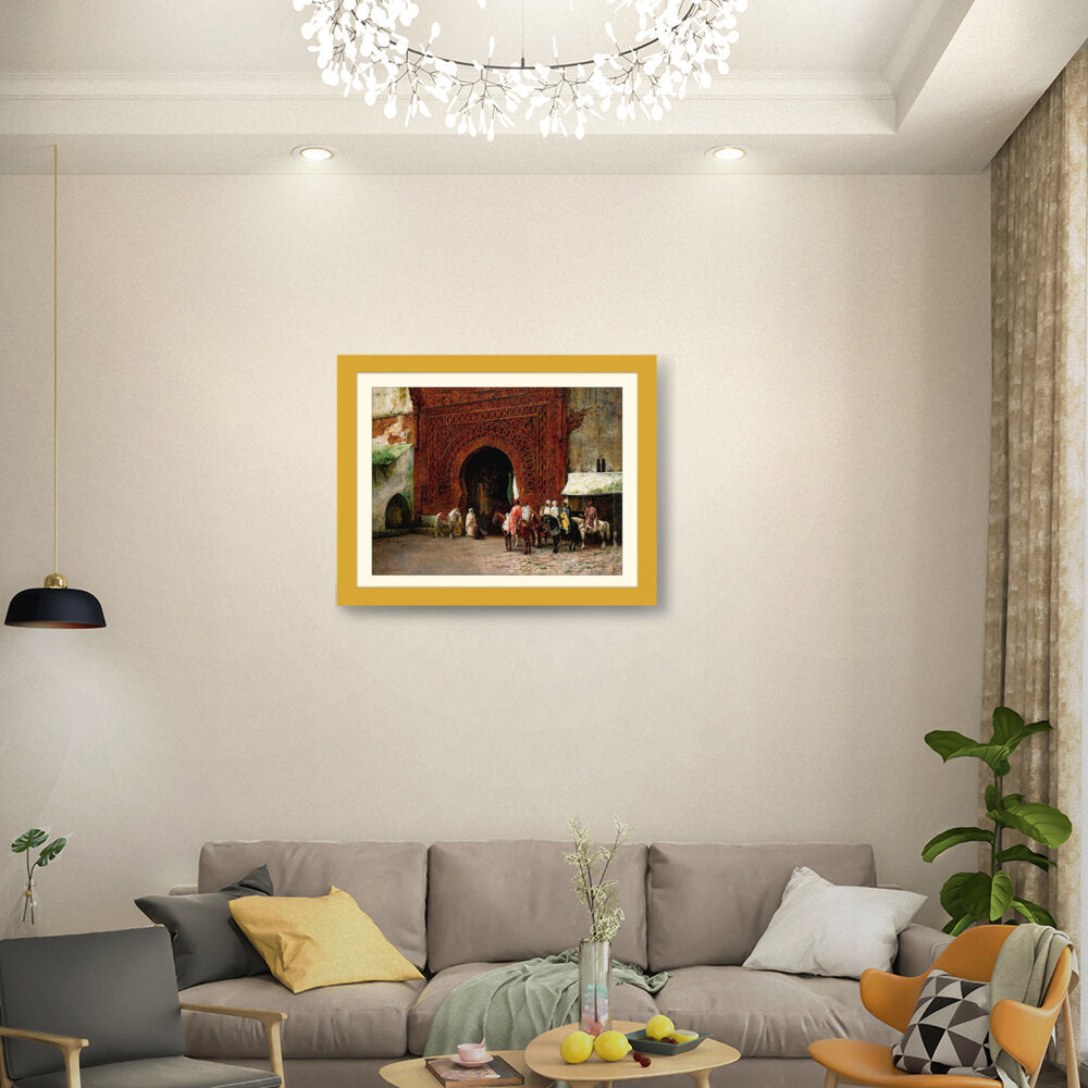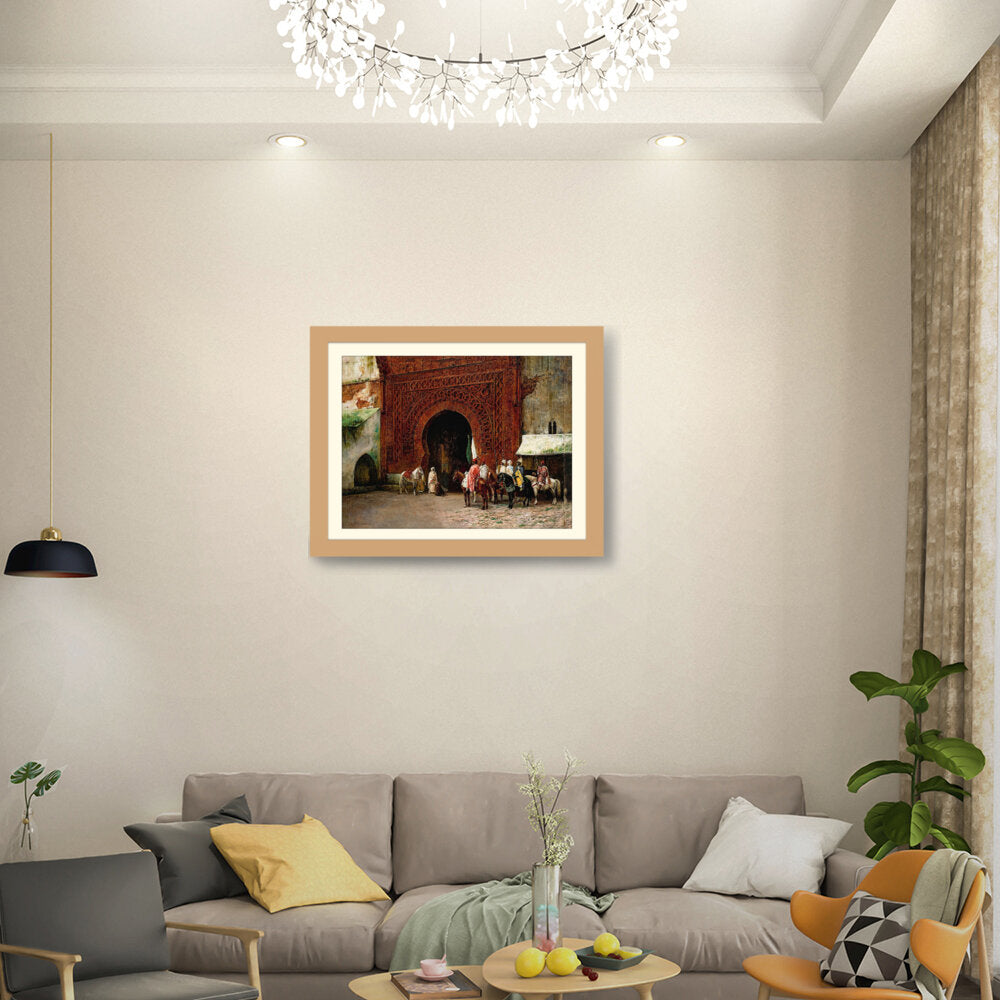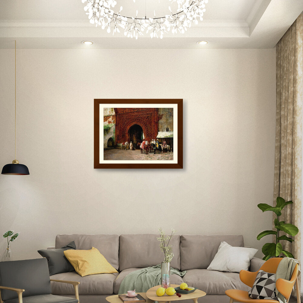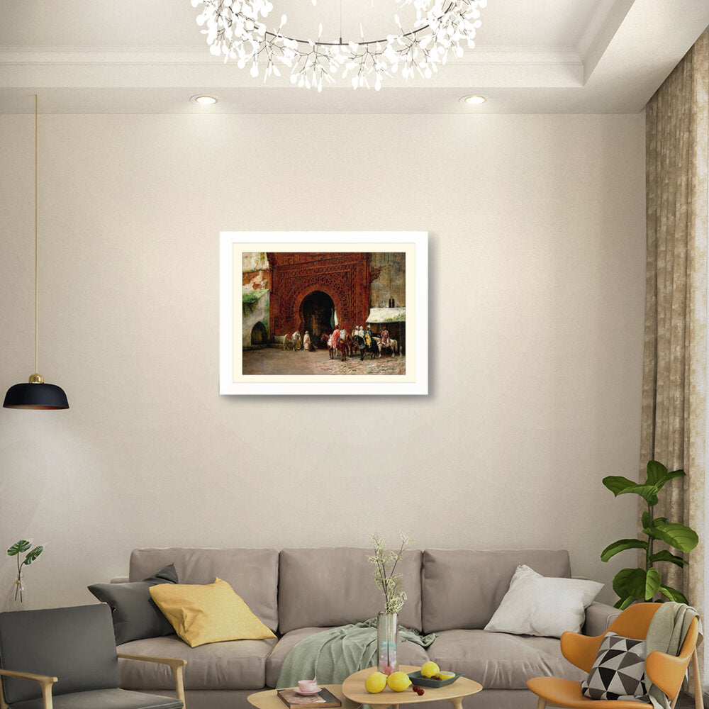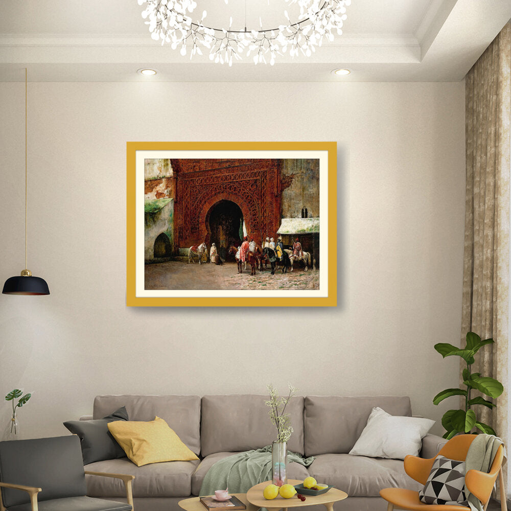 This captivating oil painting depicts a historic scene of figures and horses gathered at an intricately carved gate, showcasing the grandeur of architectural design. The rich colors and detailed brushwork invite viewers into a narrative of time and place, making it an ideal centerpiece for any living space.