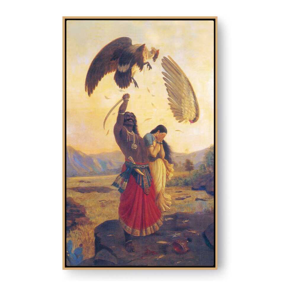 This captivating painting depicts a powerful scene in which a heroic figure confronts two giant birds, symbolizing...