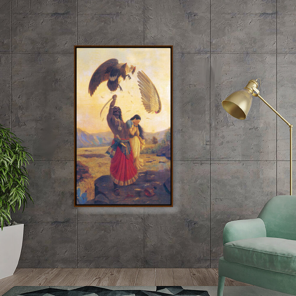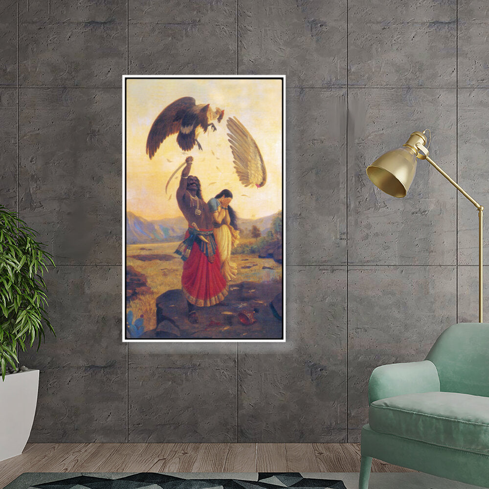 This captivating painting depicts a powerful scene in which a heroic figure confronts two giant birds, symbolizing strength and protection. The intricate details and vibrant colors draw viewers into a dramatic moment, infused with cultural significance.