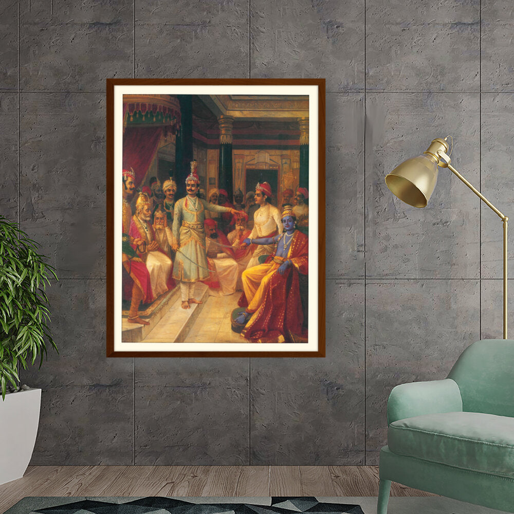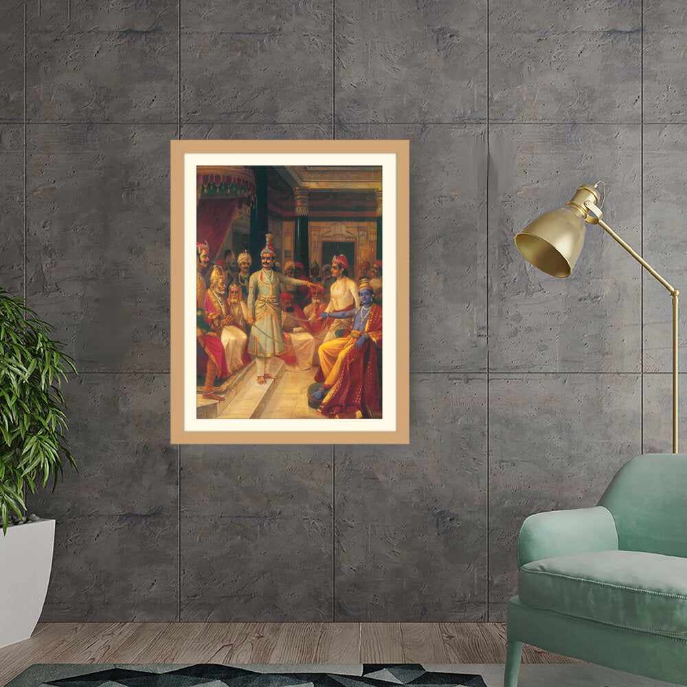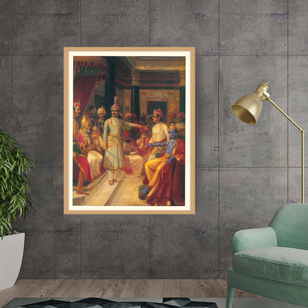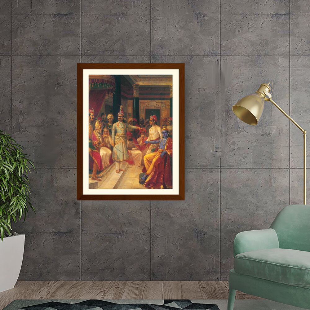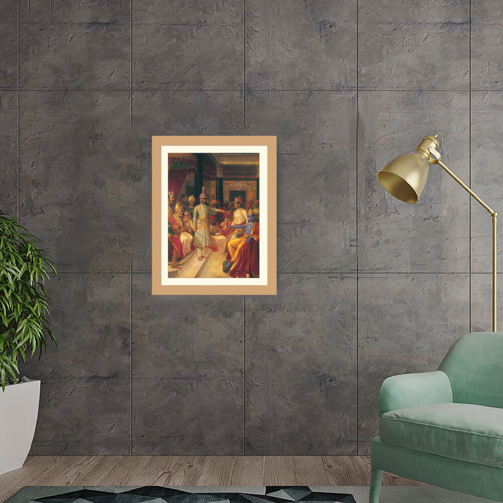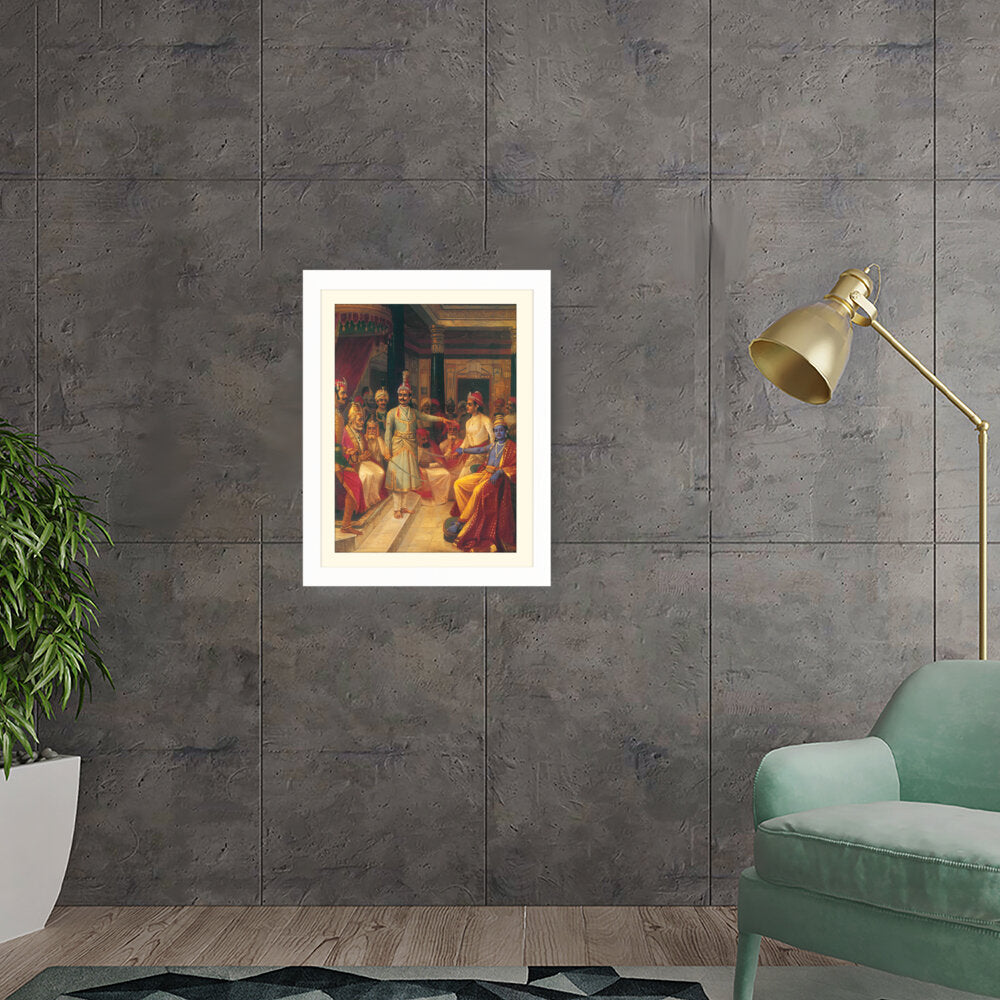 This artwork illustrates a royal court scene featuring intricately dressed figures engaged in discussion. The vivid colors and detailed expressions bring the historical moment to life, making it a captivating centerpiece for any art lover's space.