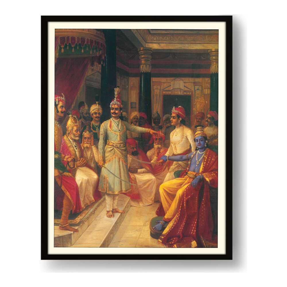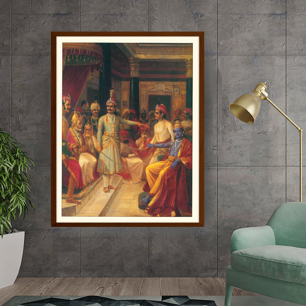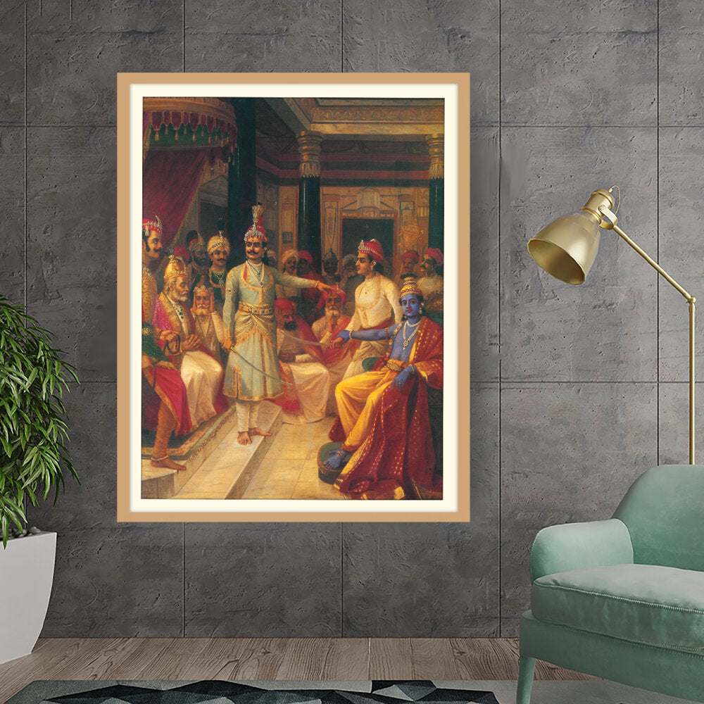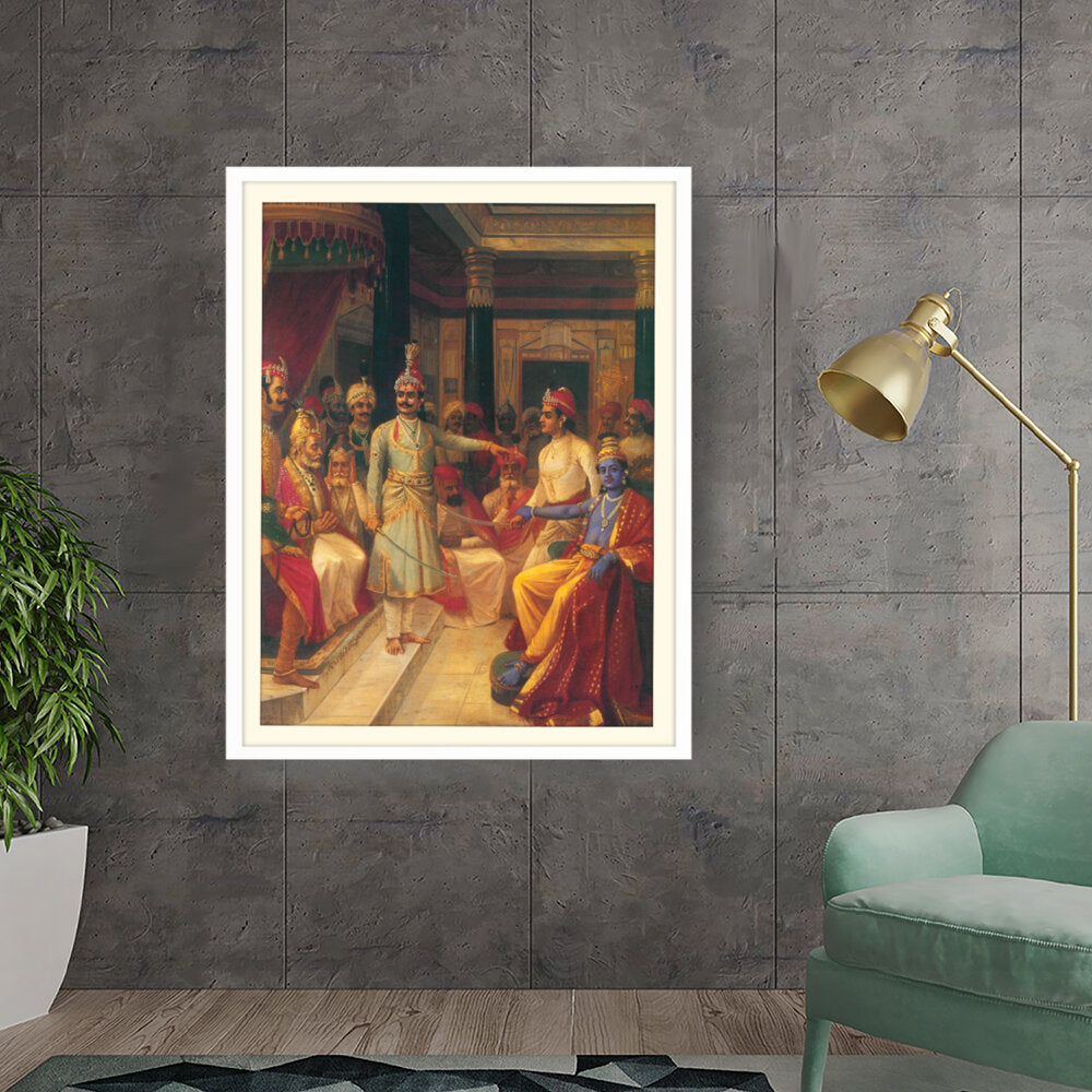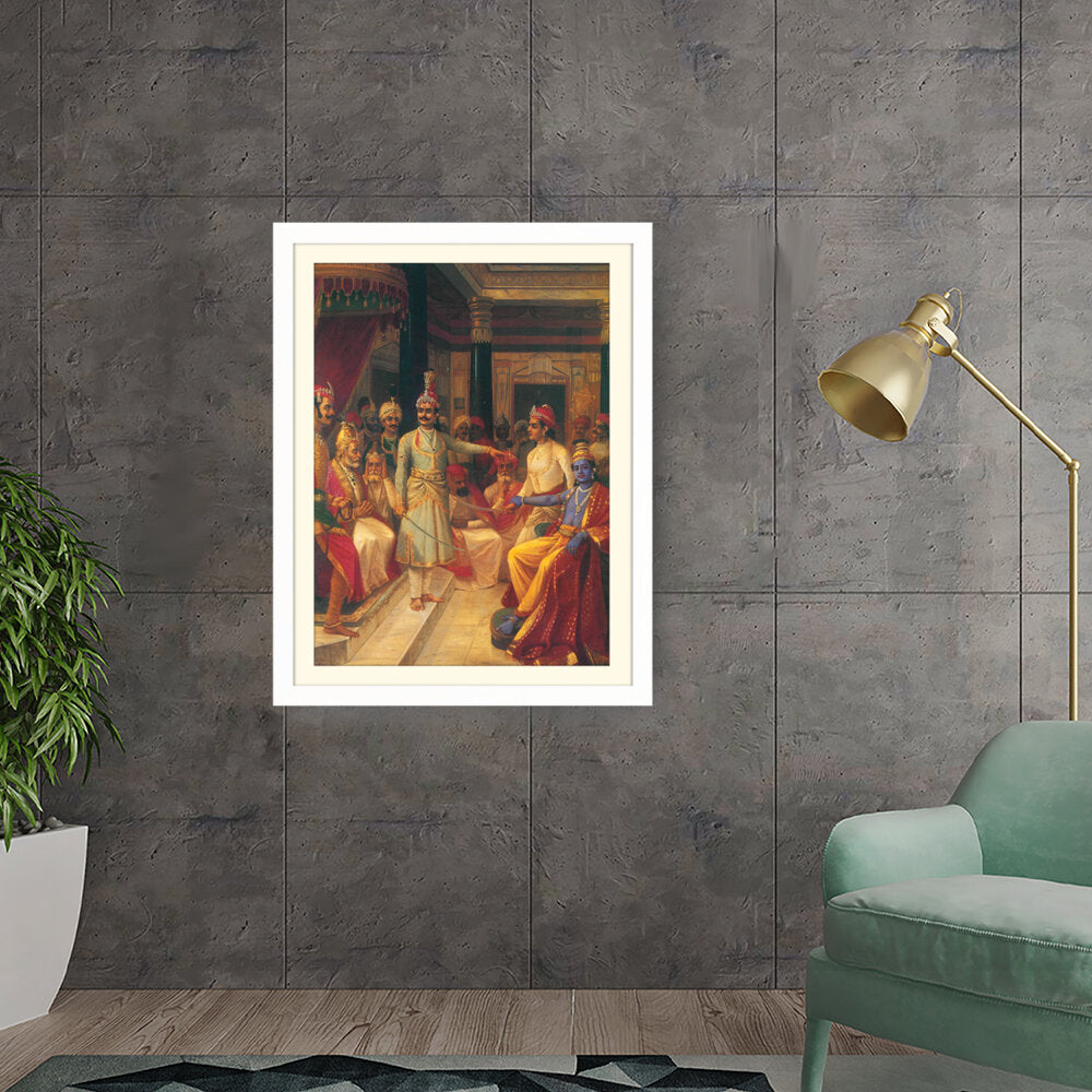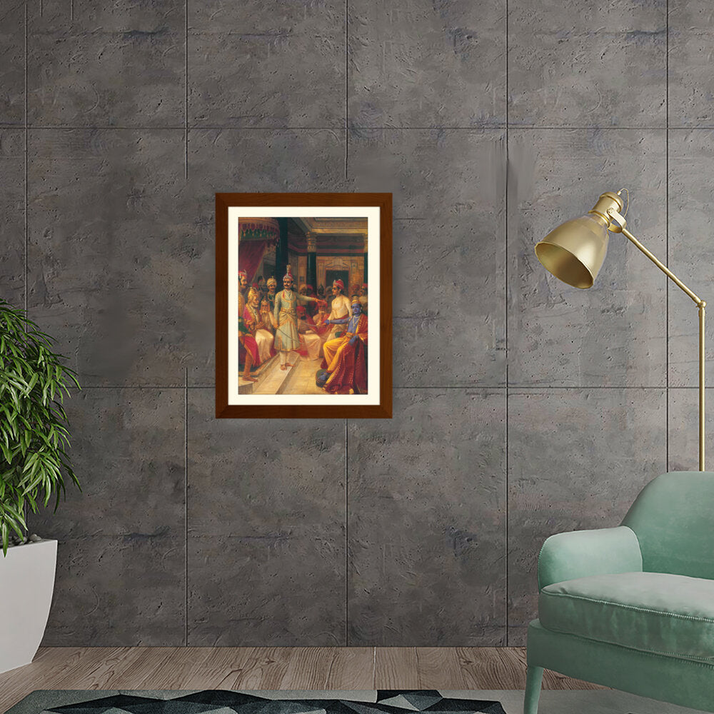 This artwork illustrates a royal court scene featuring intricately dressed figures engaged in discussion. The vivid colors and detailed expressions bring the historical moment to life, making it a captivating centerpiece for any art lover's space.