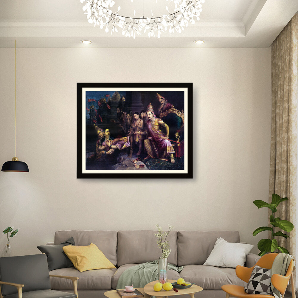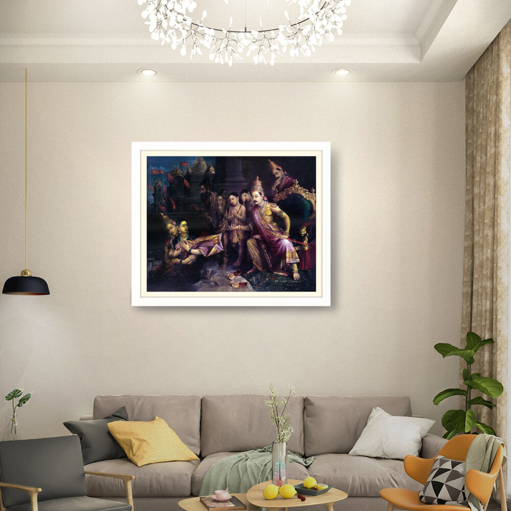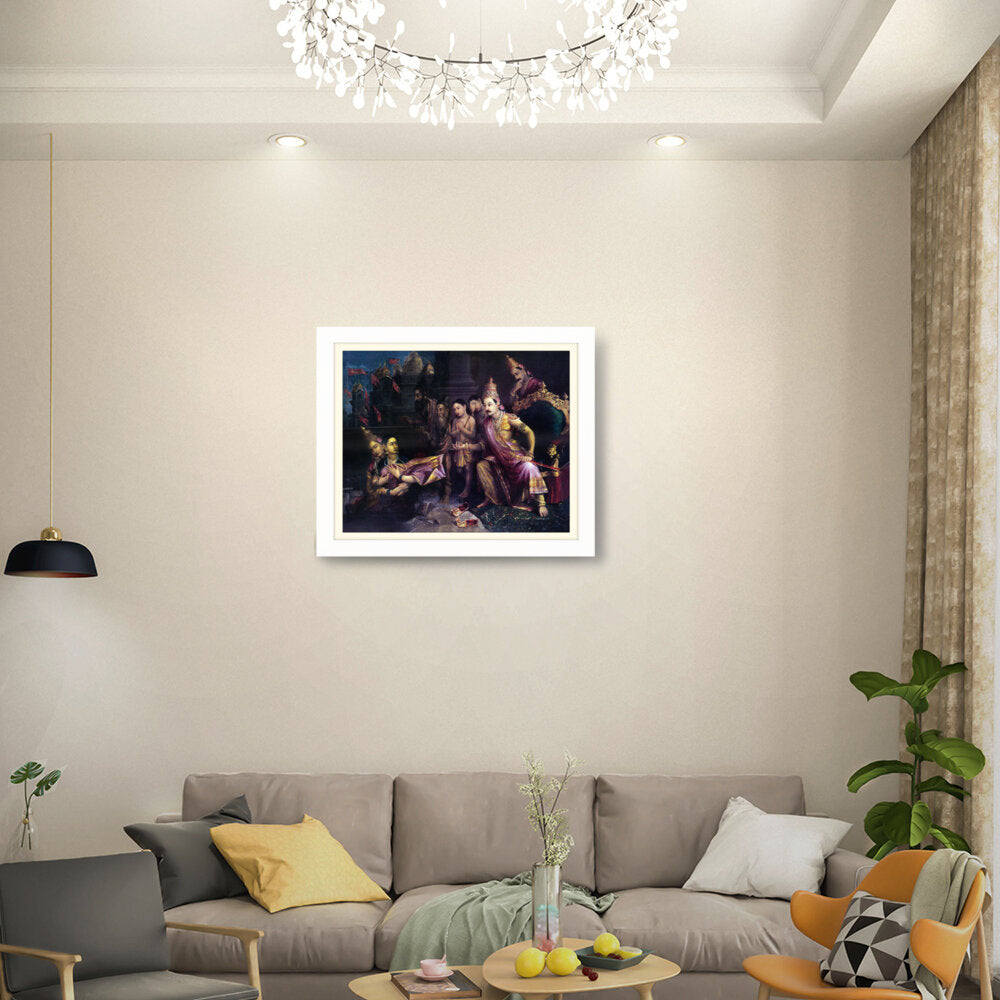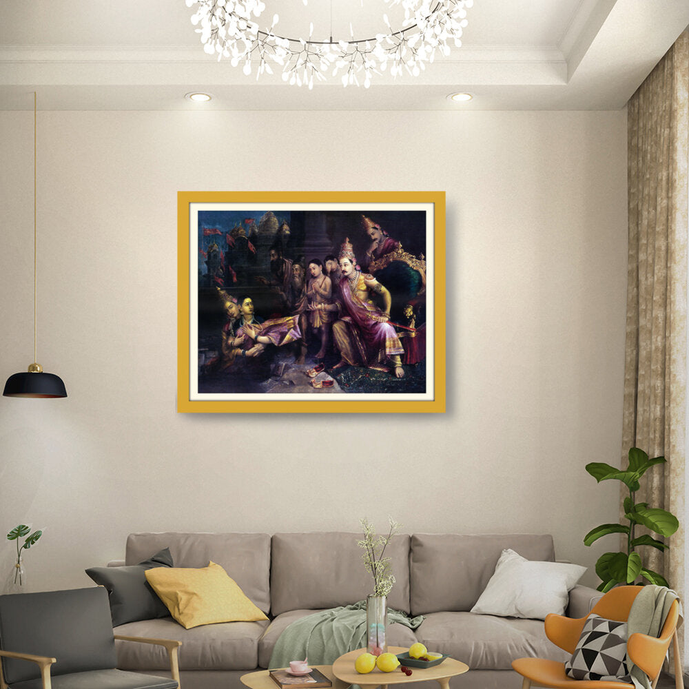 This artwork depicts a divine council scene with intricate detailing and vibrant colors, showcasing the pivotal moments from Indian mythology. The artist captures the expressions and emotions of the figures, bringing the narrative to life.