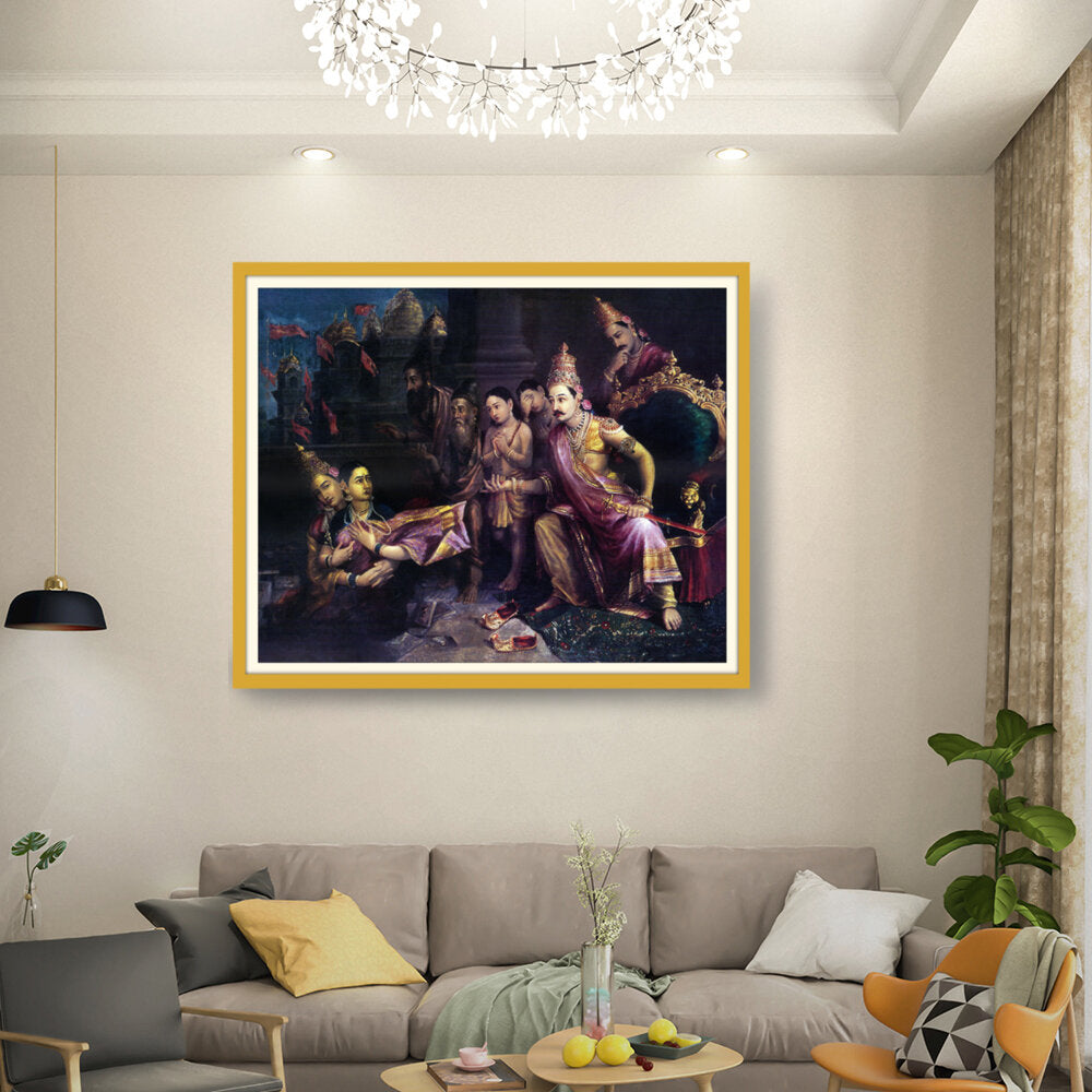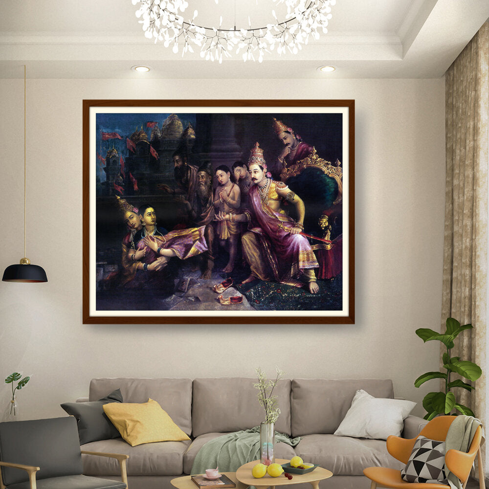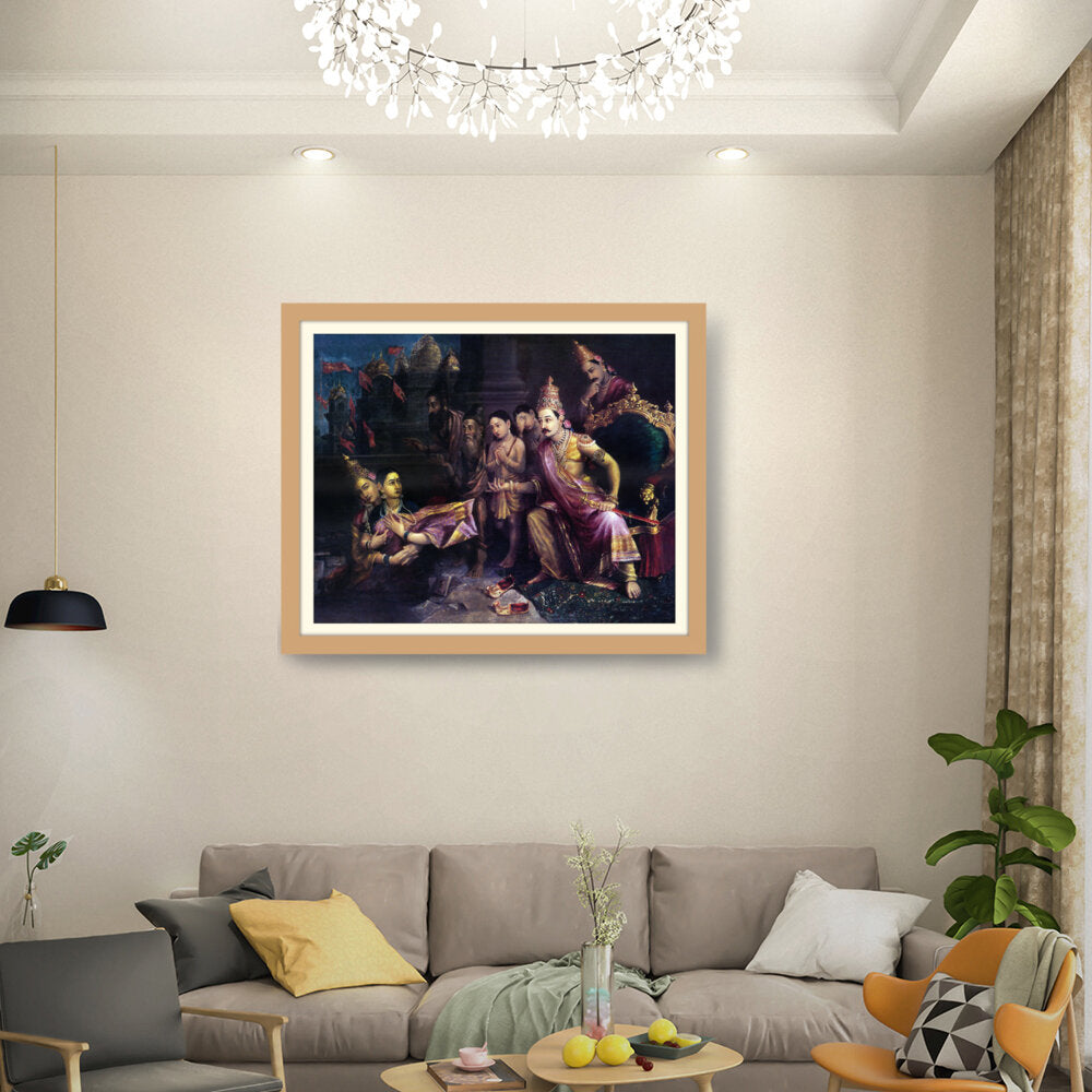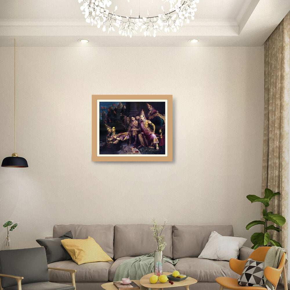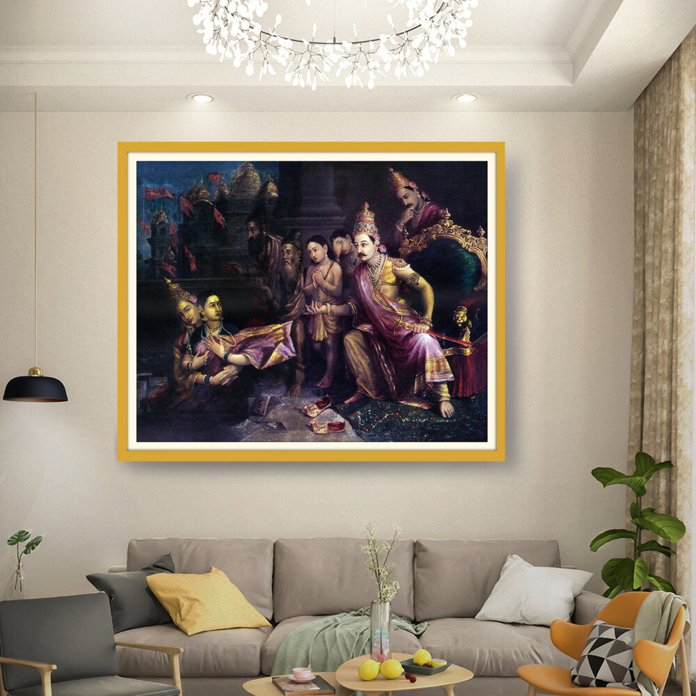 This artwork depicts a divine council scene with intricate detailing and vibrant colors, showcasing the pivotal moments from Indian mythology. The artist captures the expressions and emotions of the figures, bringing the narrative to life.