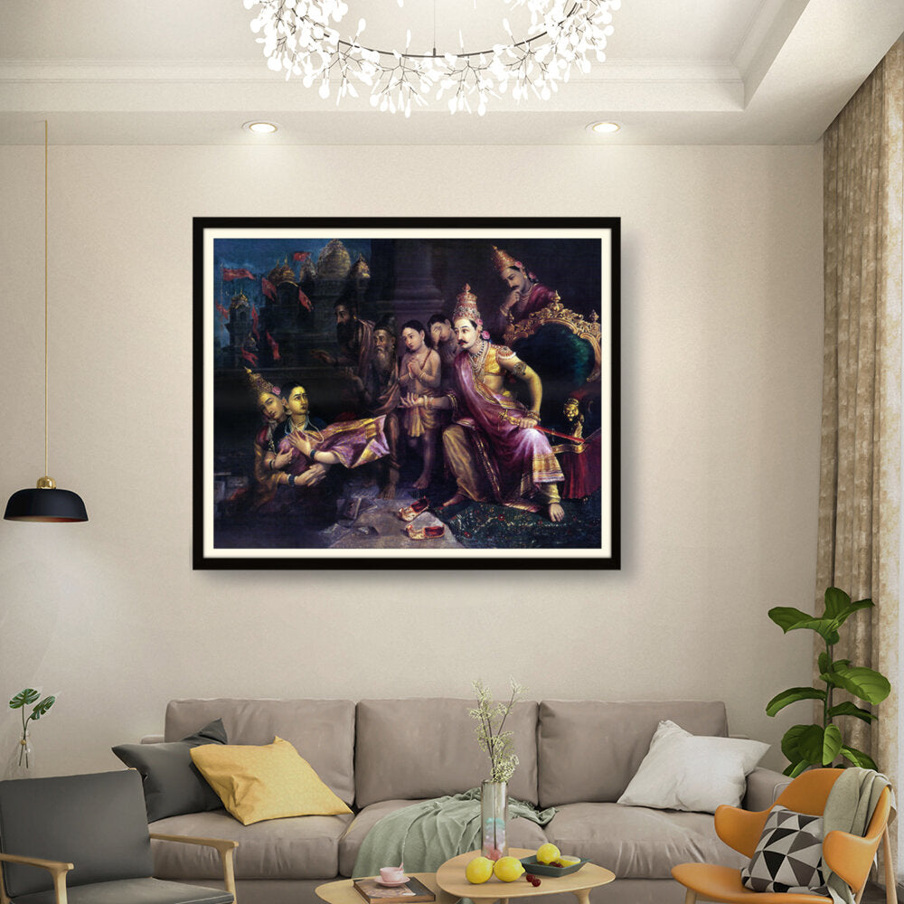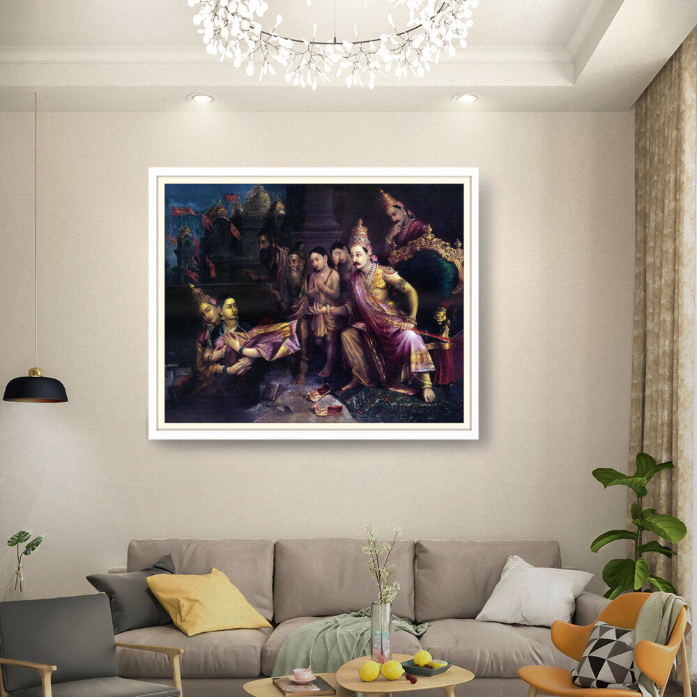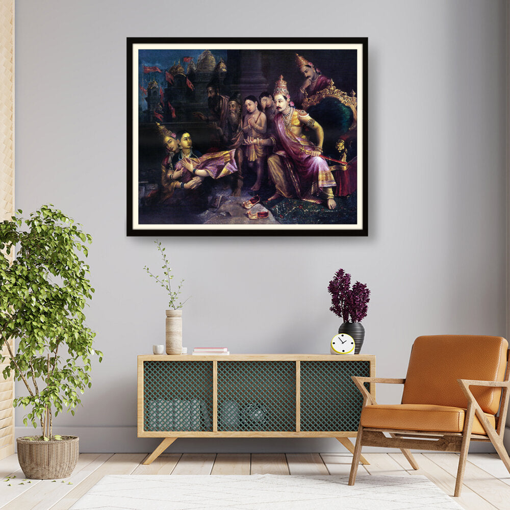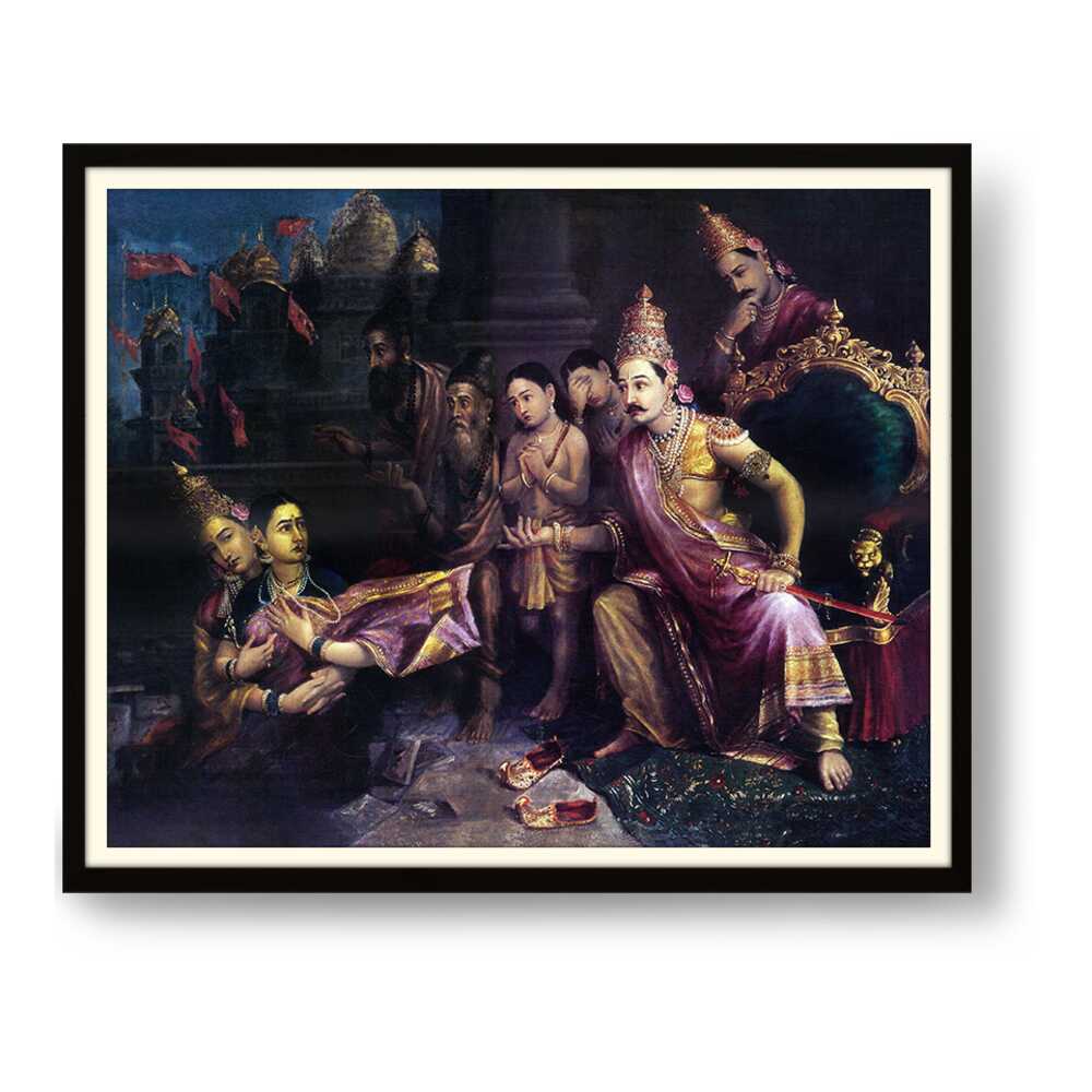 This artwork depicts a divine council scene with intricate detailing and vibrant colors, showcasing the pivotal moments from Indian mythology. The artist captures the expressions and emotions of the figures, bringing the narrative to life.