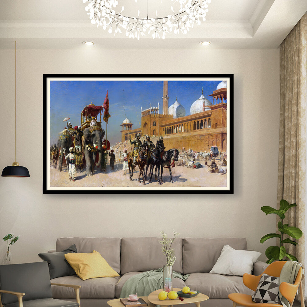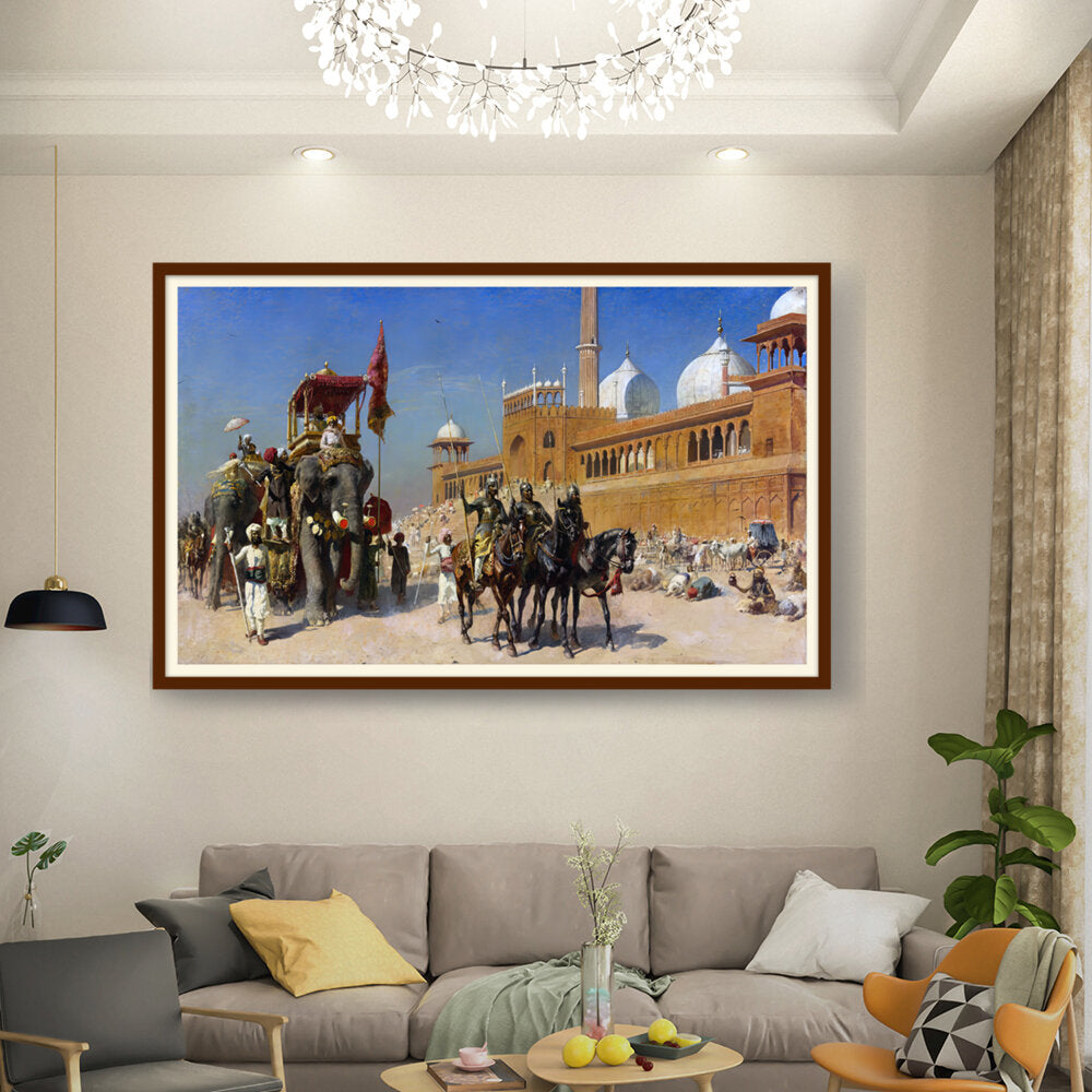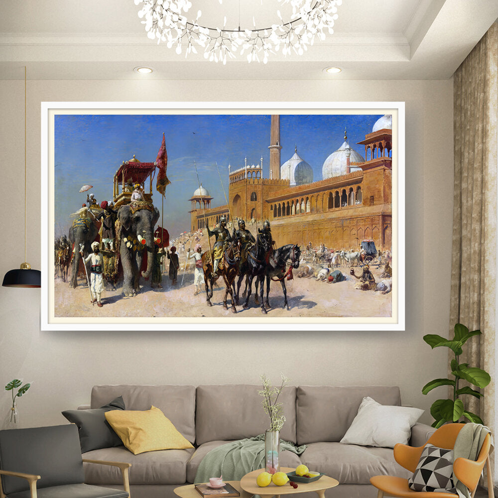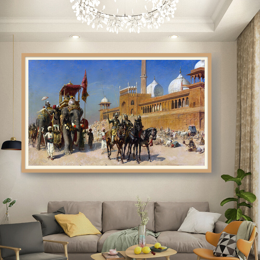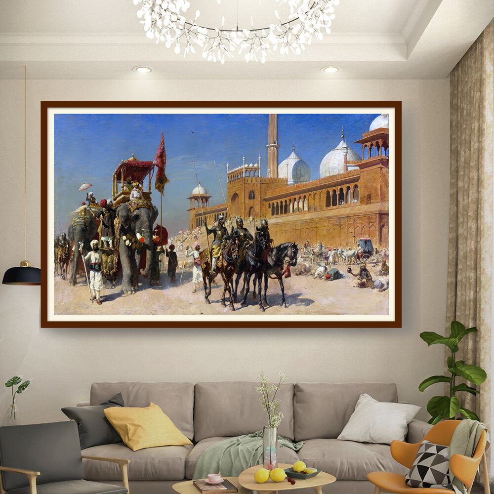 This stunning oil painting captures a grand procession featuring intricately adorned elephants, mounted warriors, and spectators. Set against a backdrop of majestic architecture, it vividly portrays the cultural richness of India. Perfect for adding a touch of history and vibrancy to your space.