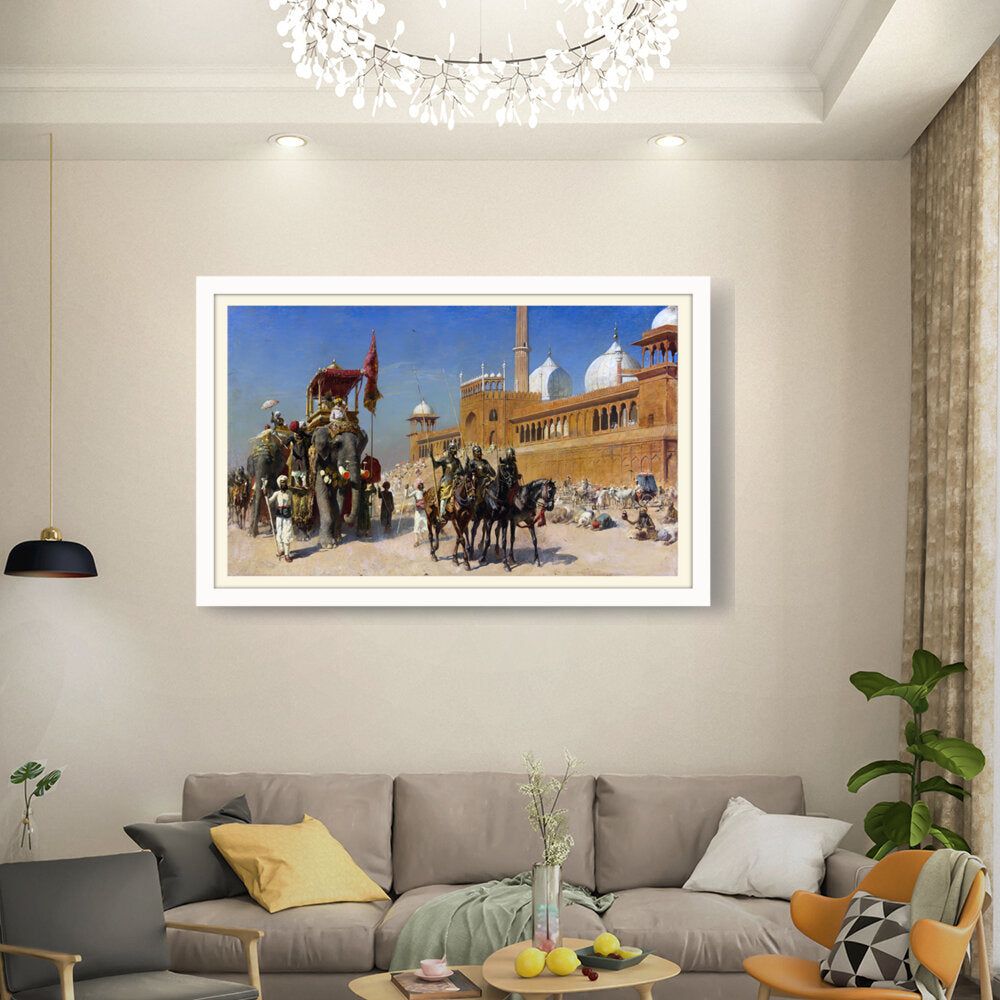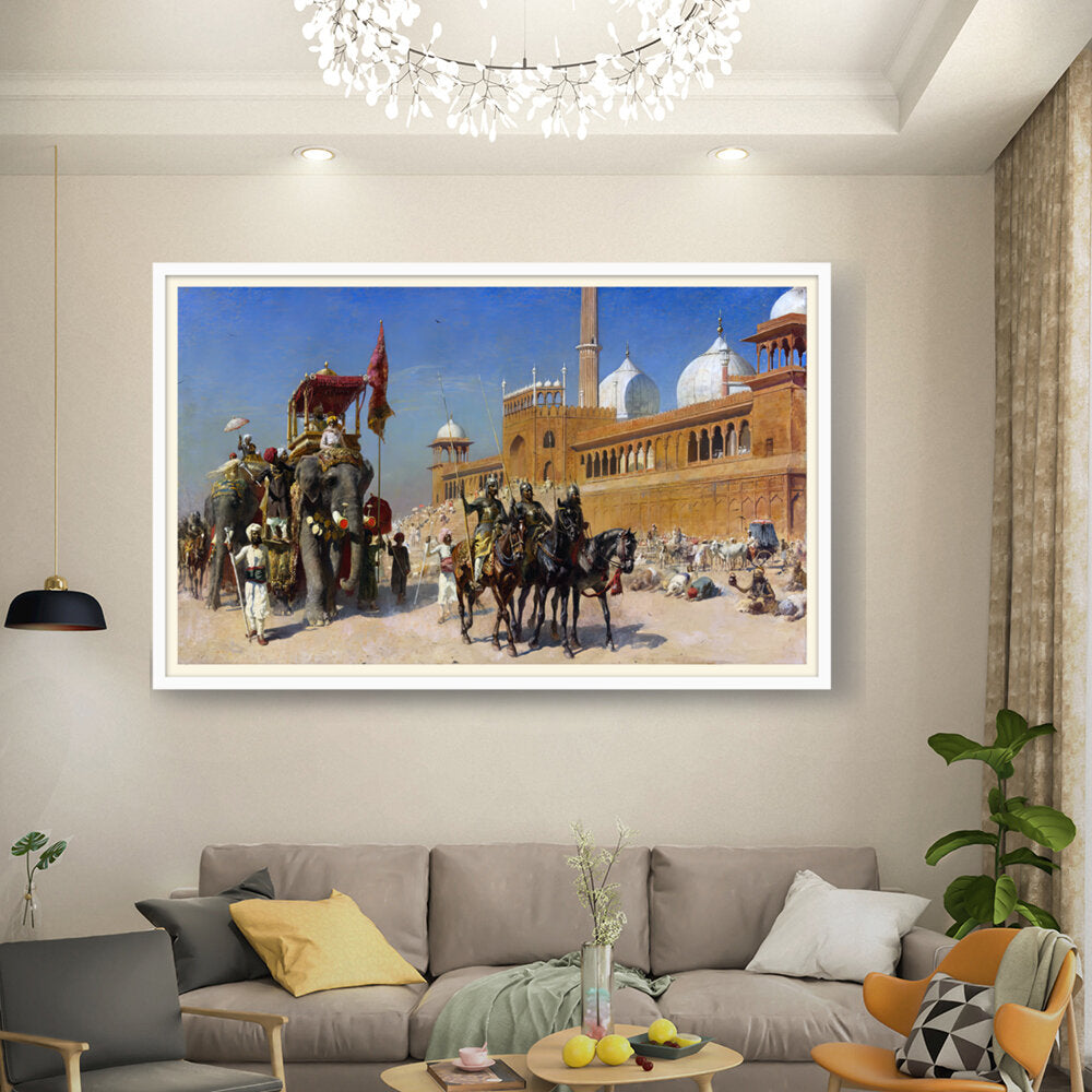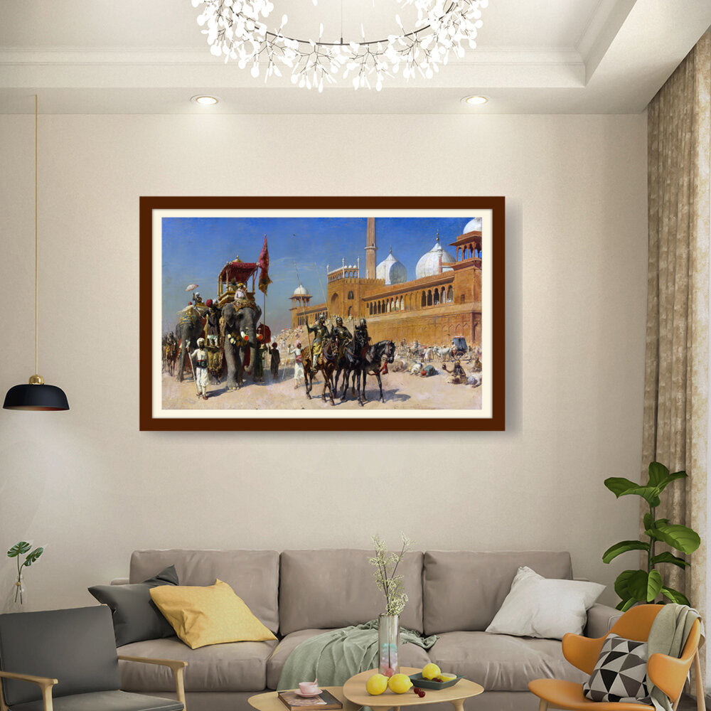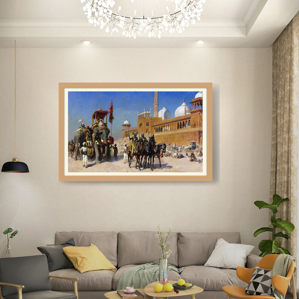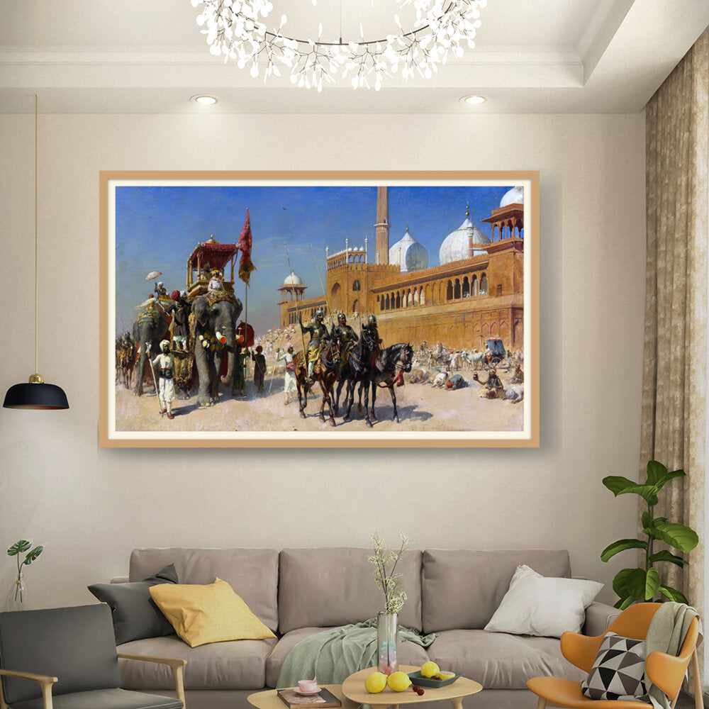 This stunning oil painting captures a grand procession featuring intricately adorned elephants, mounted warriors, and spectators. Set against a backdrop of majestic architecture, it vividly portrays the cultural richness of India. Perfect for adding a touch of history and vibrancy to your space.