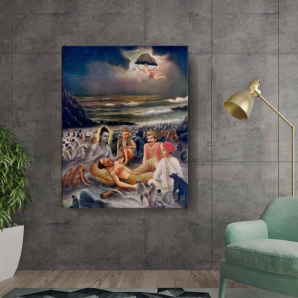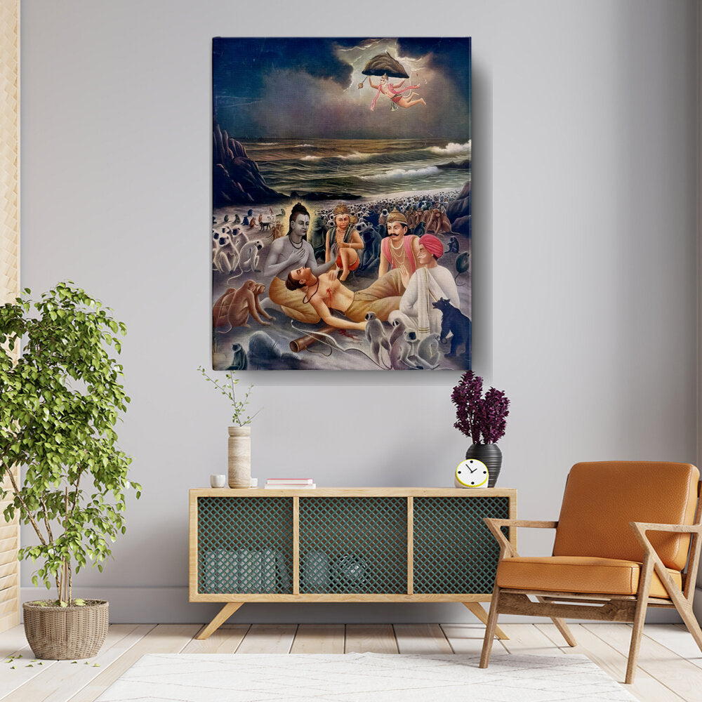 This exquisite artwork depicts a divine healing scene, rich in cultural symbolism and traditional Indian artistry. The vibrant colors and intricate details capture the essence of folklore and mythology, making it a perfect centerpiece for any living space.