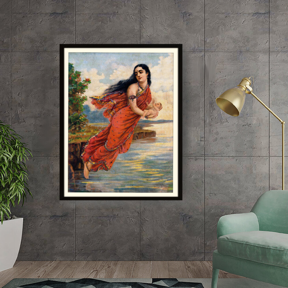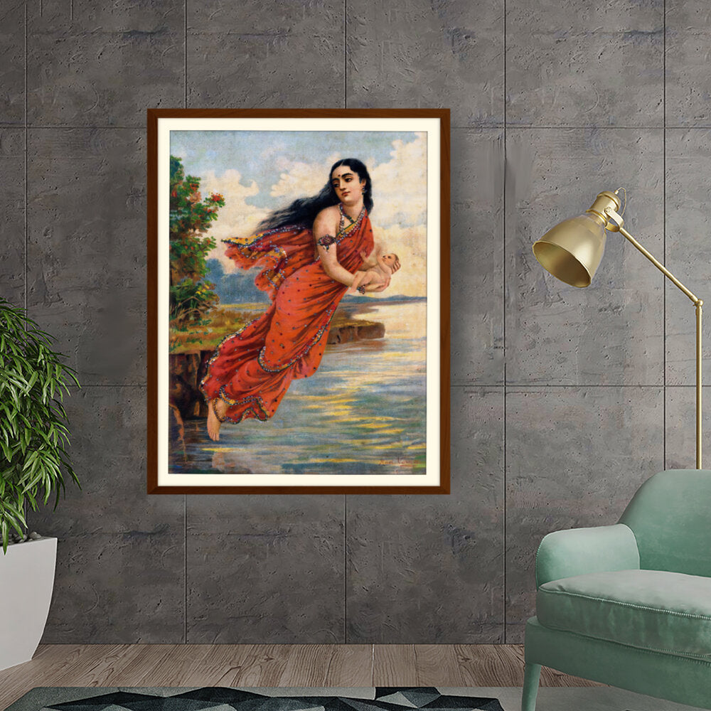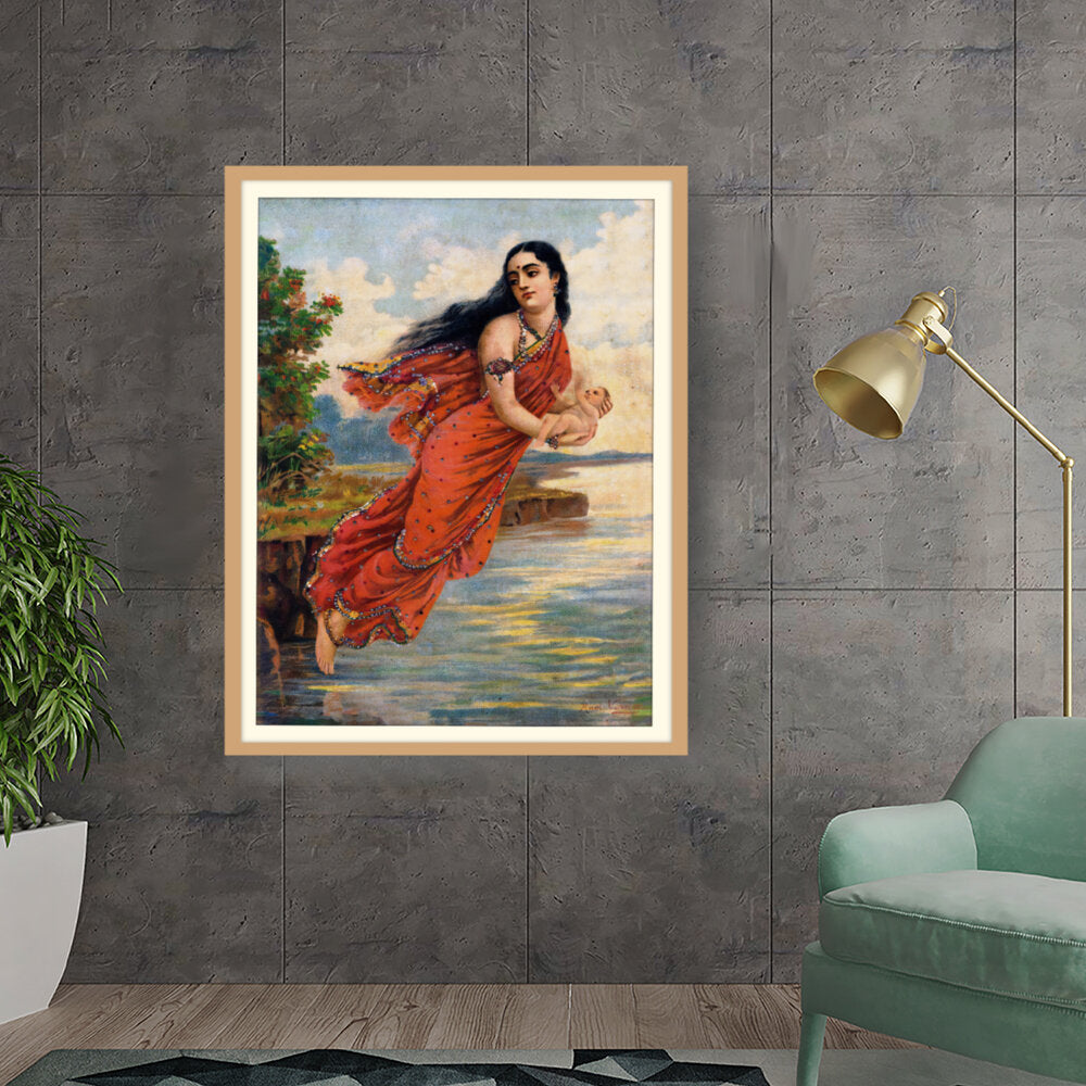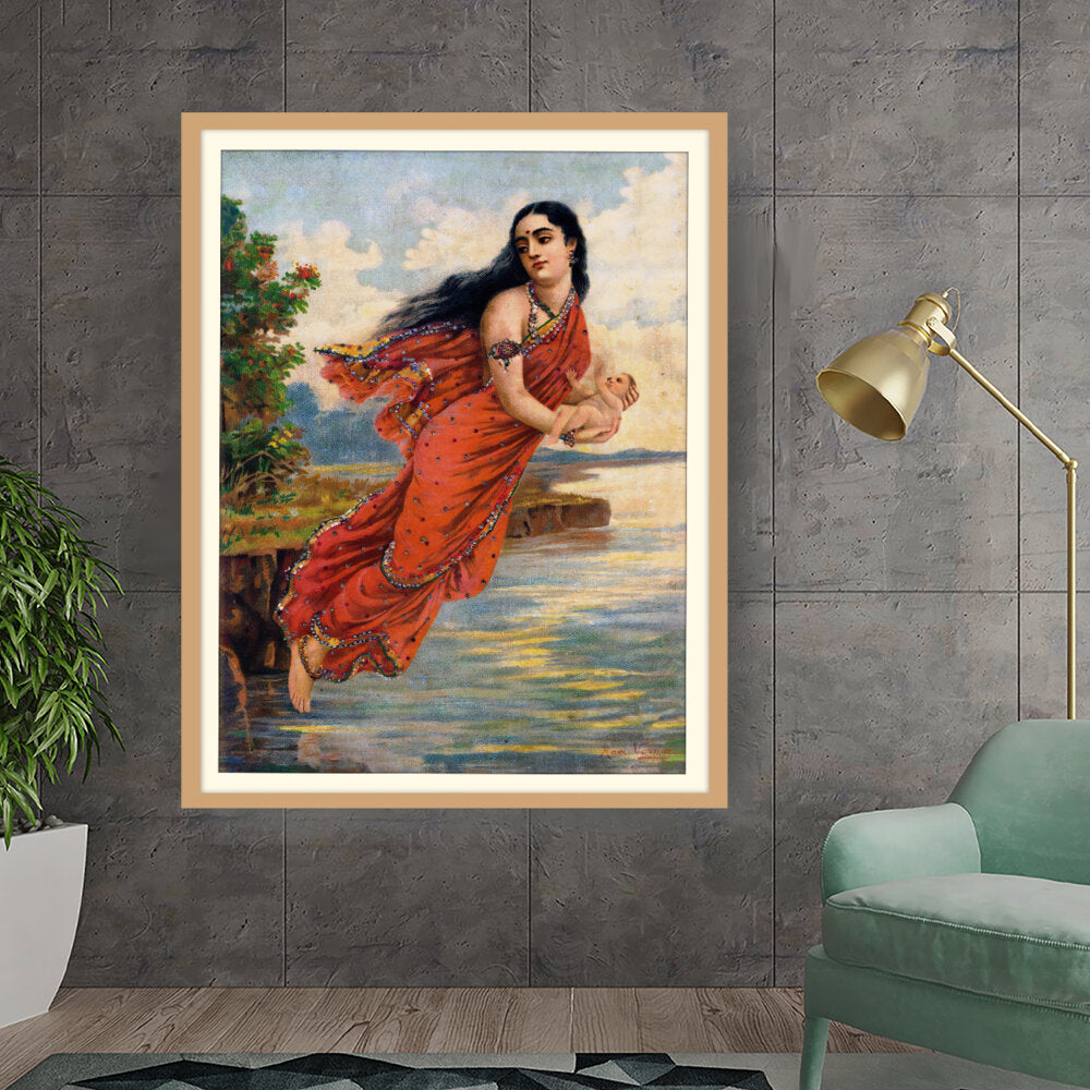 This exquisite artwork captures the essence of maternal love, featuring a woman in a vibrant red sari cradling an infant by the riverside. The enchanting backdrop enhances the emotional depth, making it a perfect statement piece for any art lover.