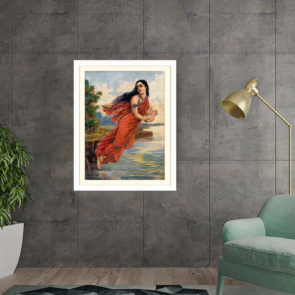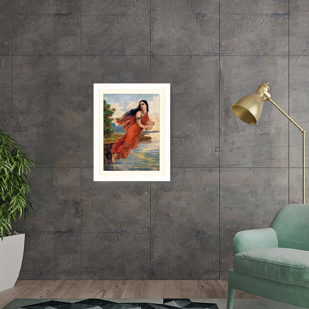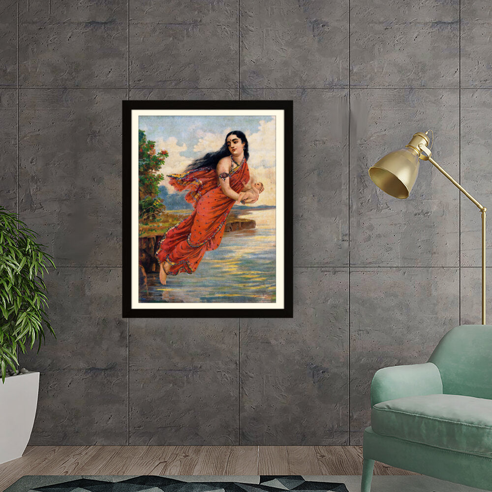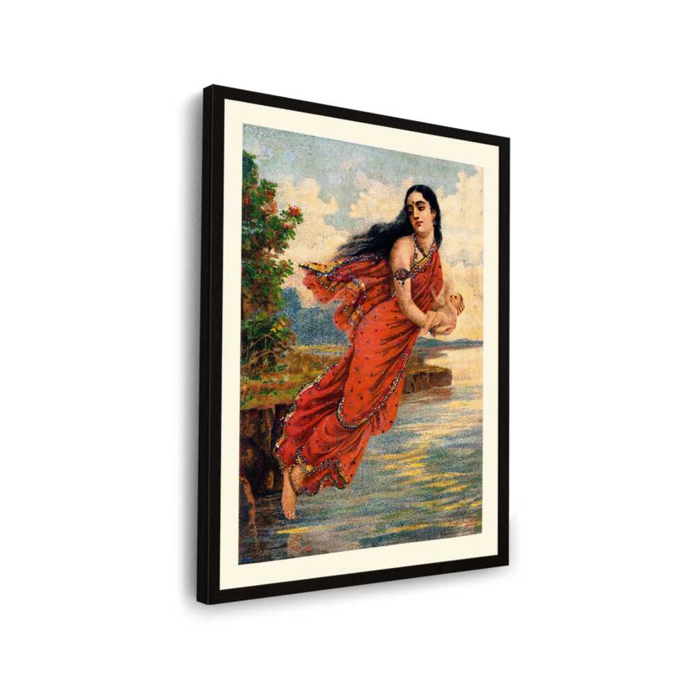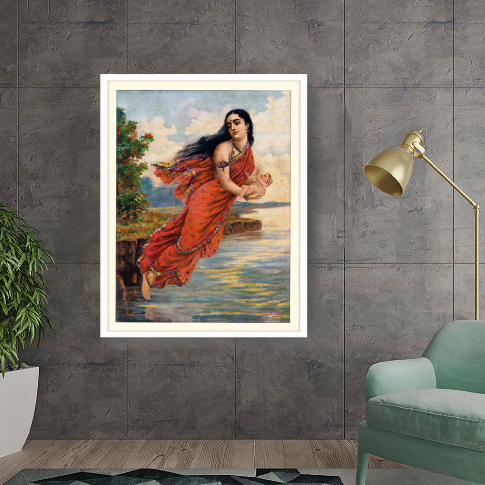 This exquisite artwork captures the essence of maternal love, featuring a woman in a vibrant red sari cradling an infant by the riverside. The enchanting backdrop enhances the emotional depth, making it a perfect statement piece for any art lover.