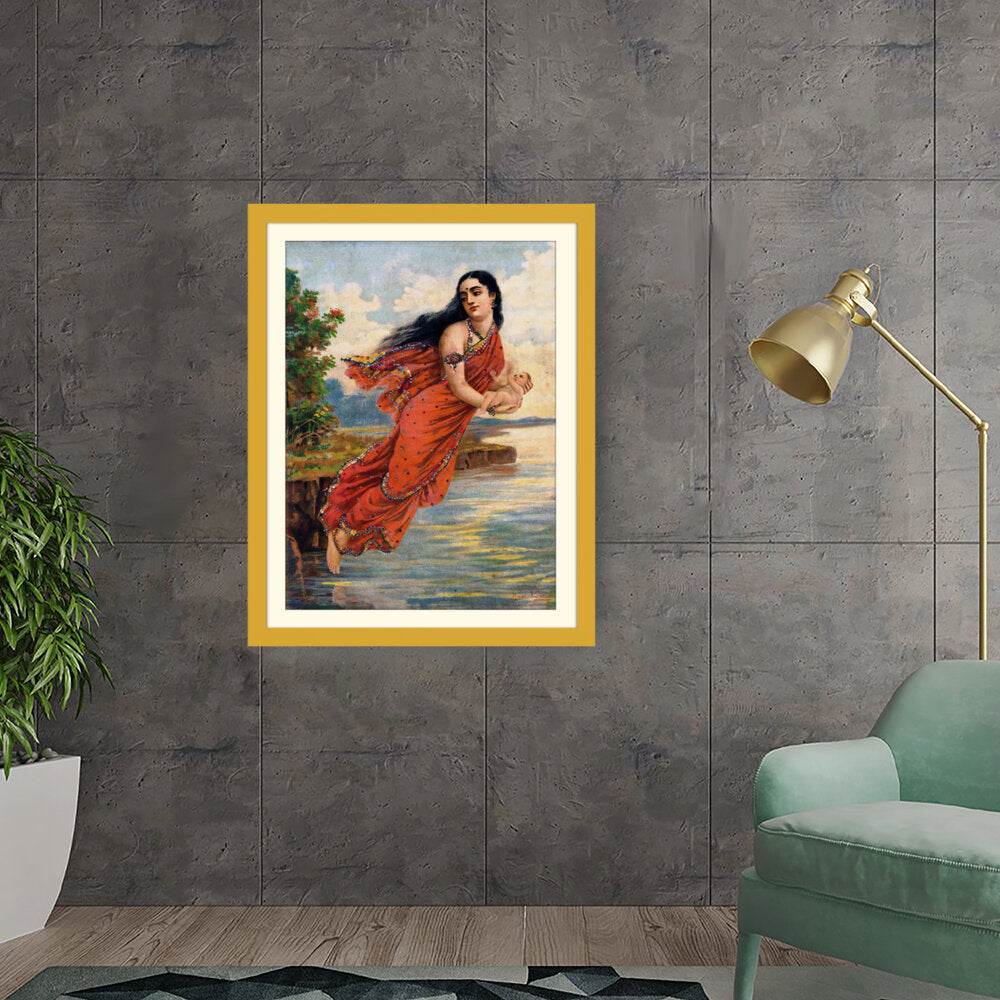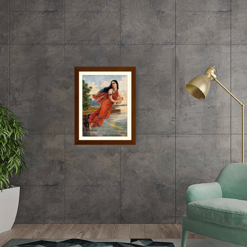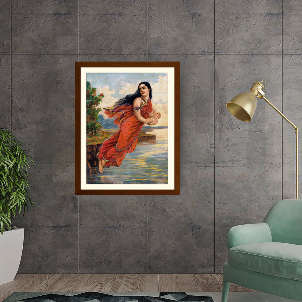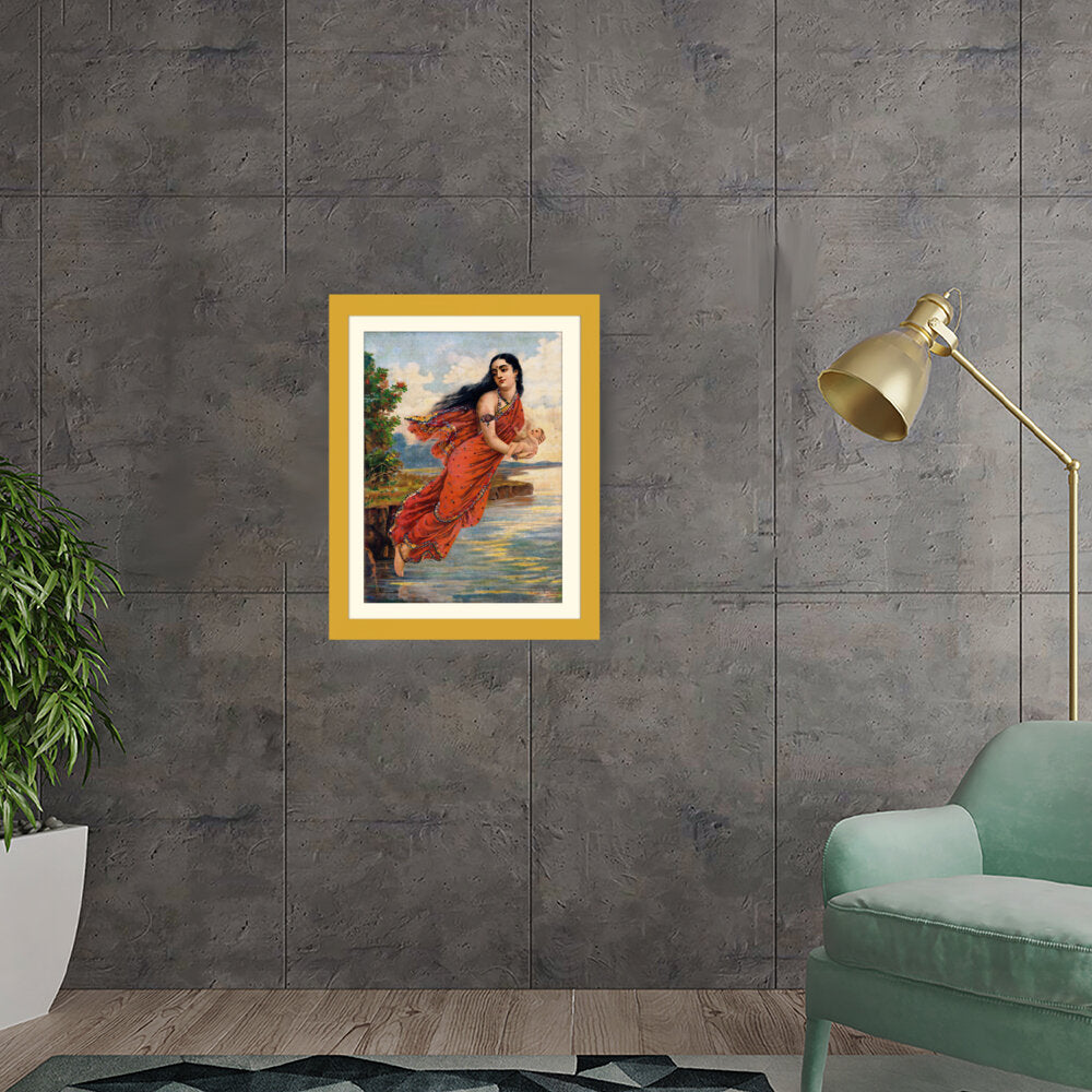 This exquisite artwork captures the essence of maternal love, featuring a woman in a vibrant red sari cradling an infant by the riverside. The enchanting backdrop enhances the emotional depth, making it a perfect statement piece for any art lover.