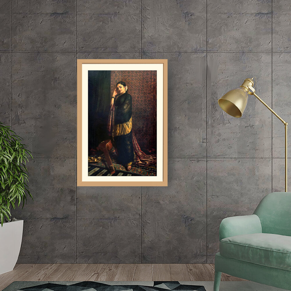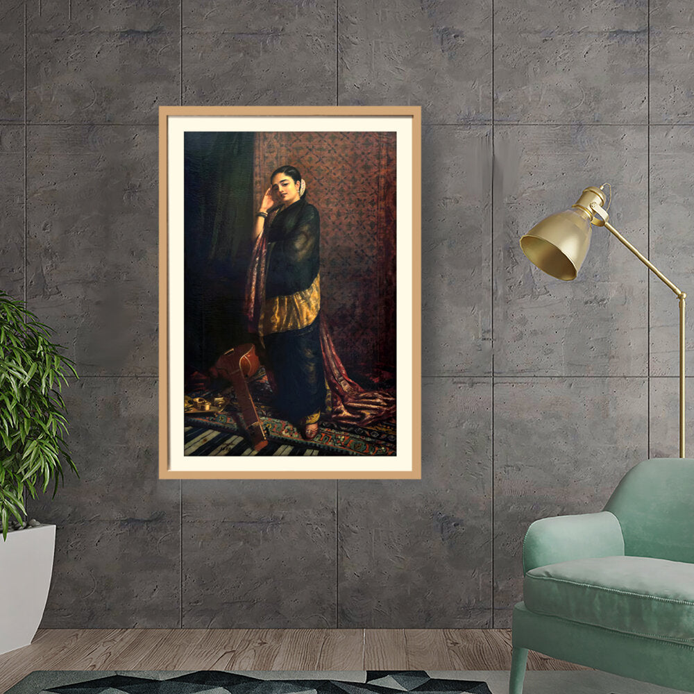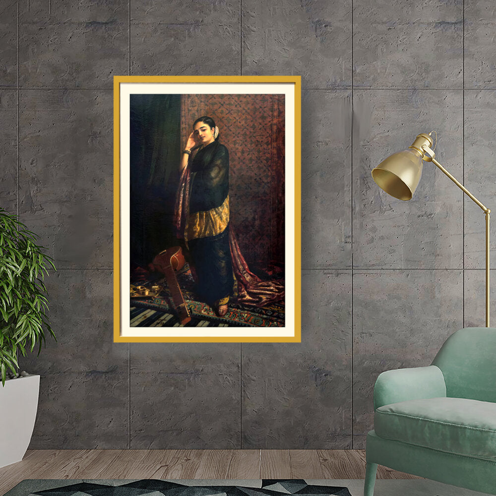 This exquisite oil painting captures a serene moment of a young woman adorned in traditional attire, reminiscent of Indian cultural heritage. Holding a musical instrument, the artwork evokes a sense of melody and grace, making it a perfect addition to any elegant living space.