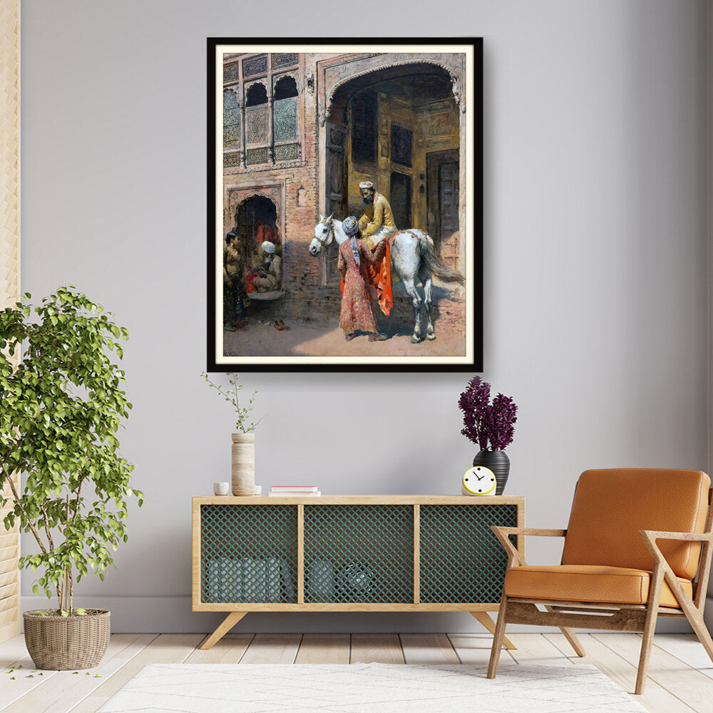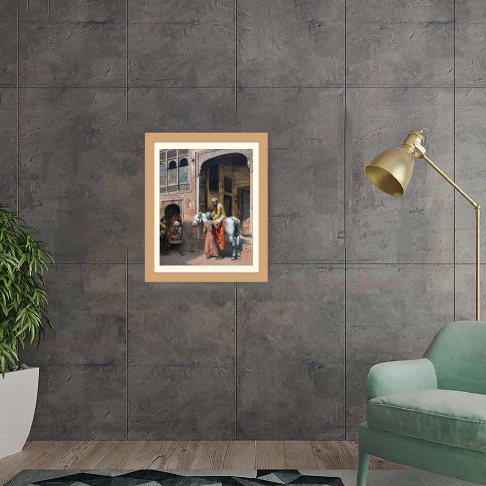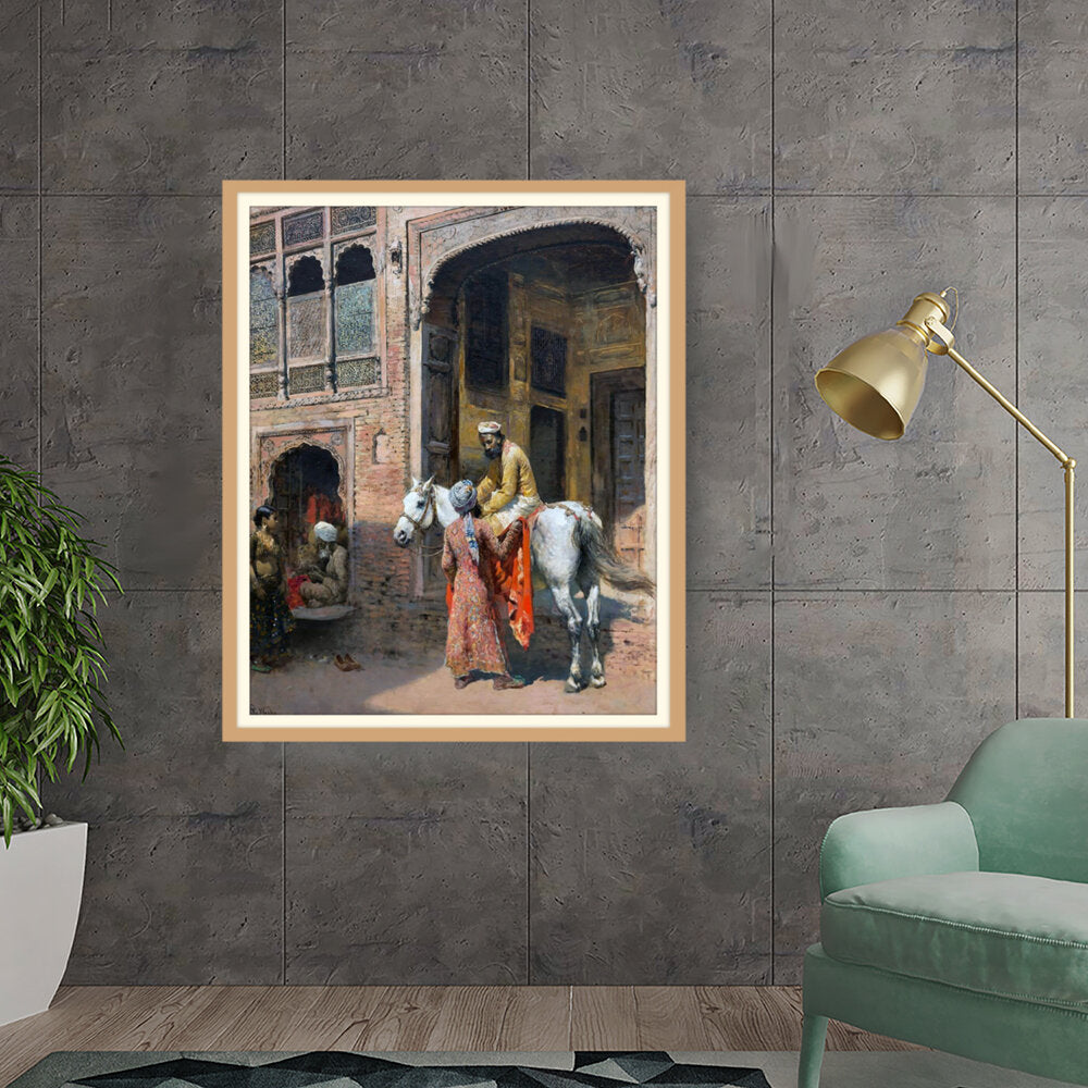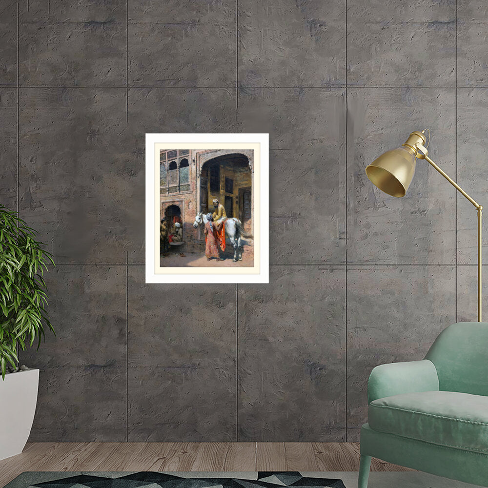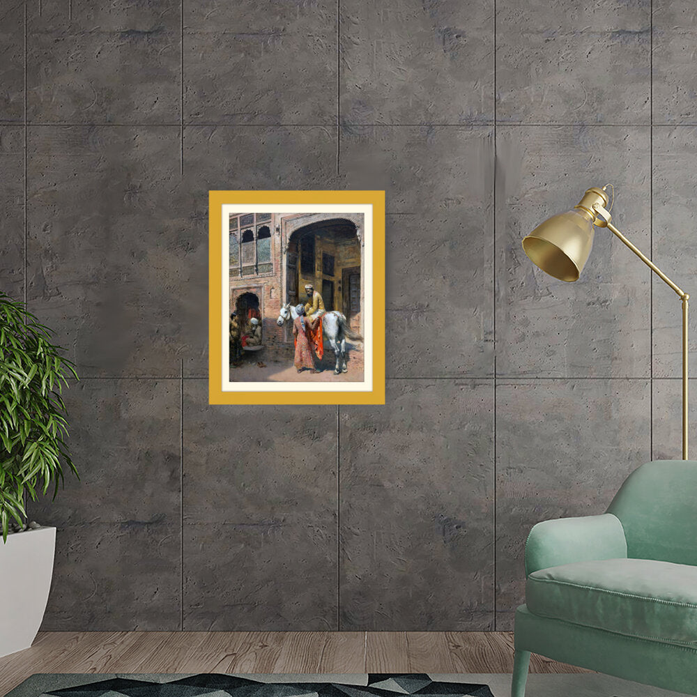 This captivating artwork depicts a regal interaction in a vibrant setting, showcasing India's rich cultural heritage. The intricate details and realistic portrayal invite viewers into a charming historical moment.