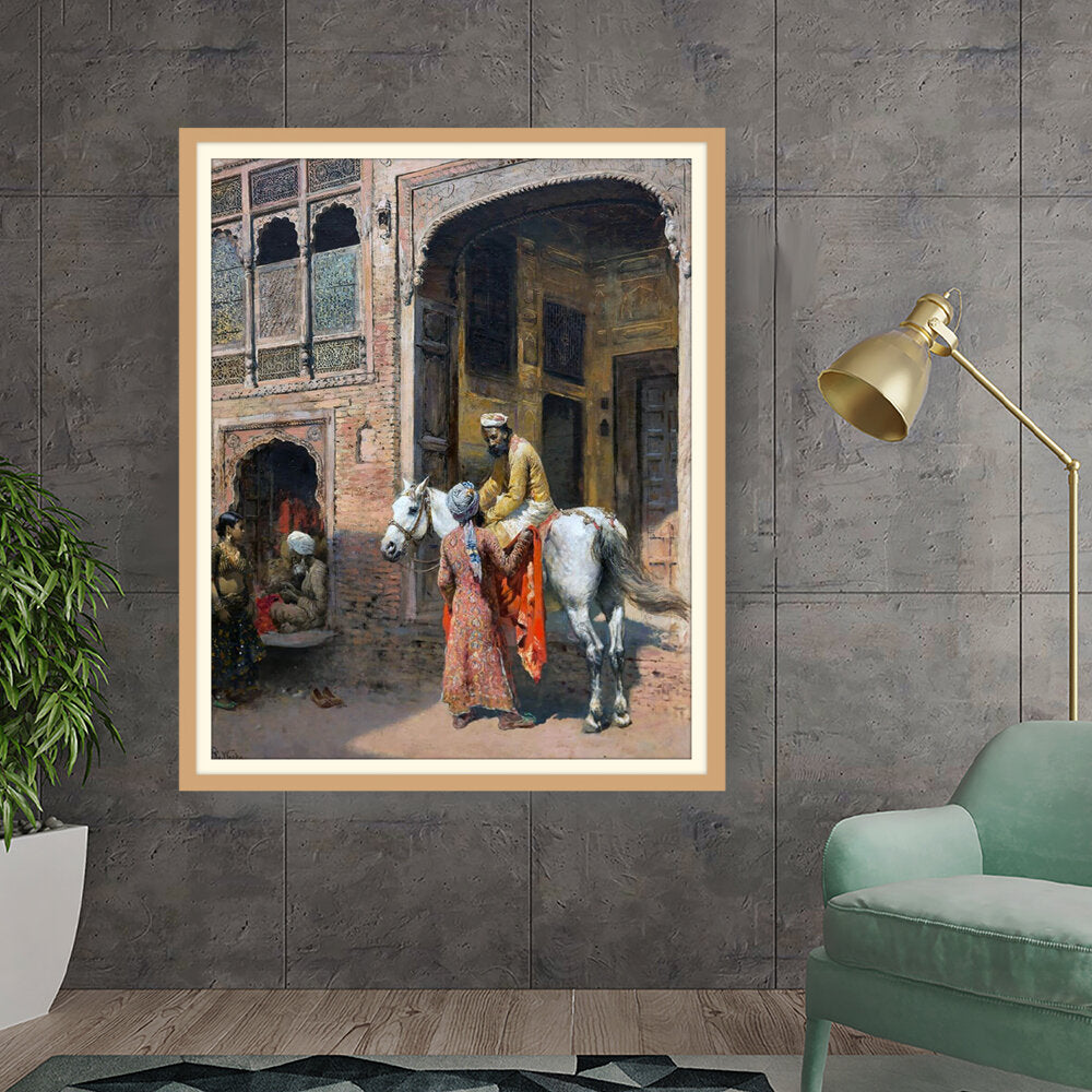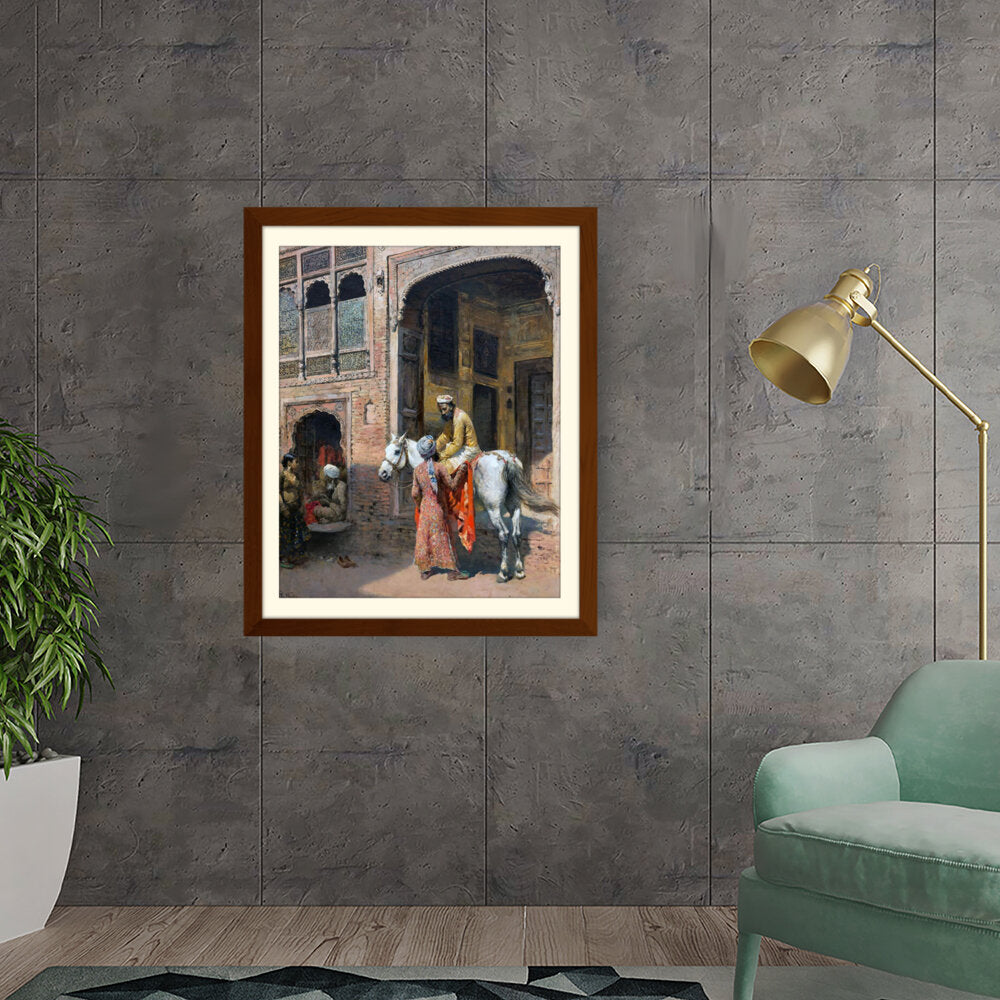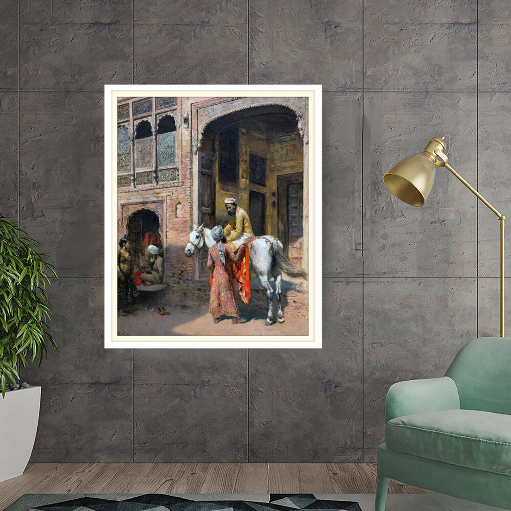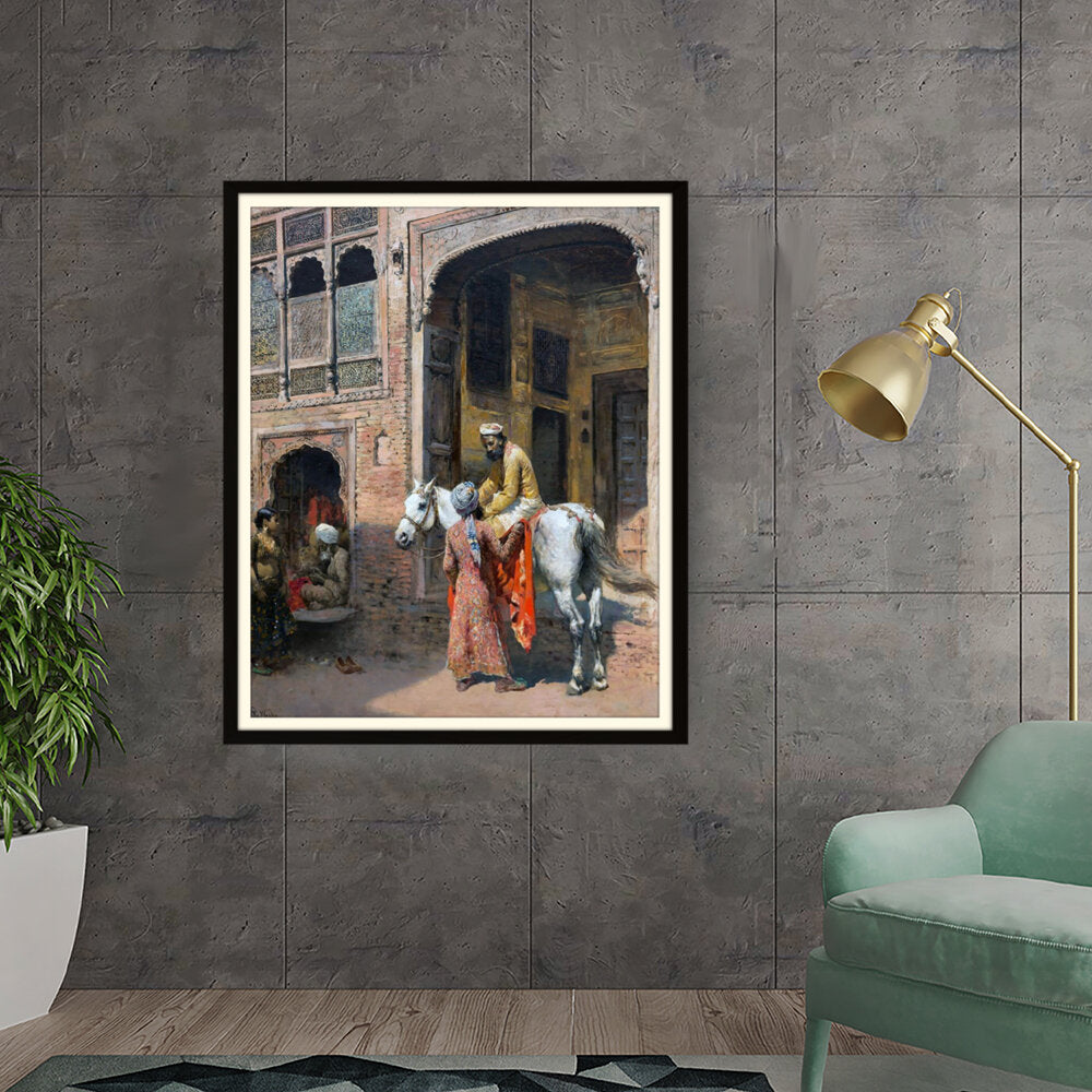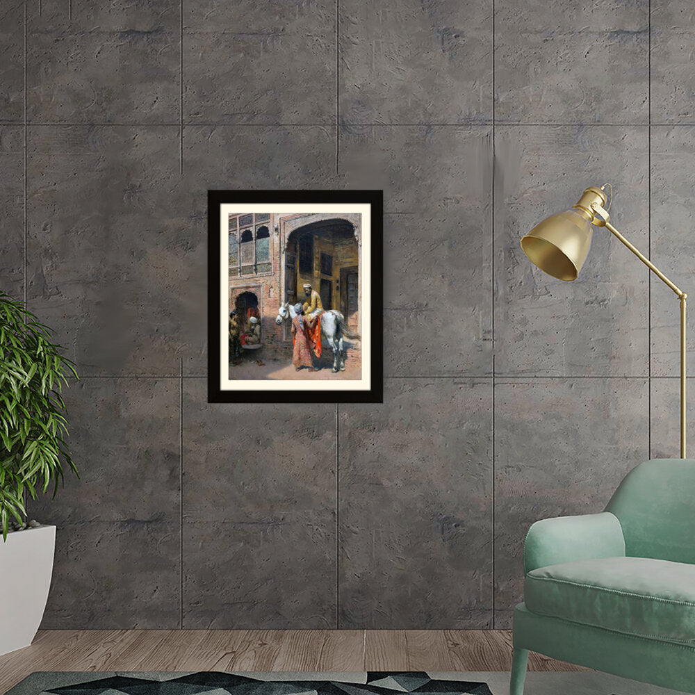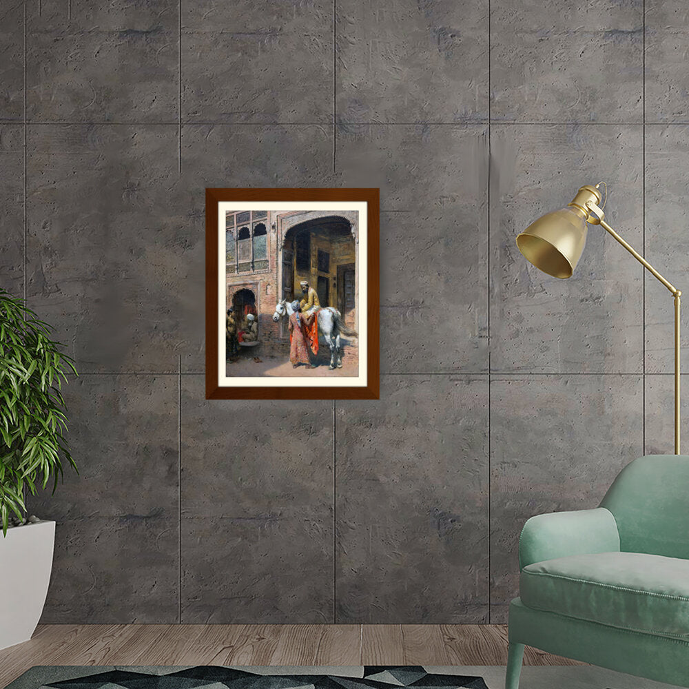 This captivating artwork depicts a regal interaction in a vibrant setting, showcasing India's rich cultural heritage. The intricate details and realistic portrayal invite viewers into a charming historical moment.