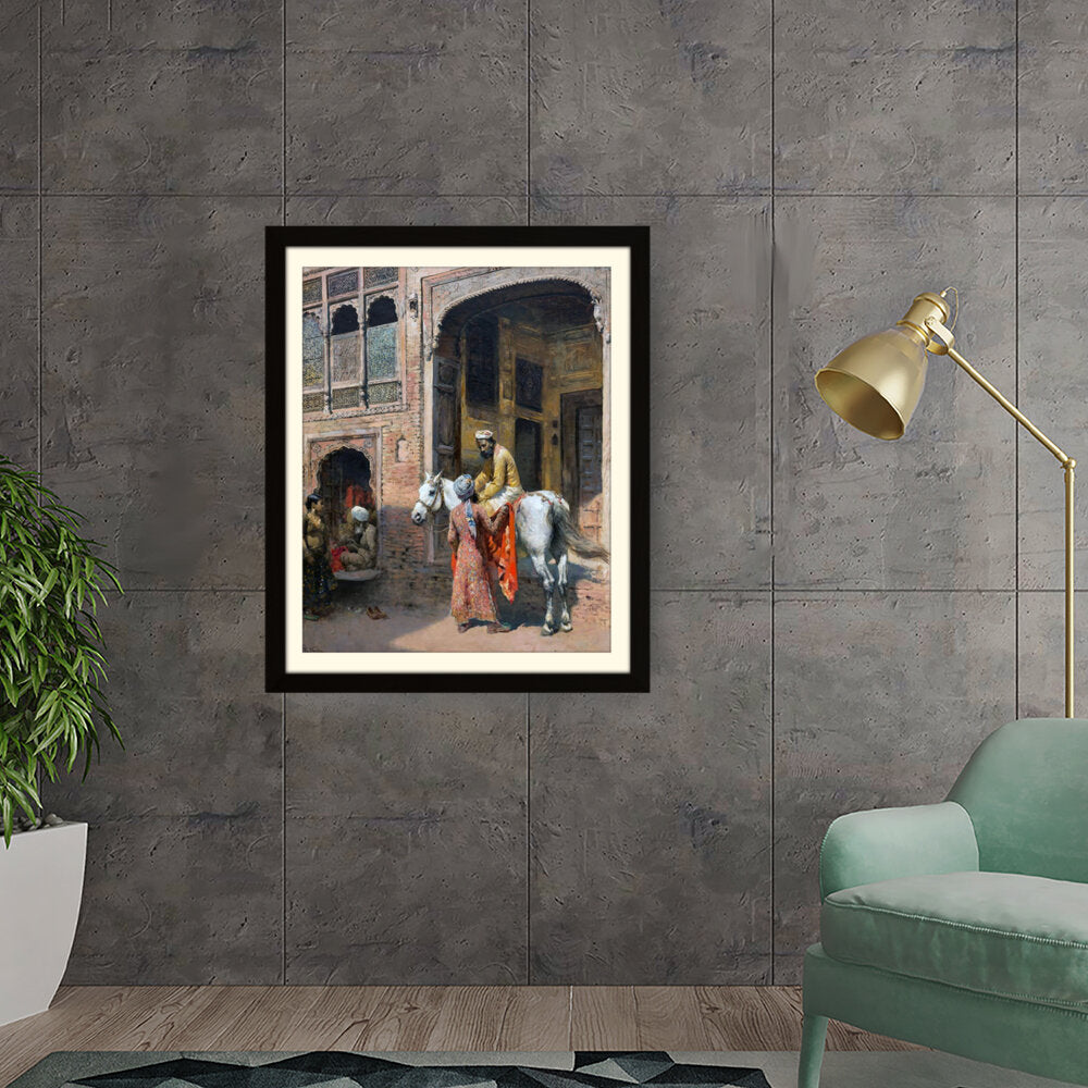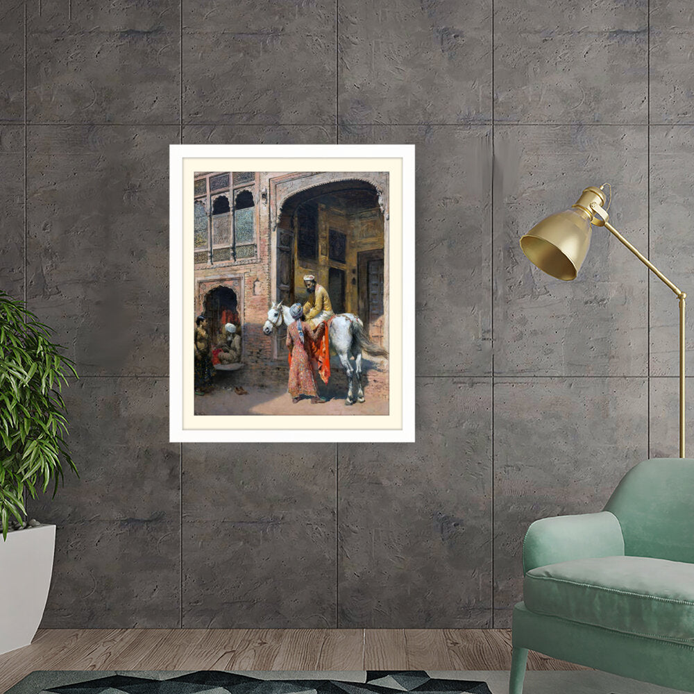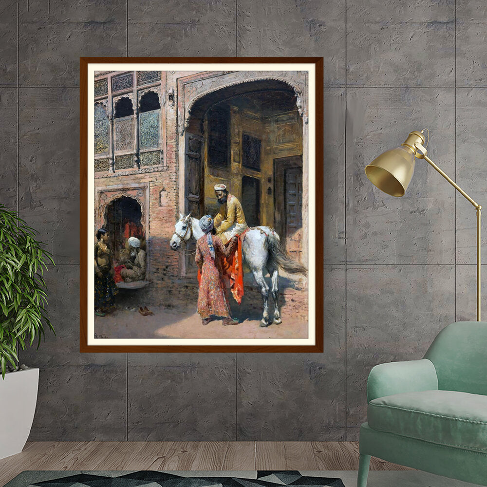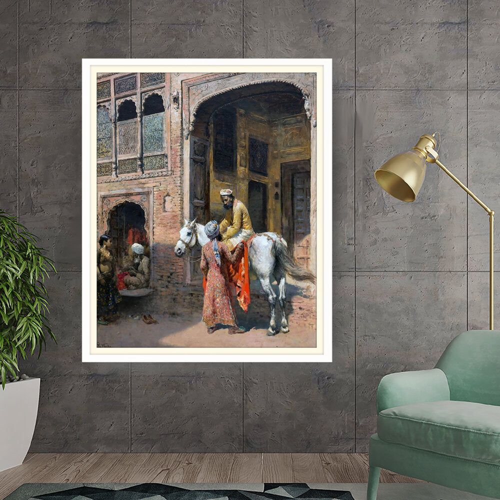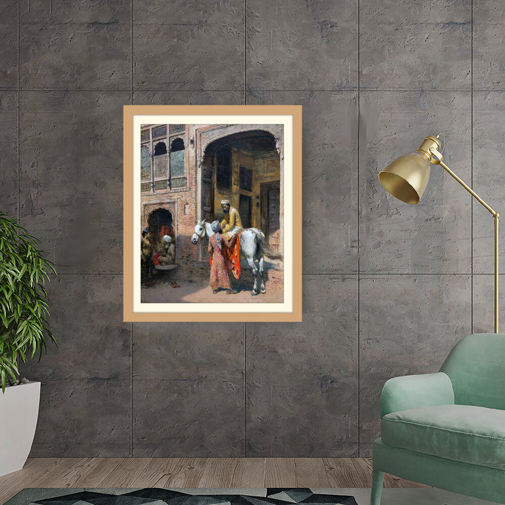 This captivating artwork depicts a regal interaction in a vibrant setting, showcasing India's rich cultural heritage. The intricate details and realistic portrayal invite viewers into a charming historical moment.