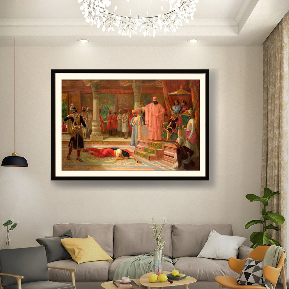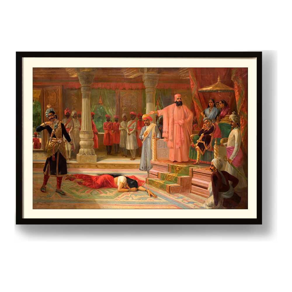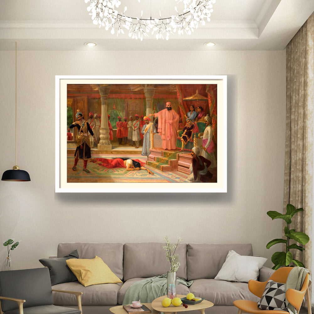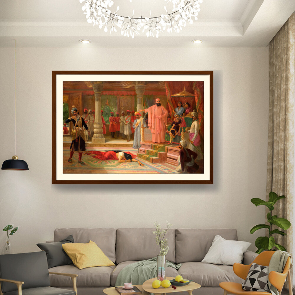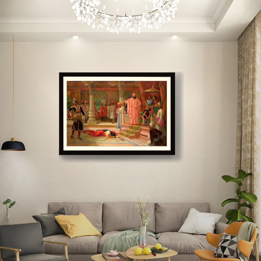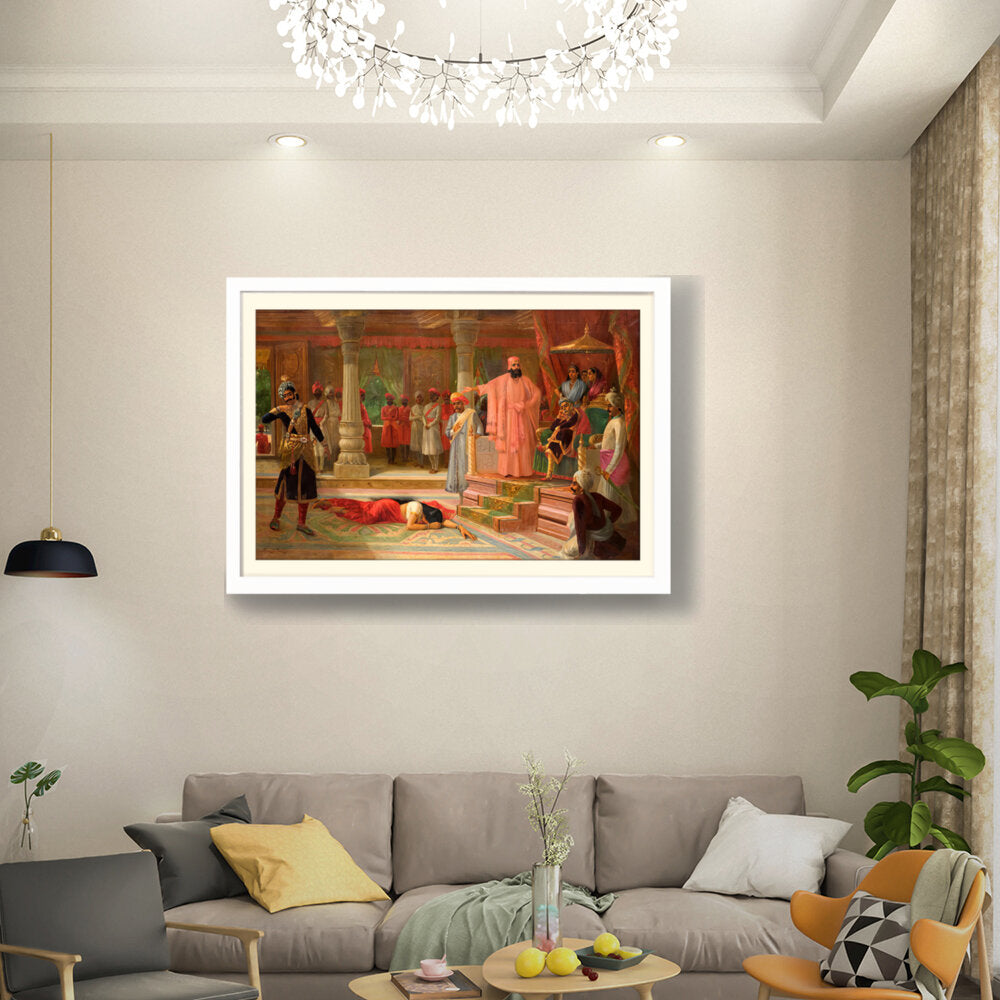This artwork portrays a dramatic scene set in a royal court, capturing intricate details of attire and expressions. The composition emphasizes the tension among the figures, making it a captivating piece for enthusiasts of historical art.