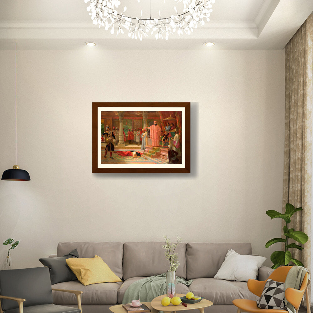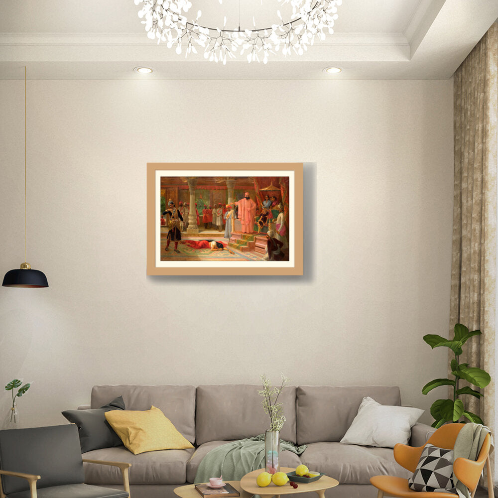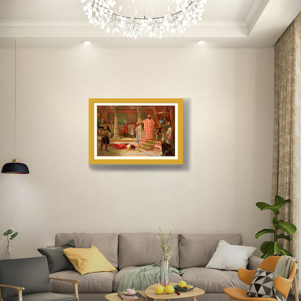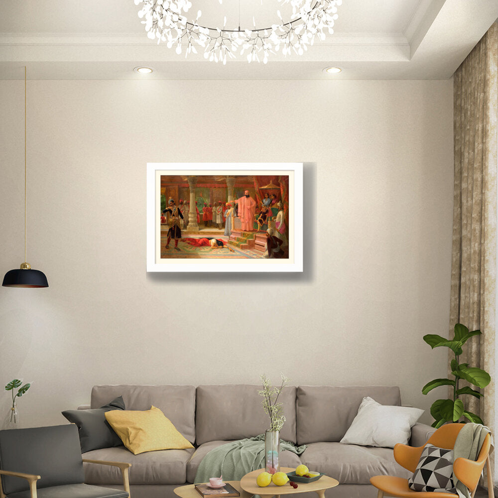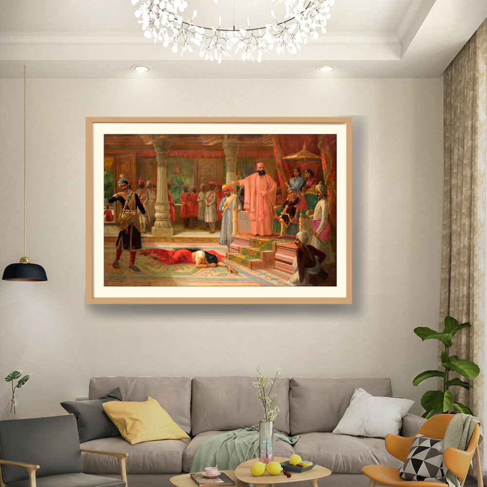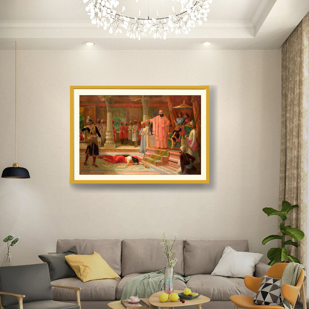 This artwork portrays a dramatic scene set in a royal court, capturing intricate details of attire and expressions. The composition emphasizes the tension among the figures, making it a captivating piece for enthusiasts of historical art.