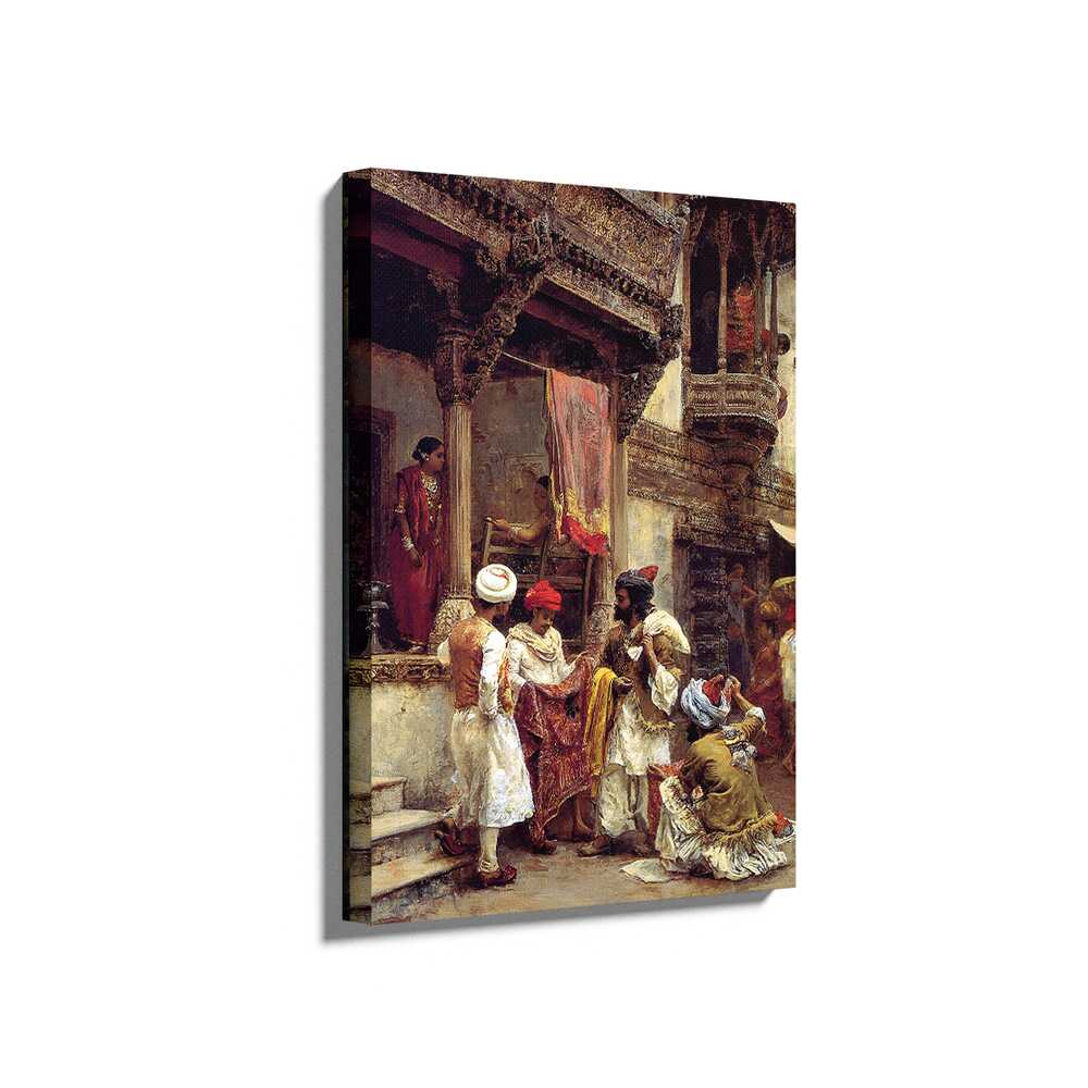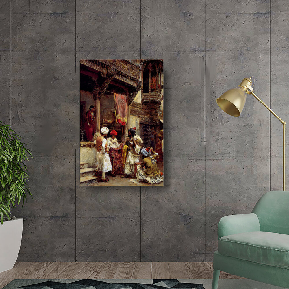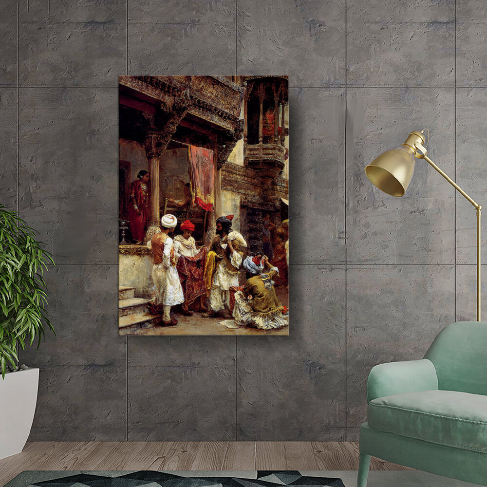 This exquisite oil painting, 'The Silk Merchants', captures a vibrant scene of traditional Indian silk merchants engaged in lively negotiation and exchange, showcasing the rich cultural heritage of India. The intricate details and lifelike expressions invite viewers to immerse themselves in the historical narrative depicted.