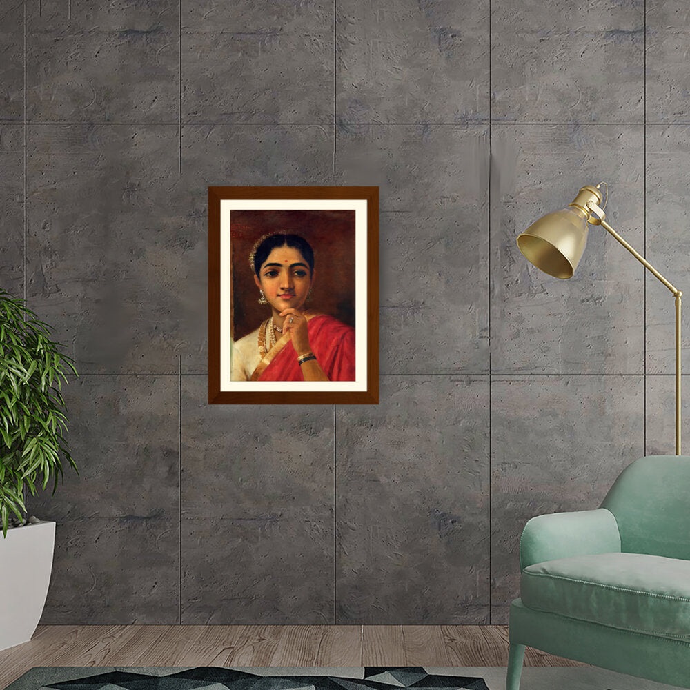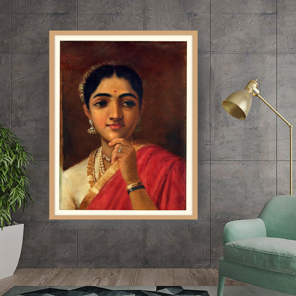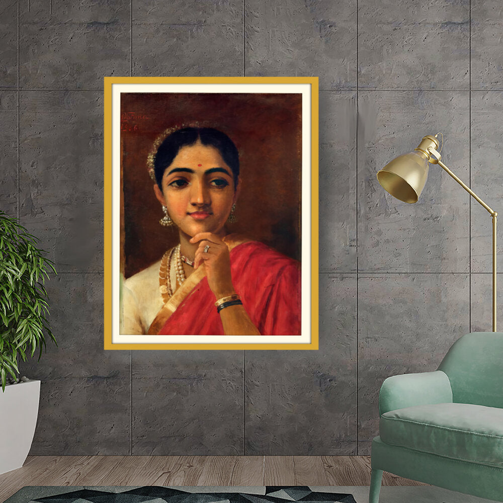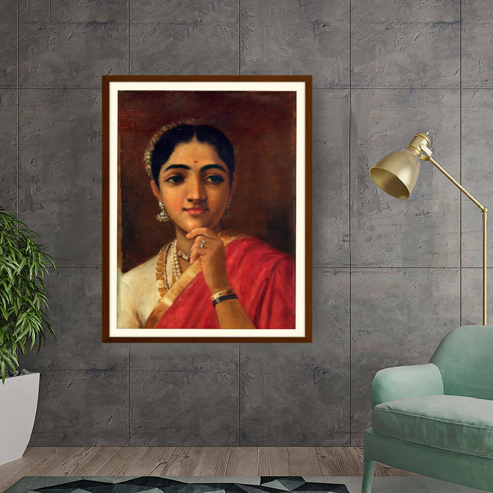 This captivating portrait showcases a woman adorned in traditional attire, embodying grace and thoughtfulness. The rich colors and intricate details draw the viewer into her serene expression, making it a timeless piece suitable for various room themes.