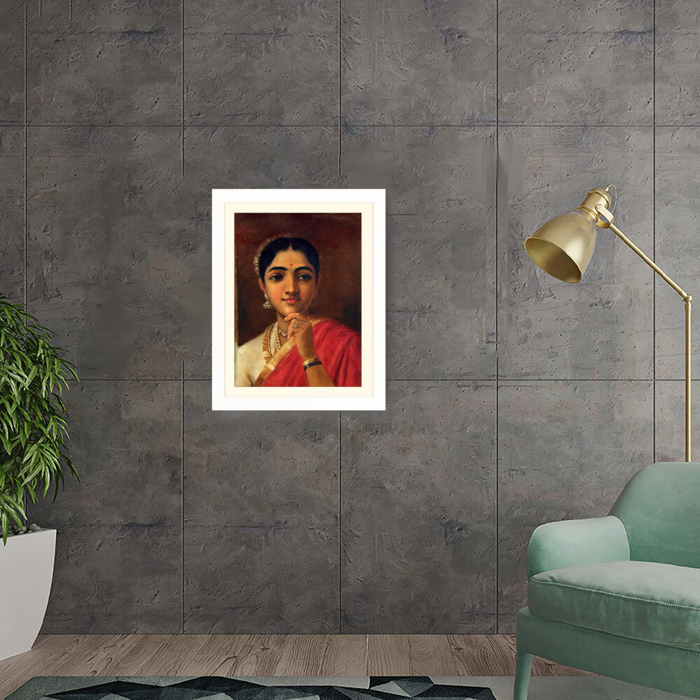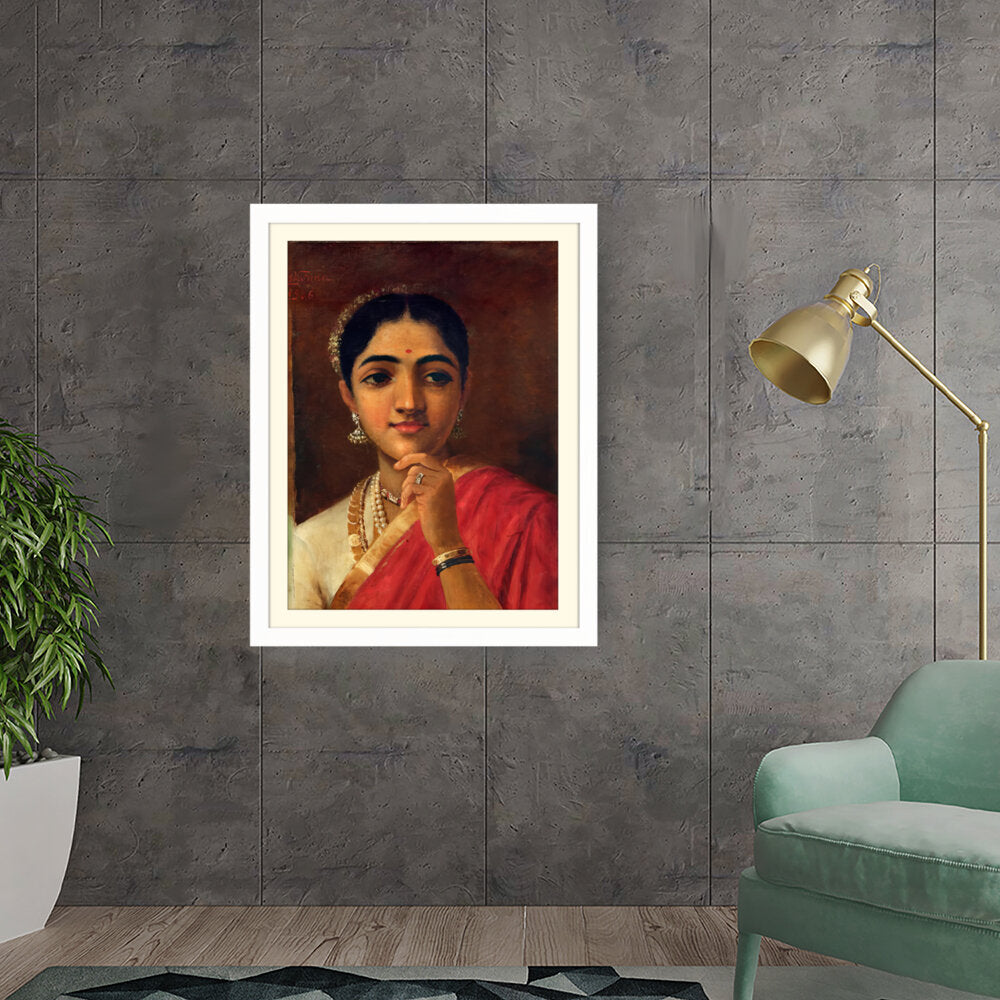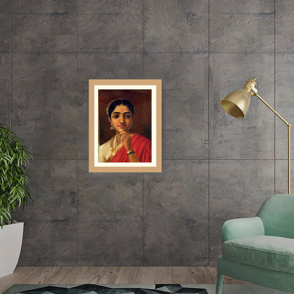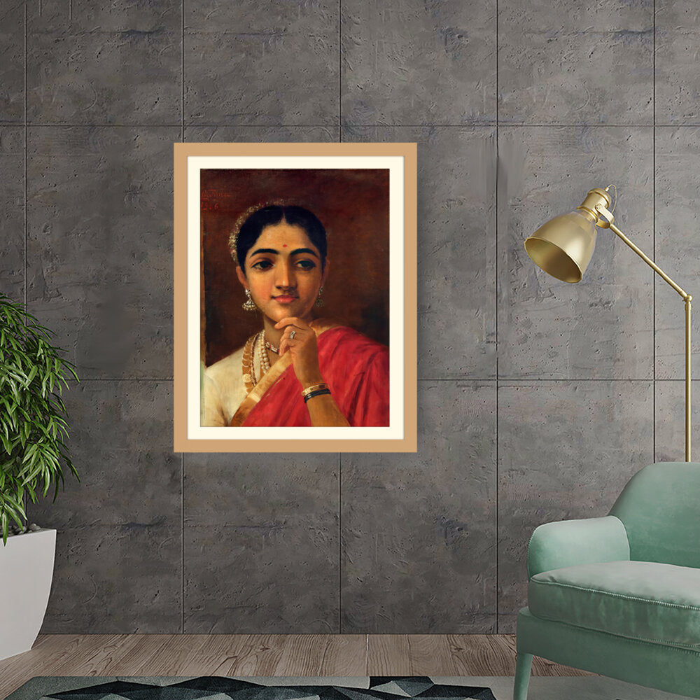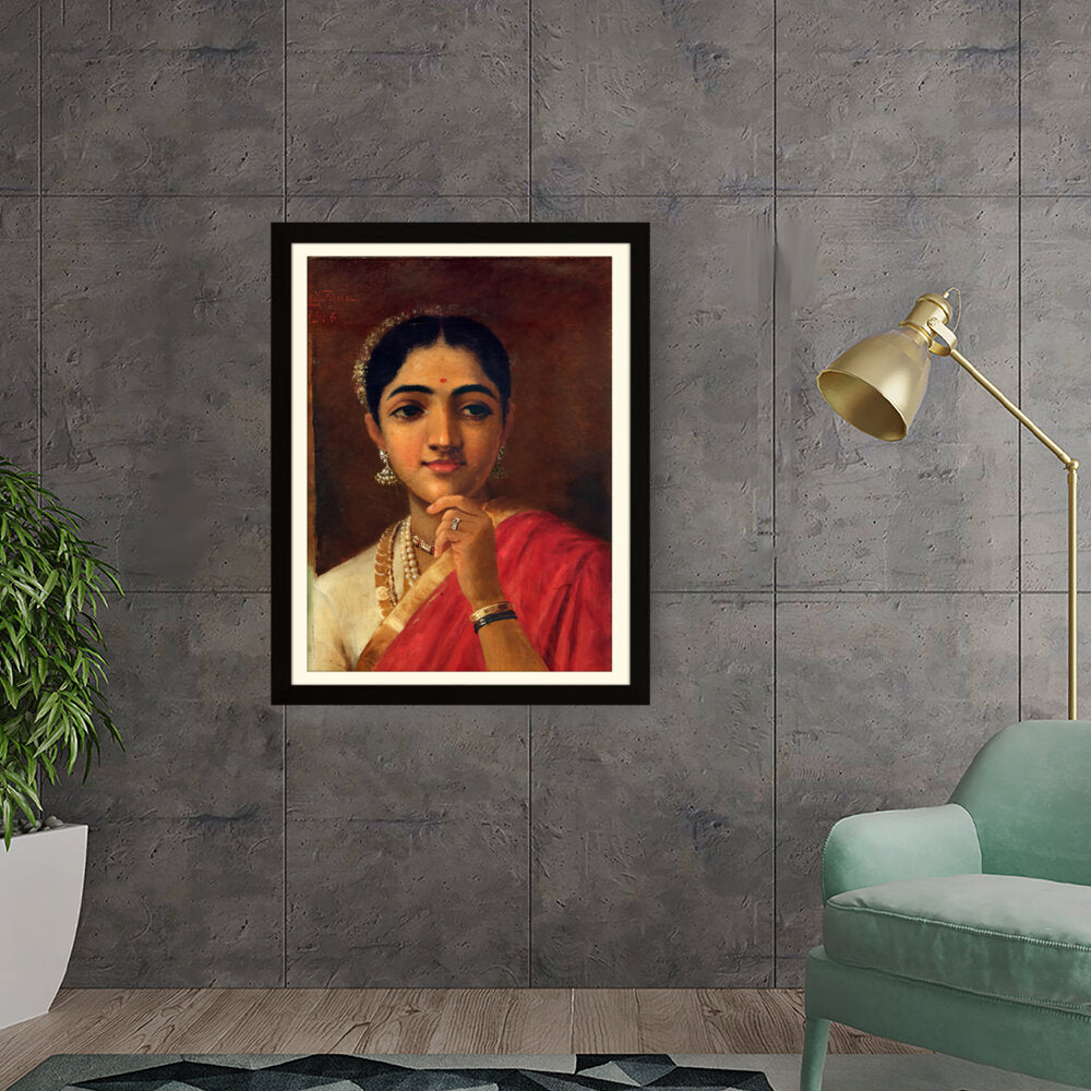 This captivating portrait showcases a woman adorned in traditional attire, embodying grace and thoughtfulness. The rich colors and intricate details draw the viewer into her serene expression, making it a timeless piece suitable for various room themes.