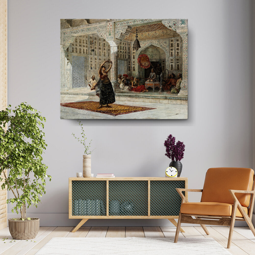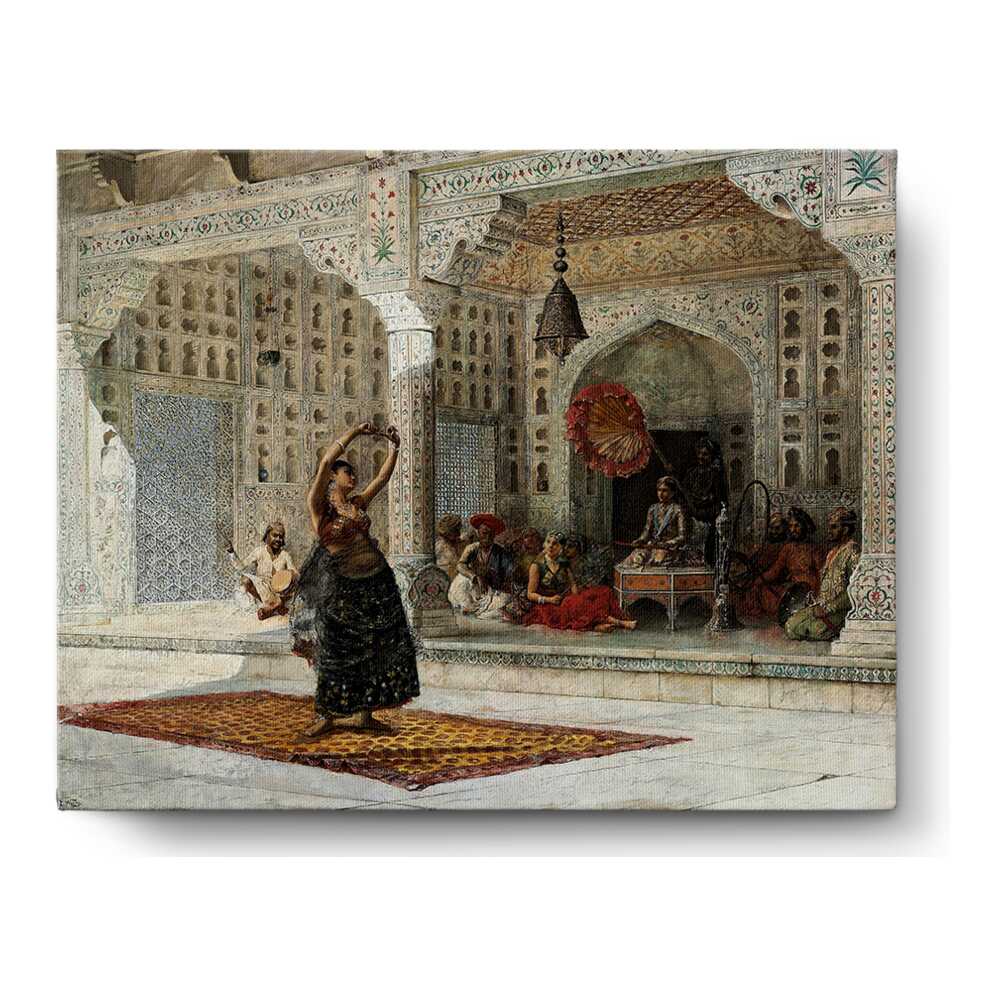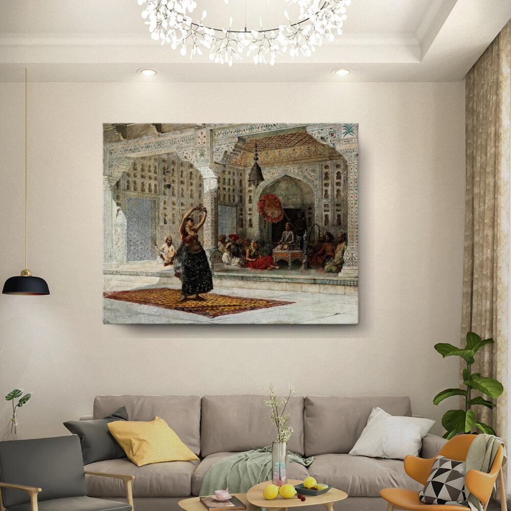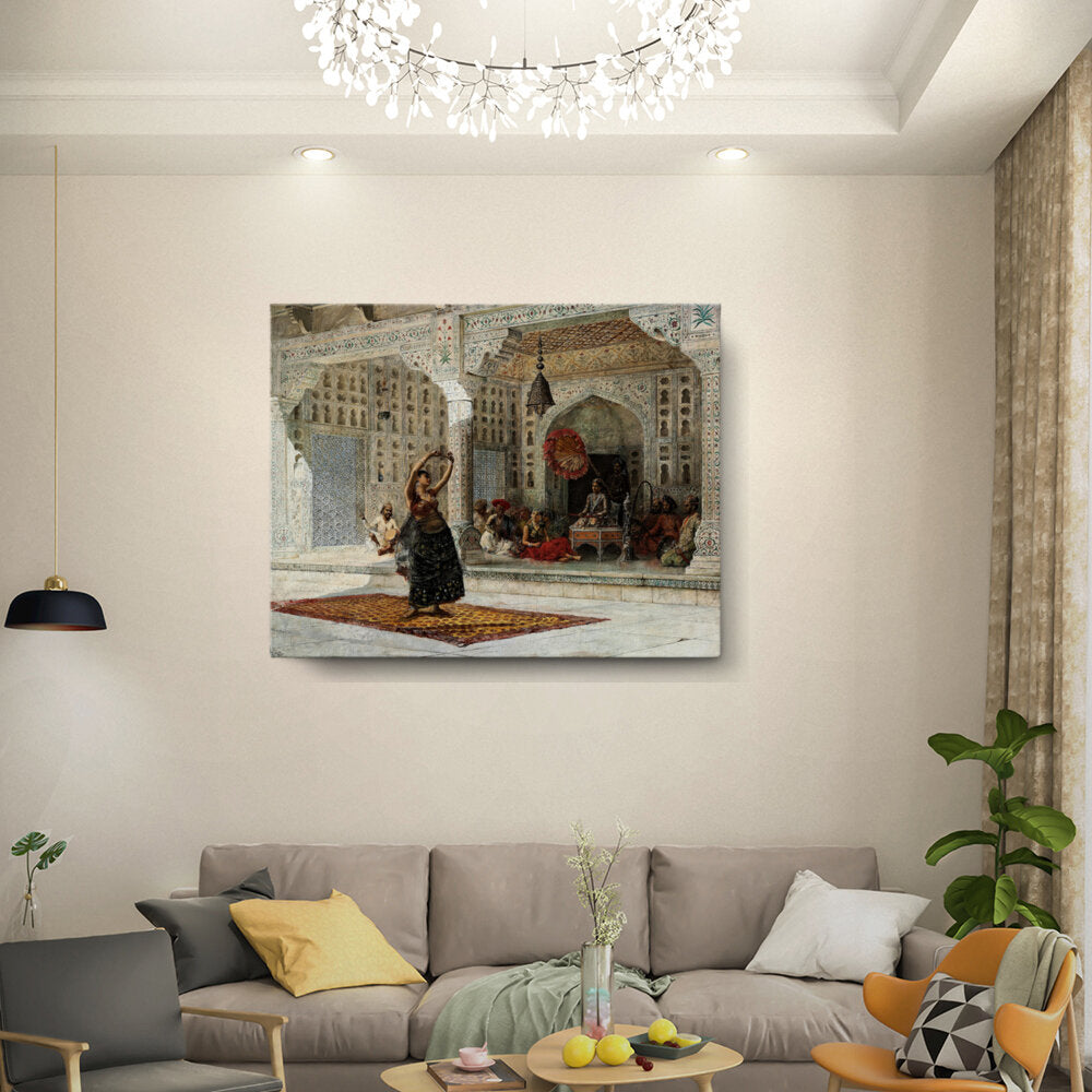 This captivating artwork showcases a traditional dance performance set in an intricately designed Indian palace. The artist masterfully captures the vibrant colors, detailed architecture, and expressive movement of the dancers, creating a lively atmosphere that transports viewers to a rich cultural setting.