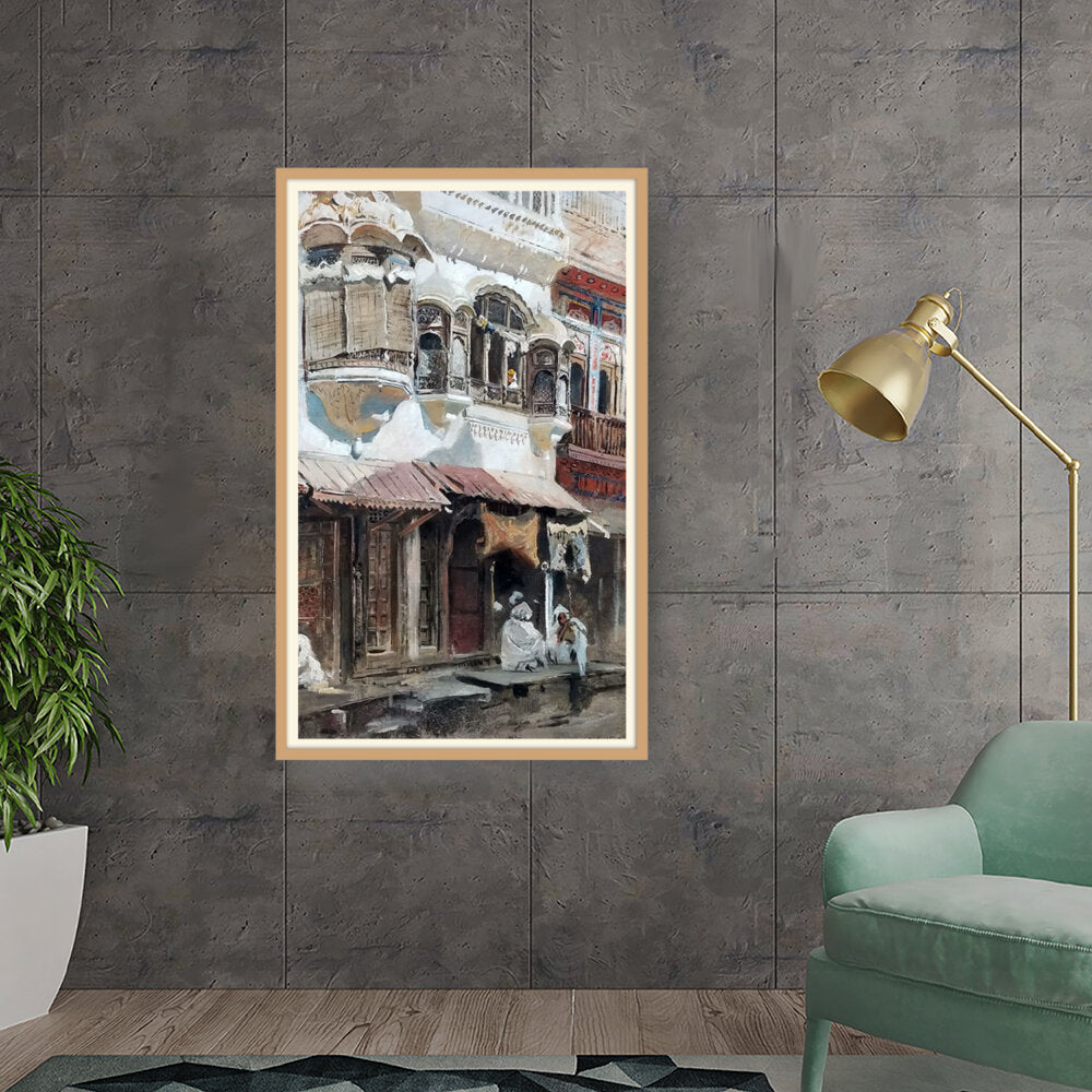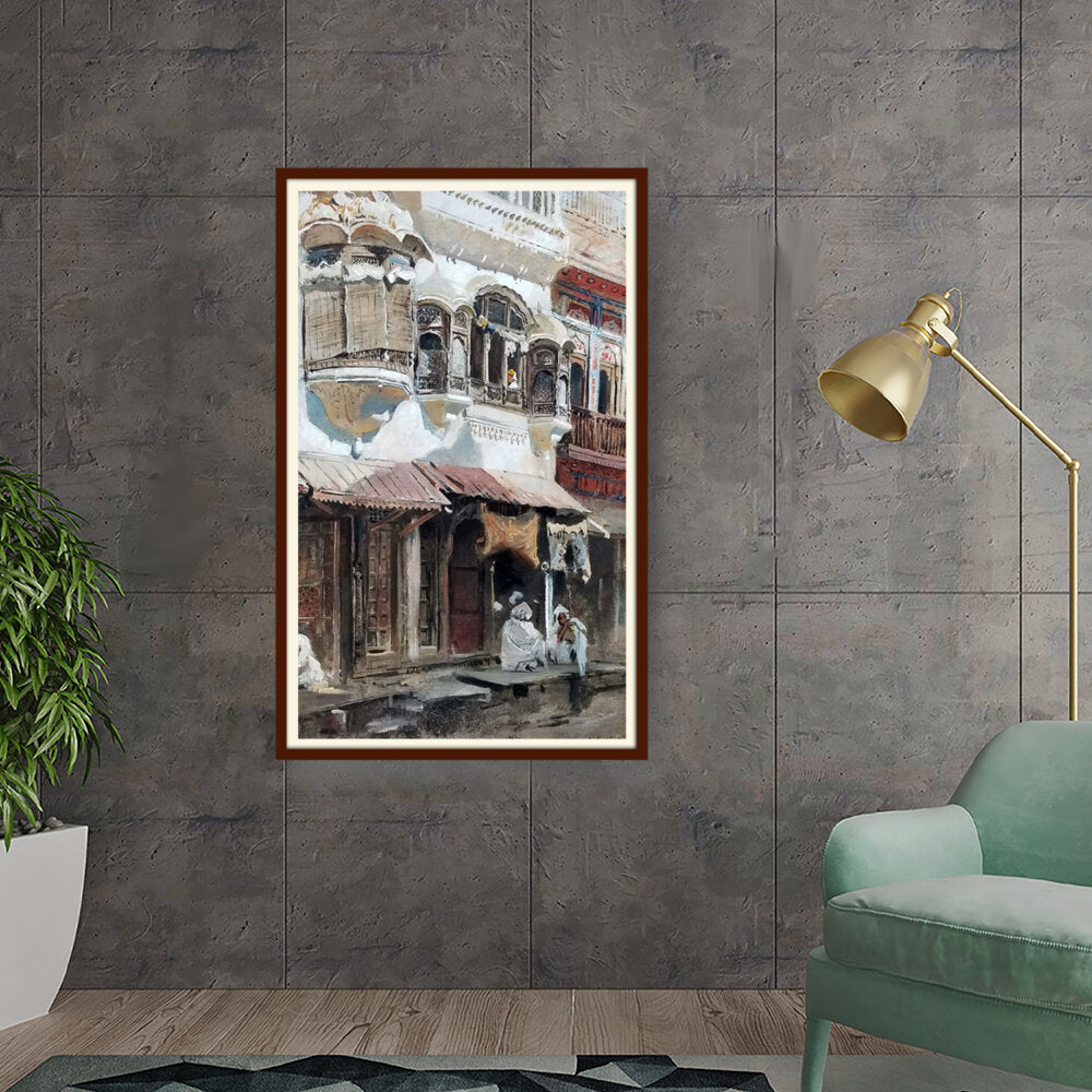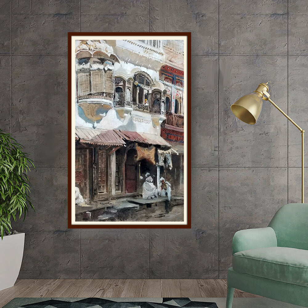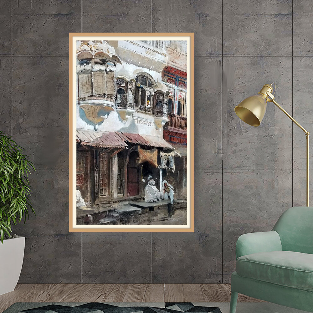 This painting captures a serene moment on a traditional Indian street, showcasing intricate architectural details and the everyday life of its inhabitants. The warm, inviting colors and delicate brushwork evoke a sense of nostalgia and a rich cultural heritage, perfect for enhancing any home or workspace.