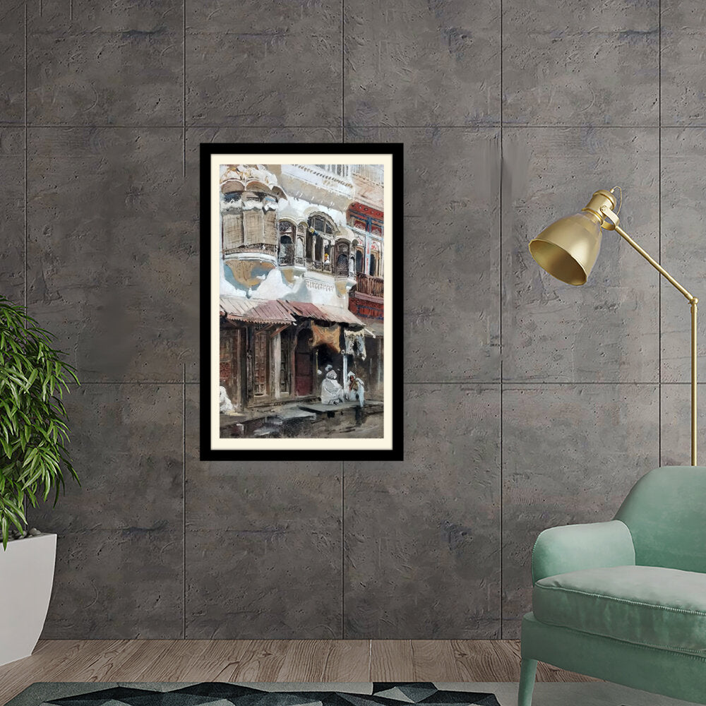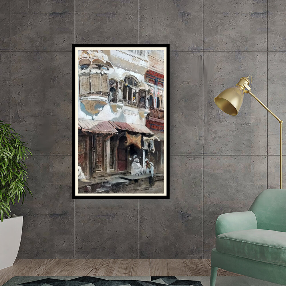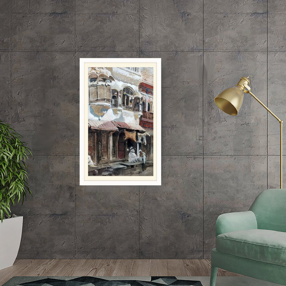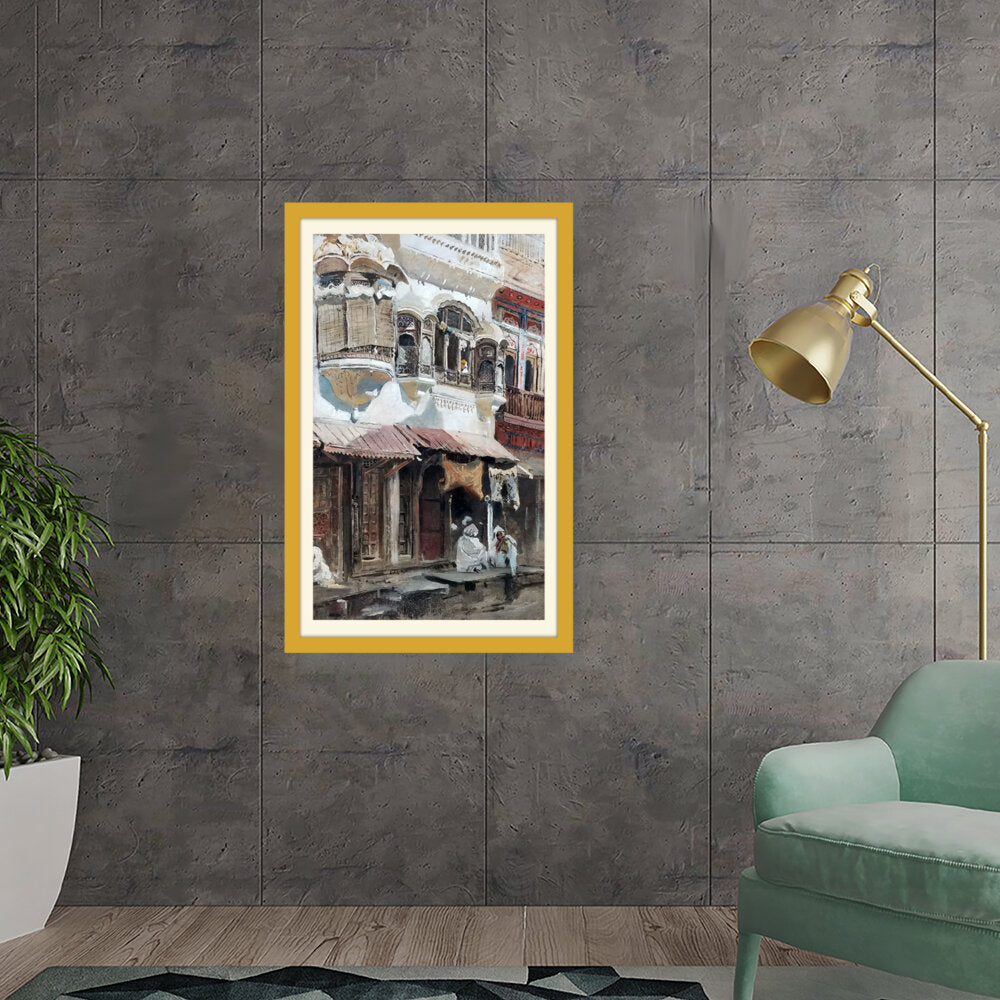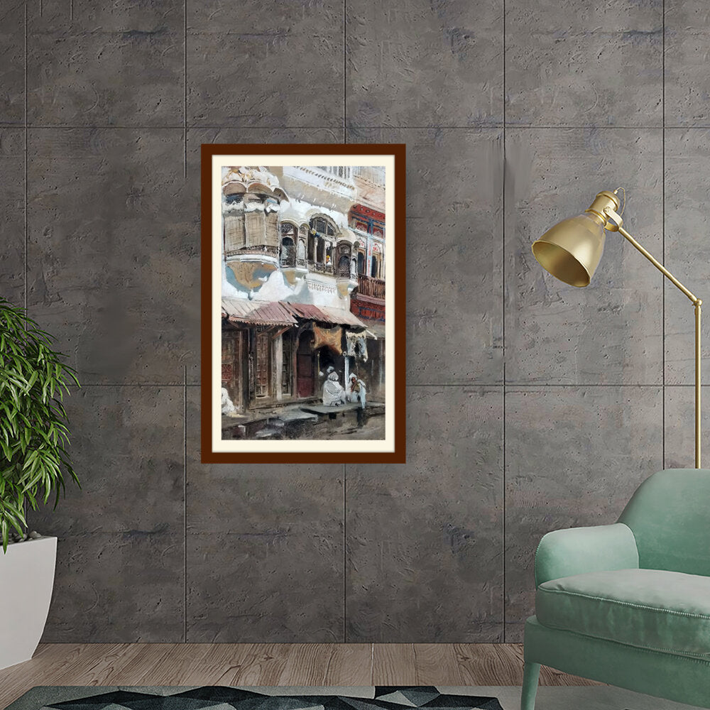 This painting captures a serene moment on a traditional Indian street, showcasing intricate architectural details and the everyday life of its inhabitants. The warm, inviting colors and delicate brushwork evoke a sense of nostalgia and a rich cultural heritage, perfect for enhancing any home or workspace.