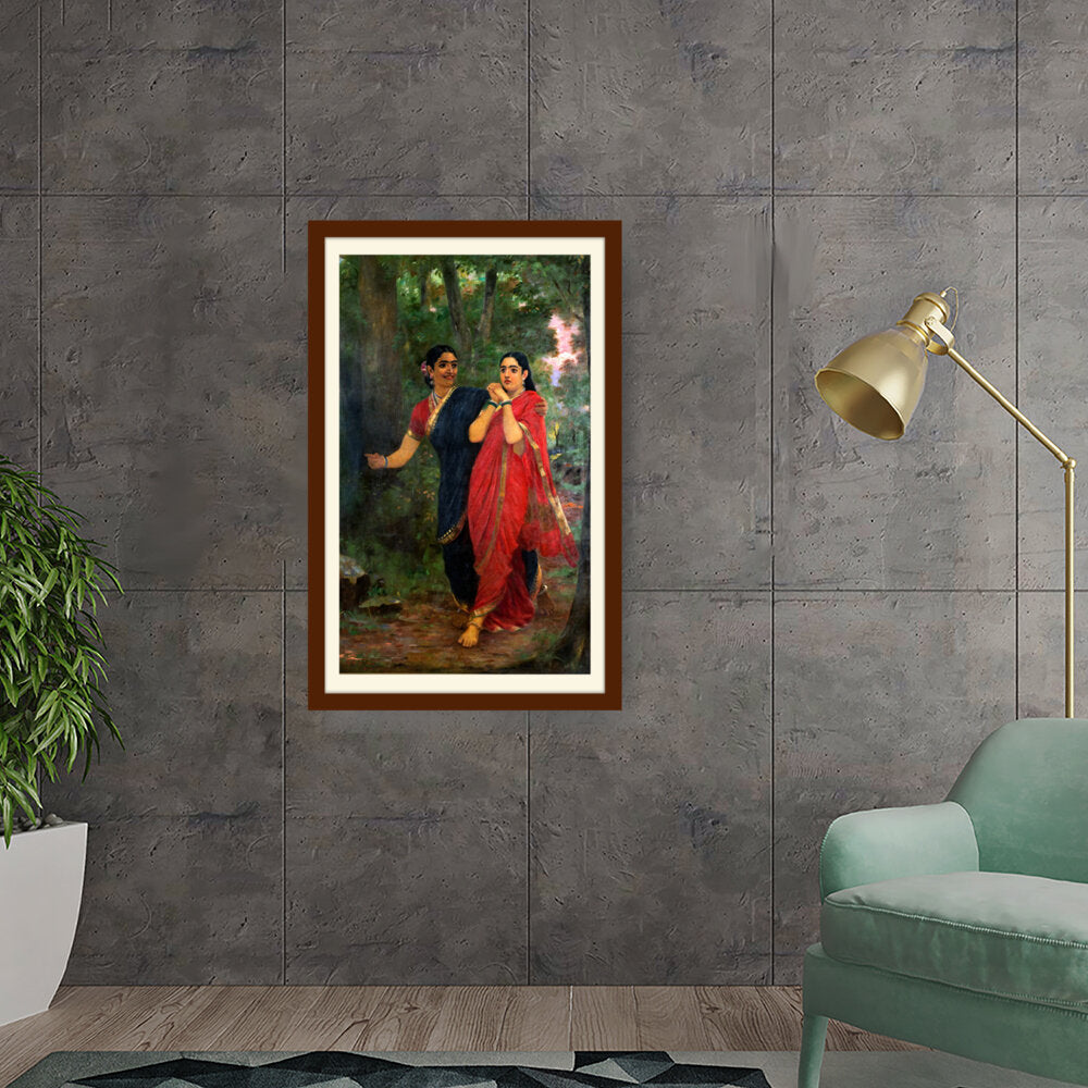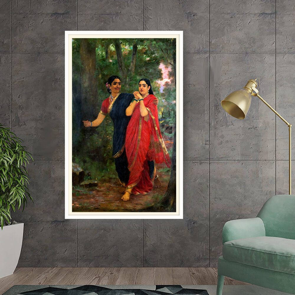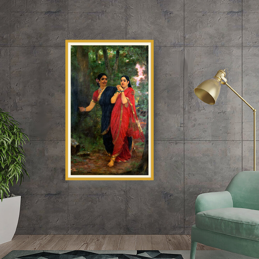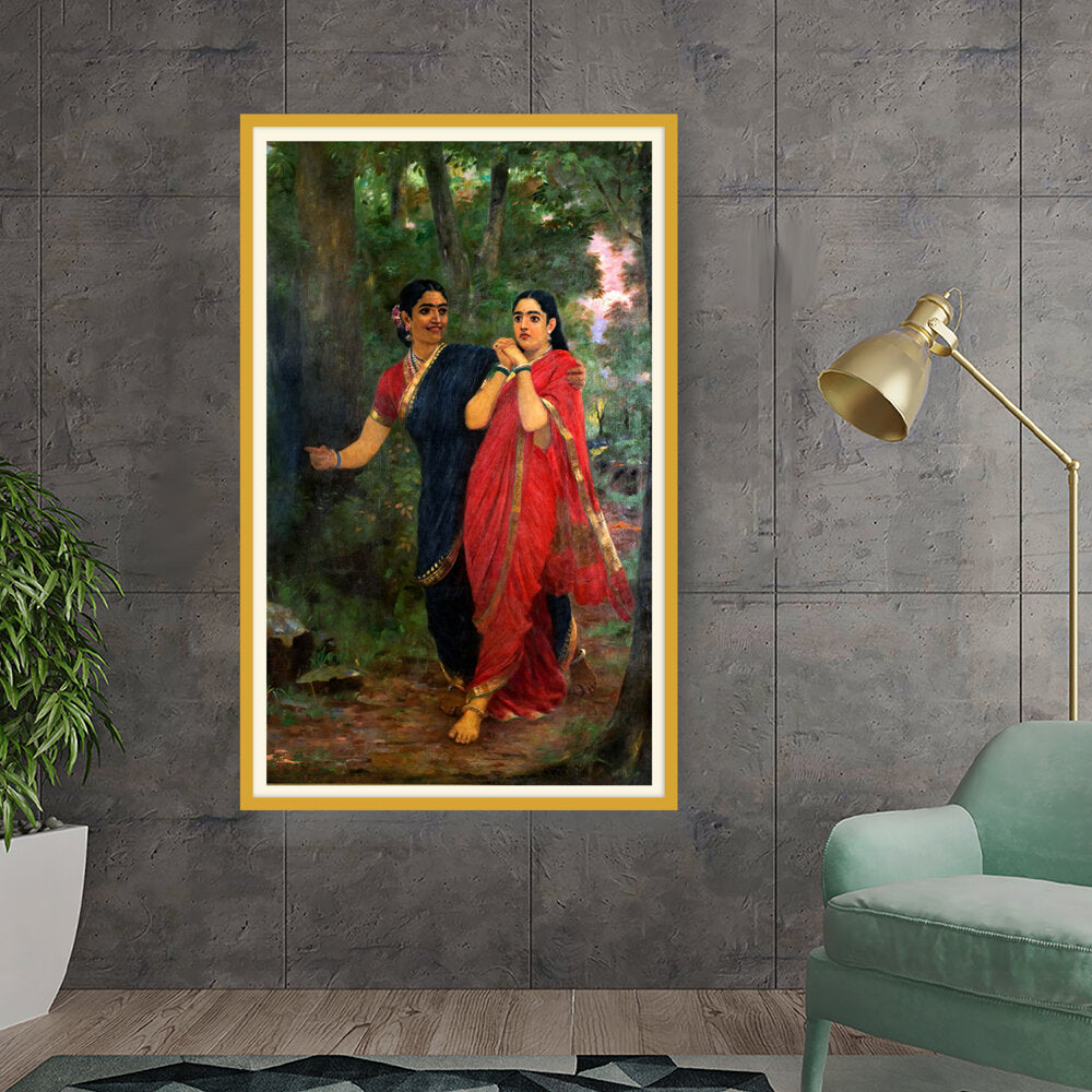 This exquisite oil painting captures two women adorned in traditional Indian attire, set against a lush, green forest backdrop. The vibrant colors and intricate details convey a sense of cultural richness and connection to nature, making it a timeless piece for any art lover.
