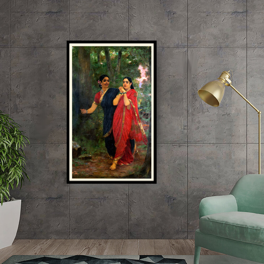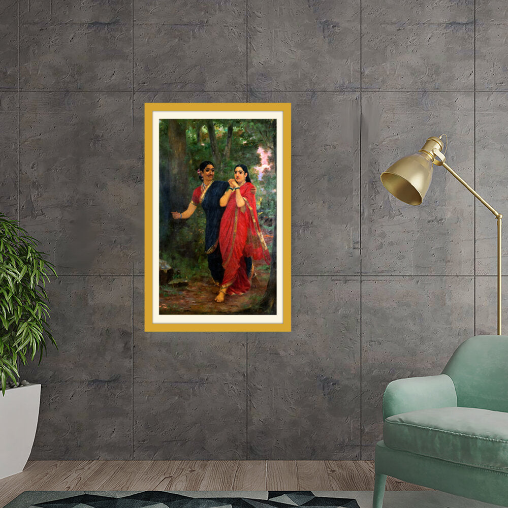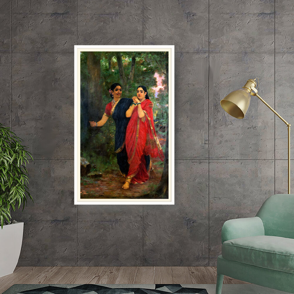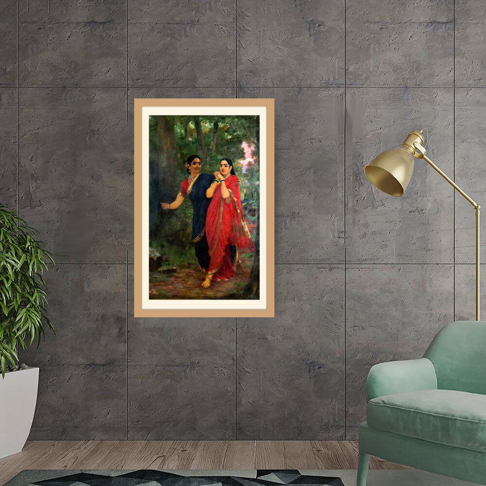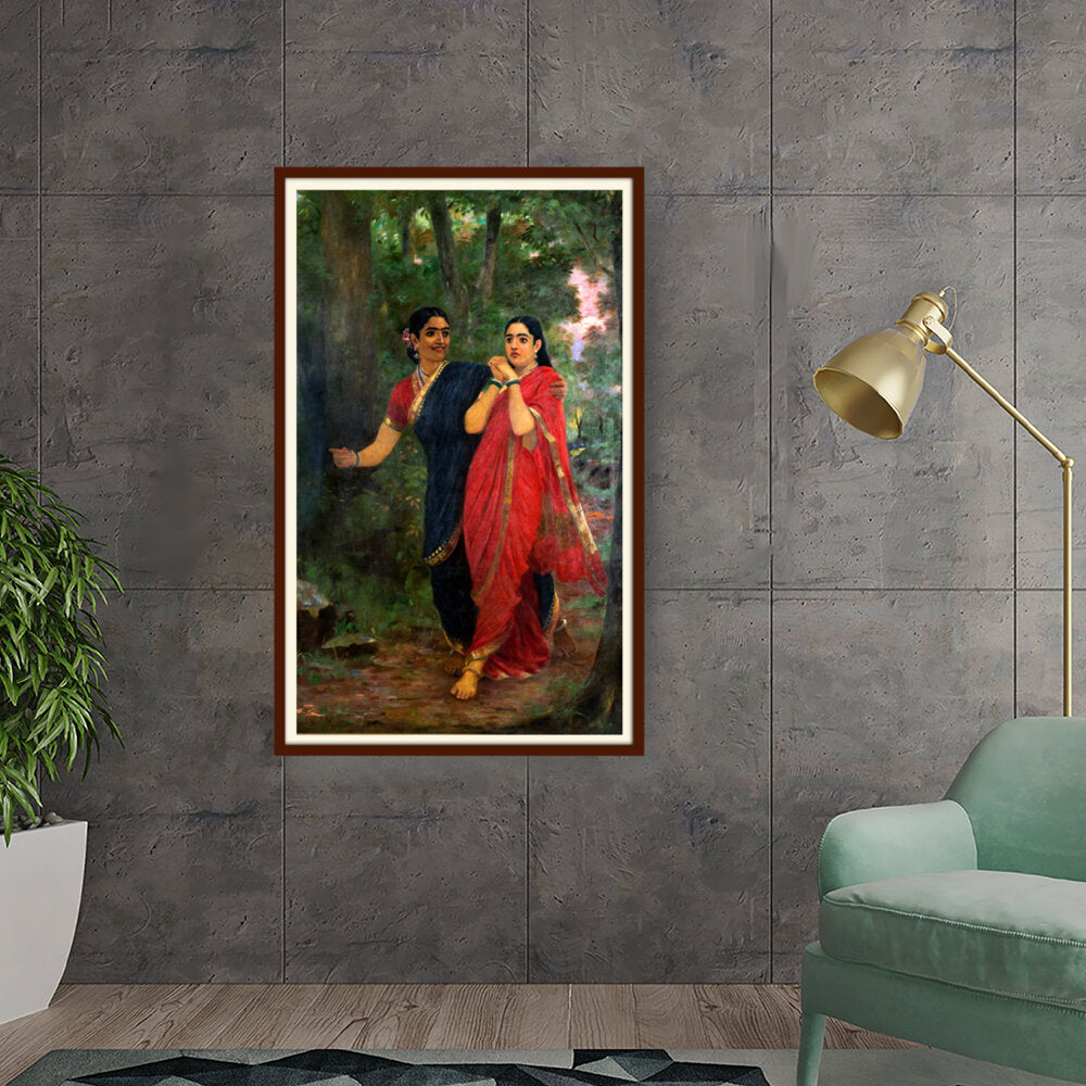 This exquisite oil painting captures two women adorned in traditional Indian attire, set against a lush, green forest backdrop. The vibrant colors and intricate details convey a sense of cultural richness and connection to nature, making it a timeless piece for any art lover.