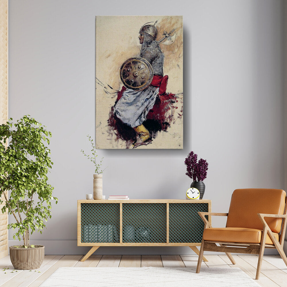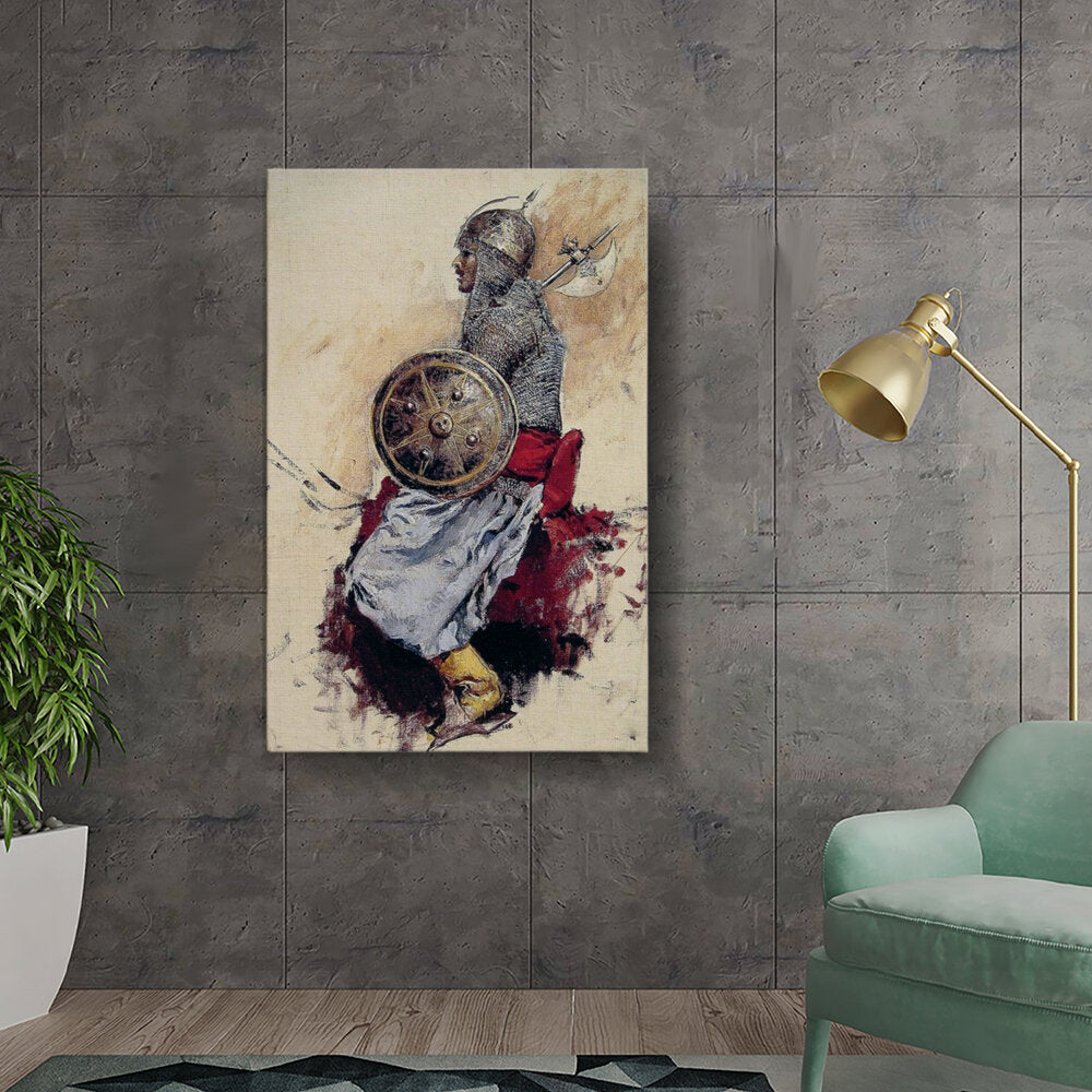 This captivating artwork features a detailed depiction of a warrior in traditional armor, showcasing the intricate design of the helmet and shield. The strong presence of the figure against a textured background evokes a sense of history and valor, making it a striking addition to any space.