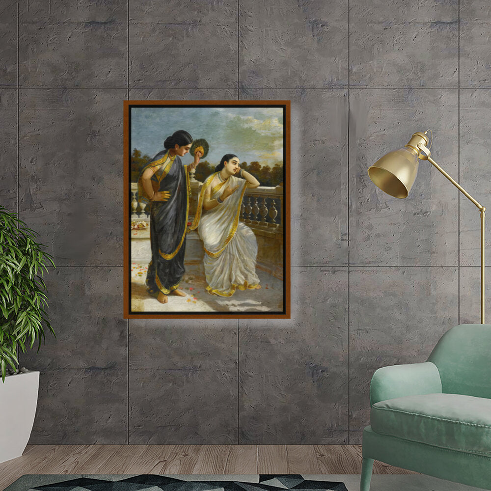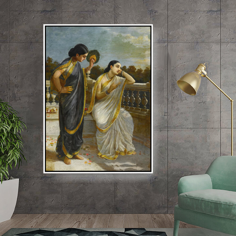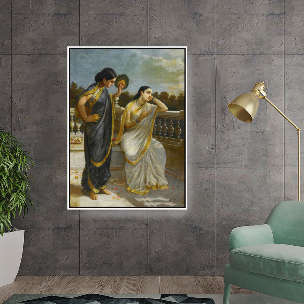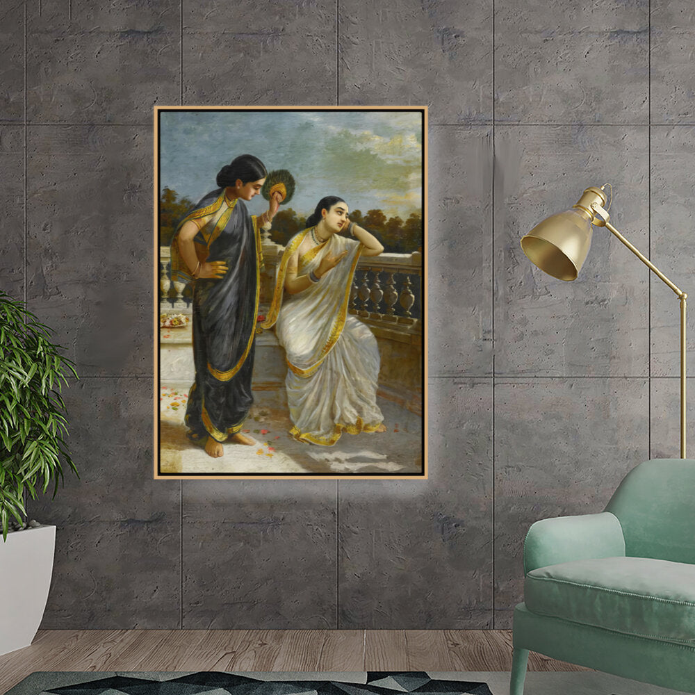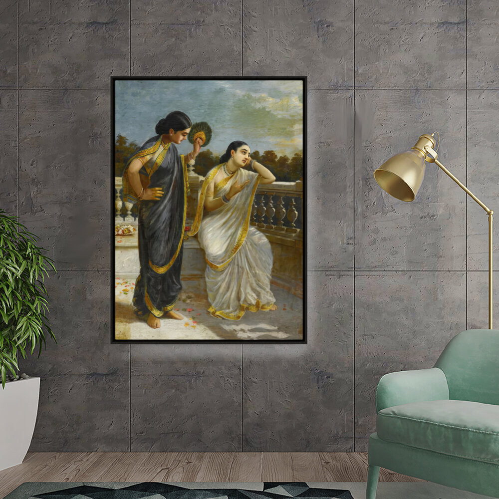 This exquisite oil painting captures an intimate moment between two elegantly dressed women, set against a serene backdrop. The intricate details of their attire and the emotional expressions create a captivating narrative that invites viewers into a world of grace and tradition.