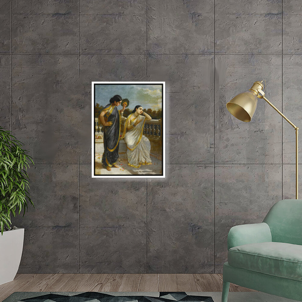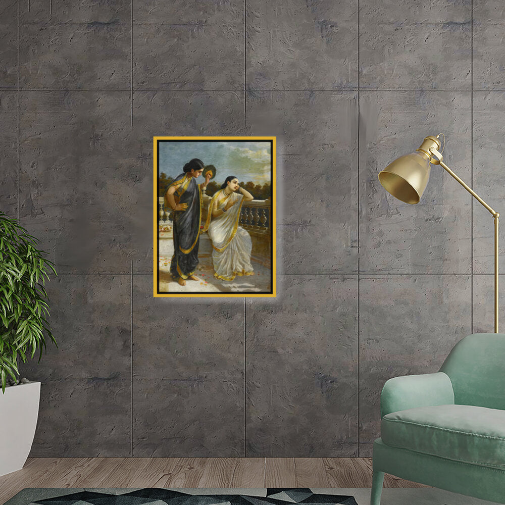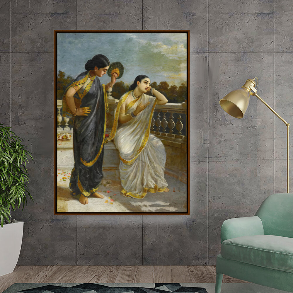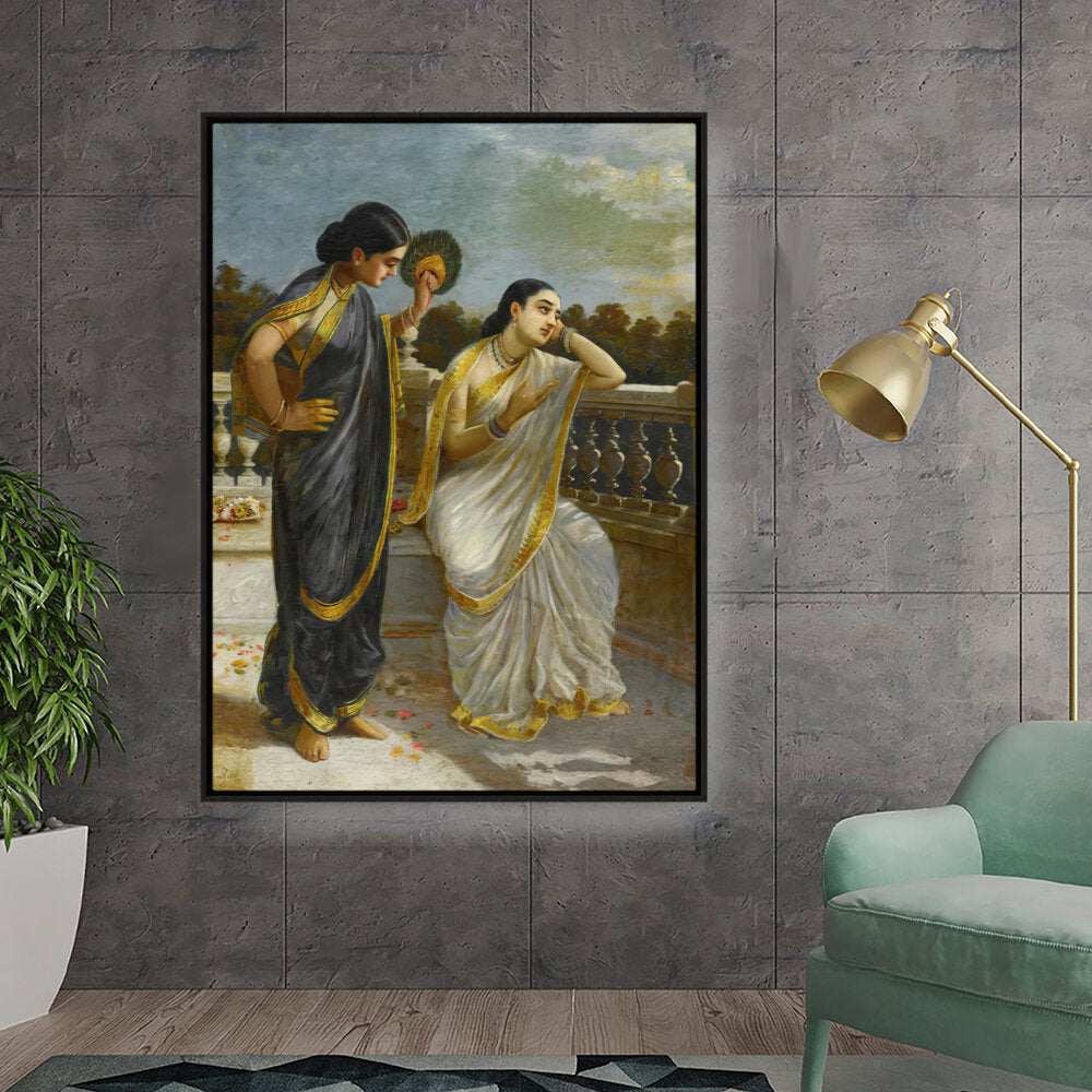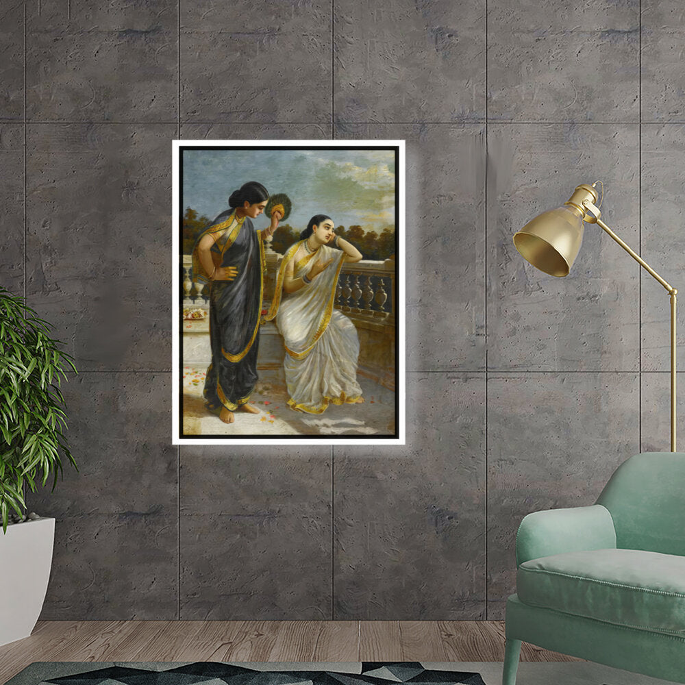 This exquisite oil painting captures an intimate moment between two elegantly dressed women, set against a serene backdrop. The intricate details of their attire and the emotional expressions create a captivating narrative that invites viewers into a world of grace and tradition.