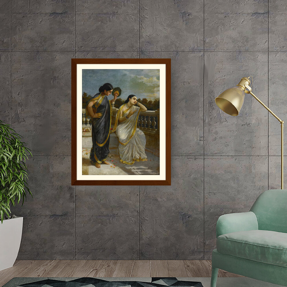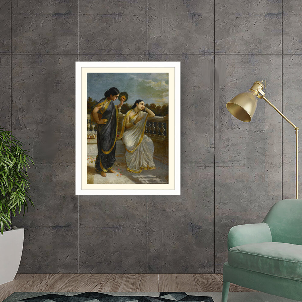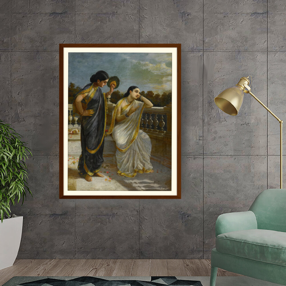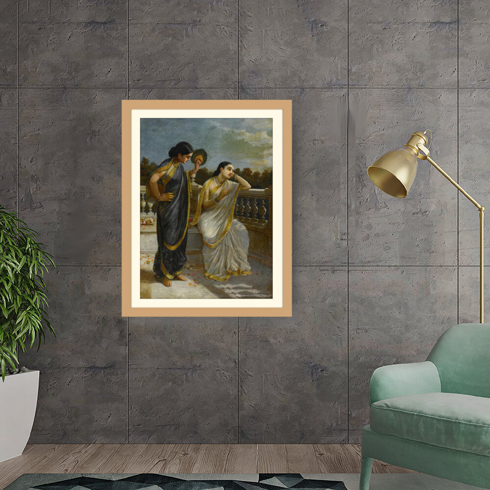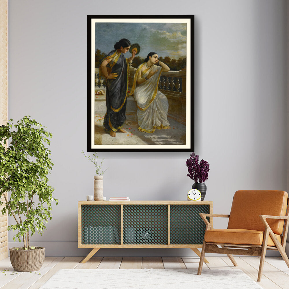 This exquisite oil painting captures an intimate moment between two elegantly dressed women, set against a serene backdrop. The intricate details of their attire and the emotional expressions create a captivating narrative that invites viewers into a world of grace and tradition.