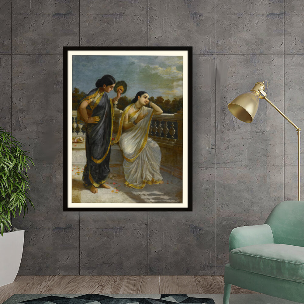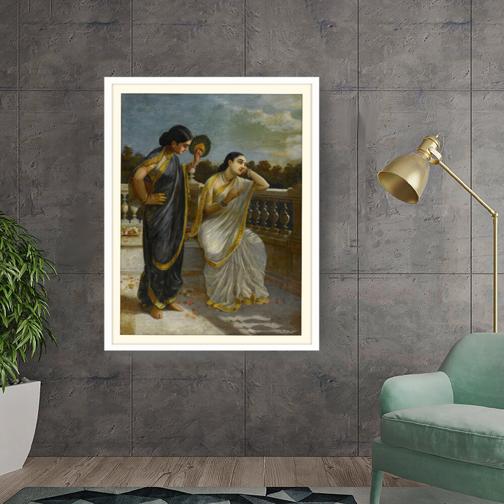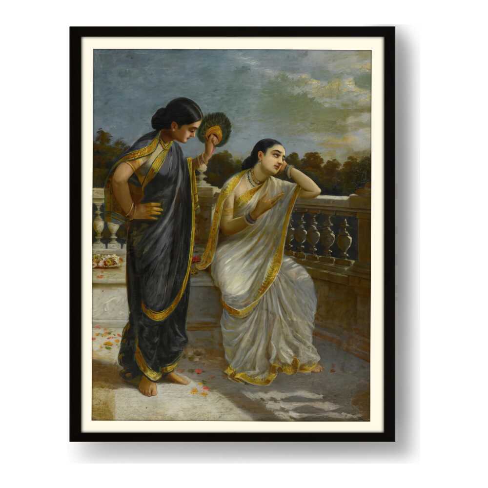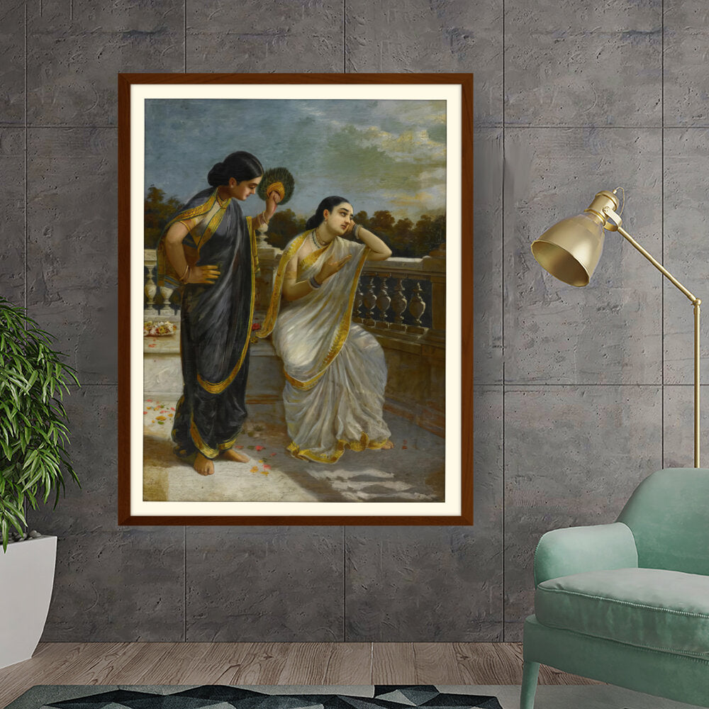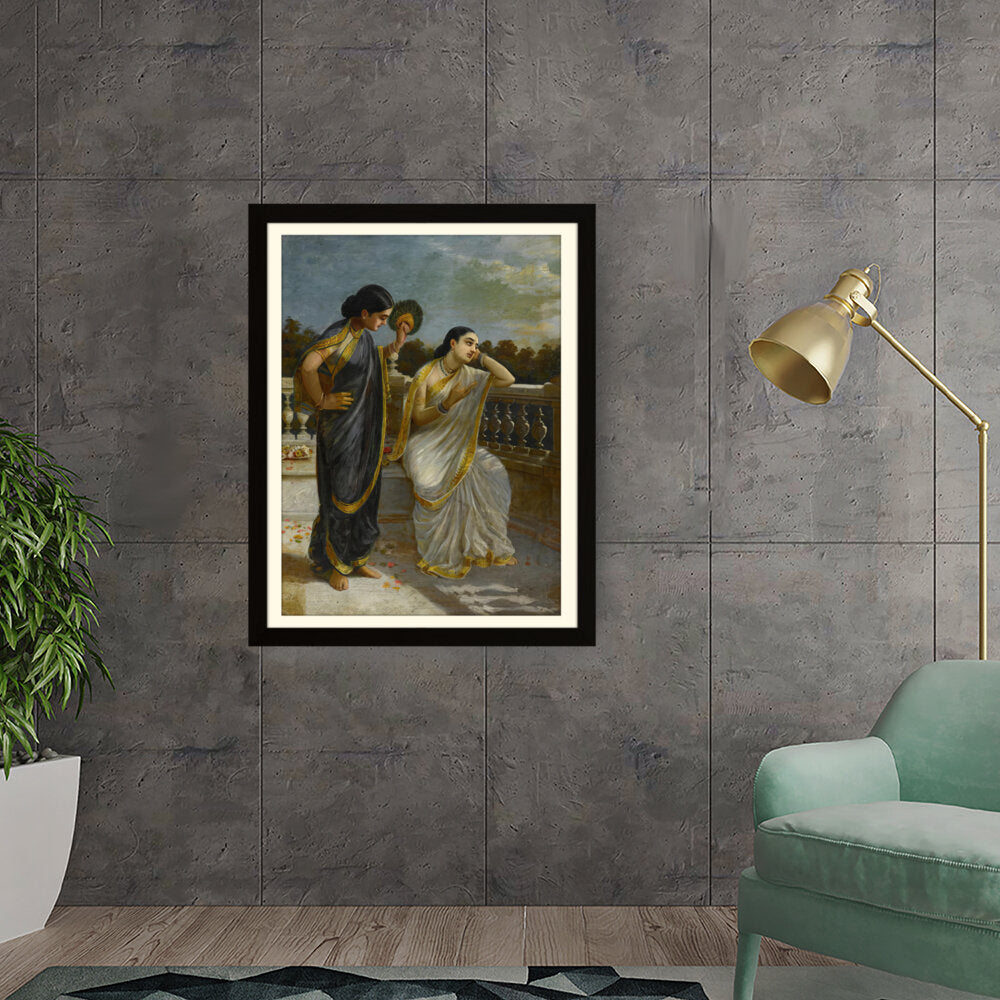 This exquisite oil painting captures an intimate moment between two elegantly dressed women, set against a serene backdrop. The intricate details of their attire and the emotional expressions create a captivating narrative that invites viewers into a world of grace and tradition.