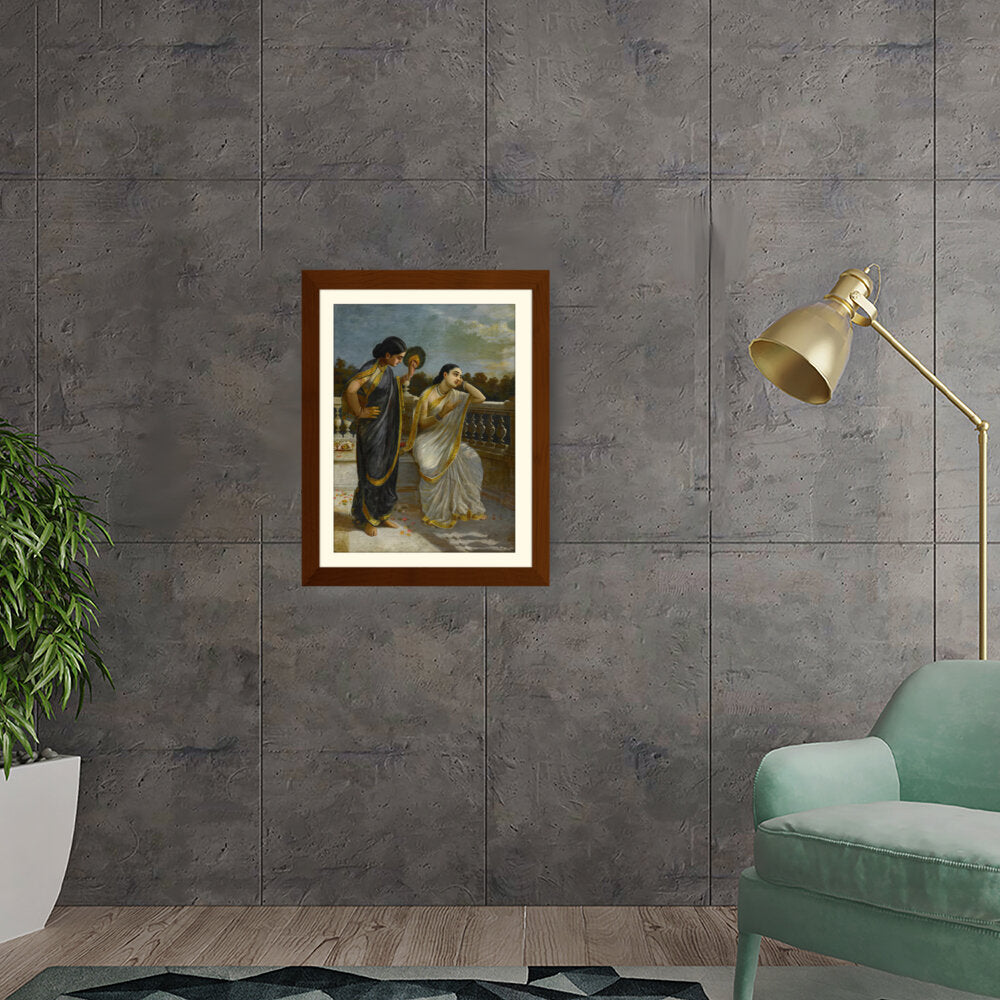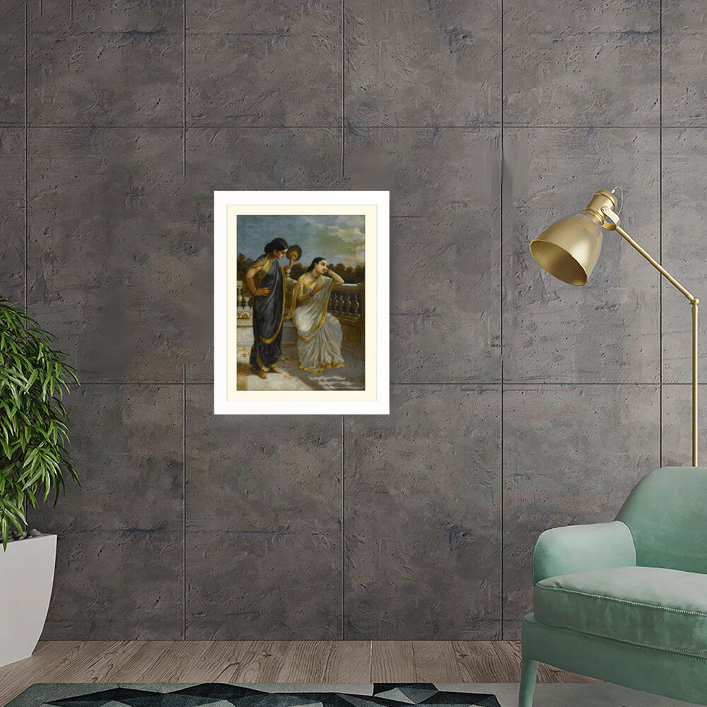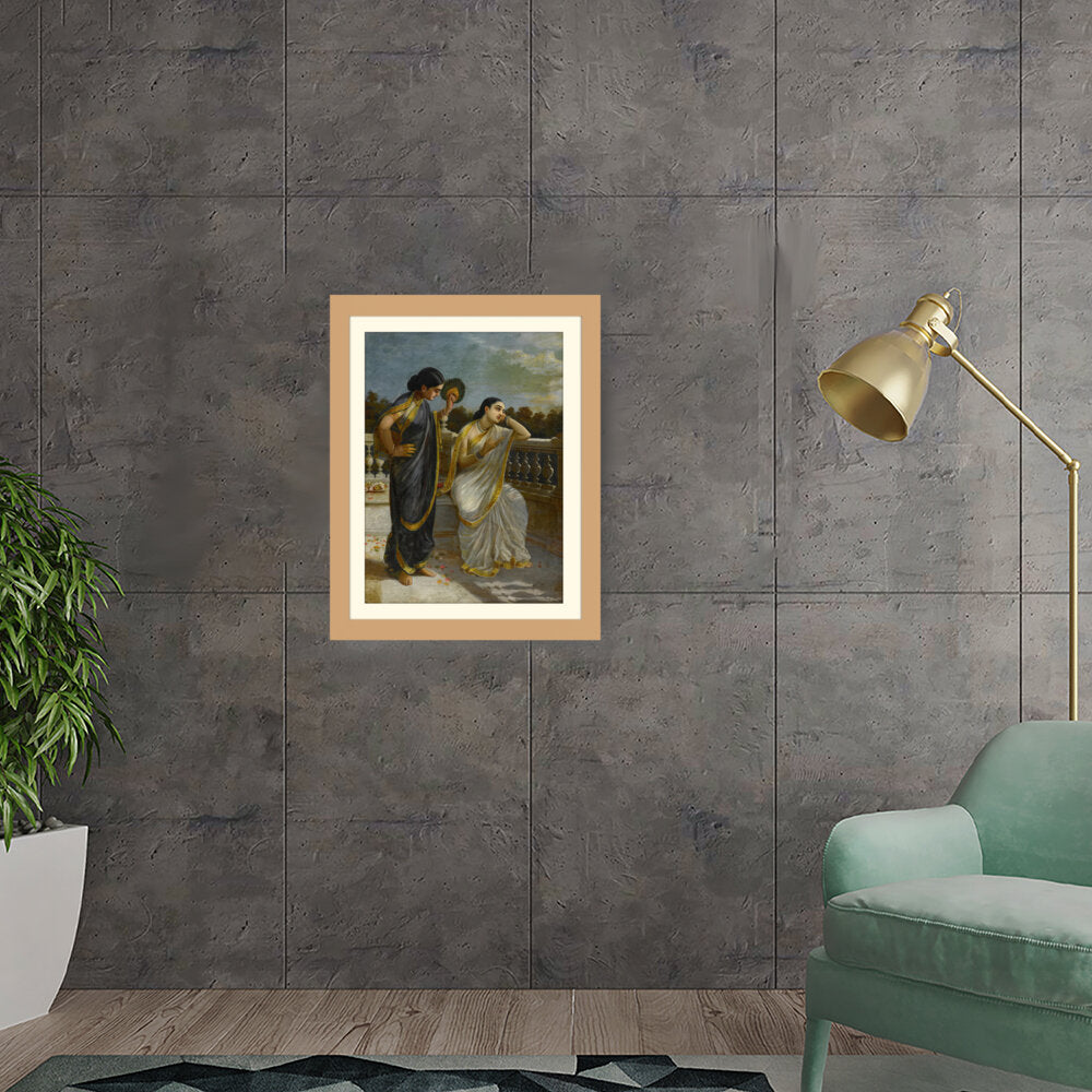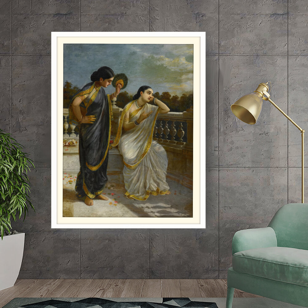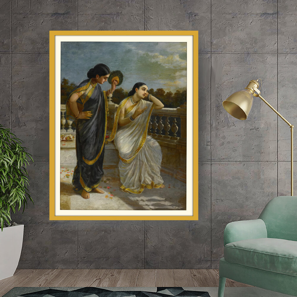 This exquisite oil painting captures an intimate moment between two elegantly dressed women, set against a serene backdrop. The intricate details of their attire and the emotional expressions create a captivating narrative that invites viewers into a world of grace and tradition.