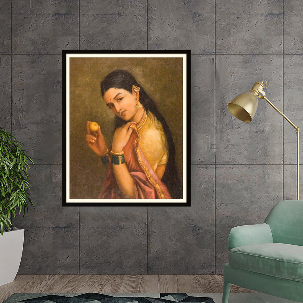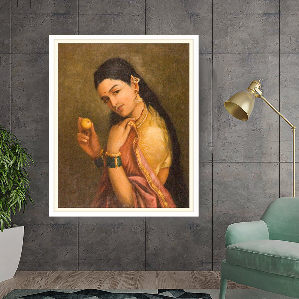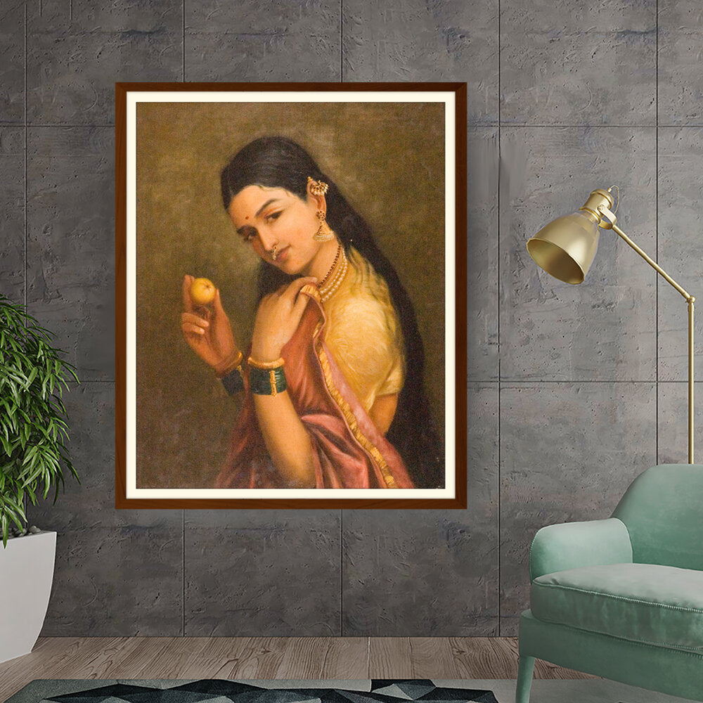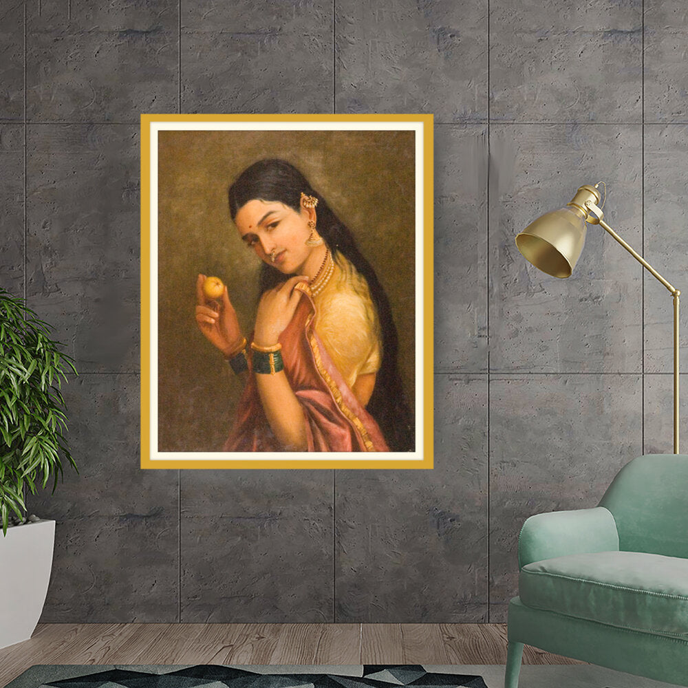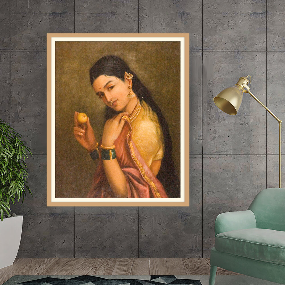 This stunning oil painting portrays a woman elegantly holding a fruit, exuding grace and cultural richness. The intricate details of her traditional attire and adornments give a glimpse into Indian heritage and beauty.