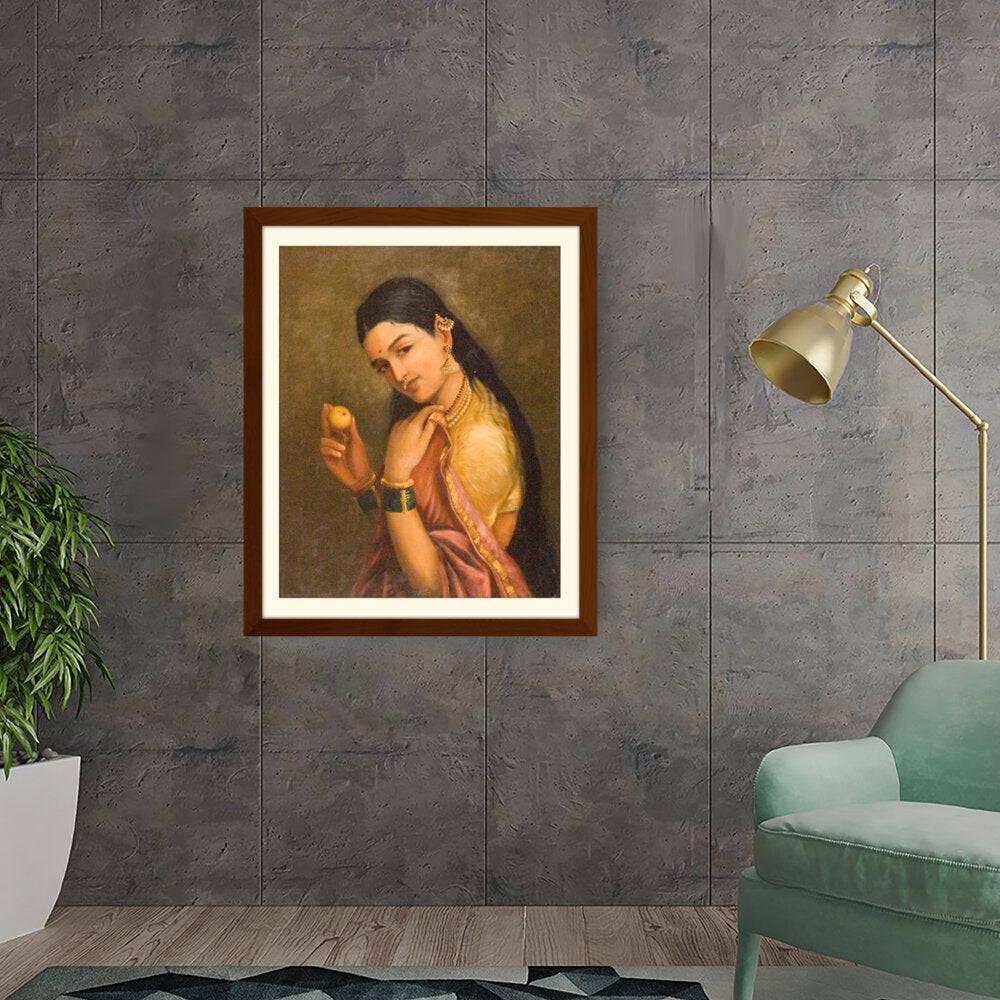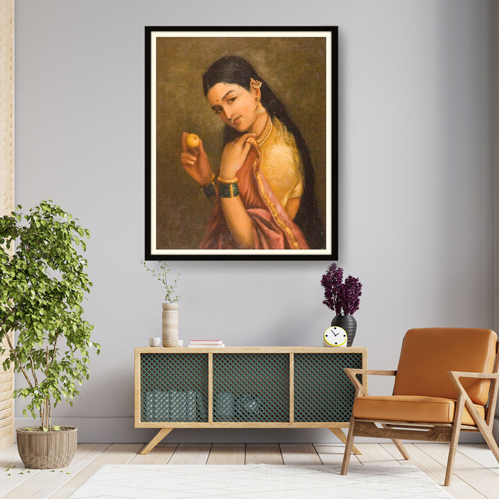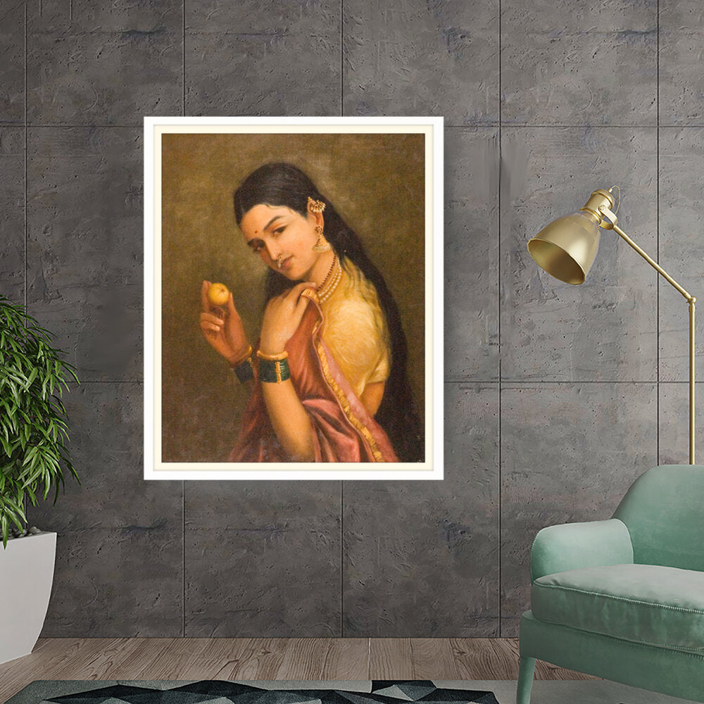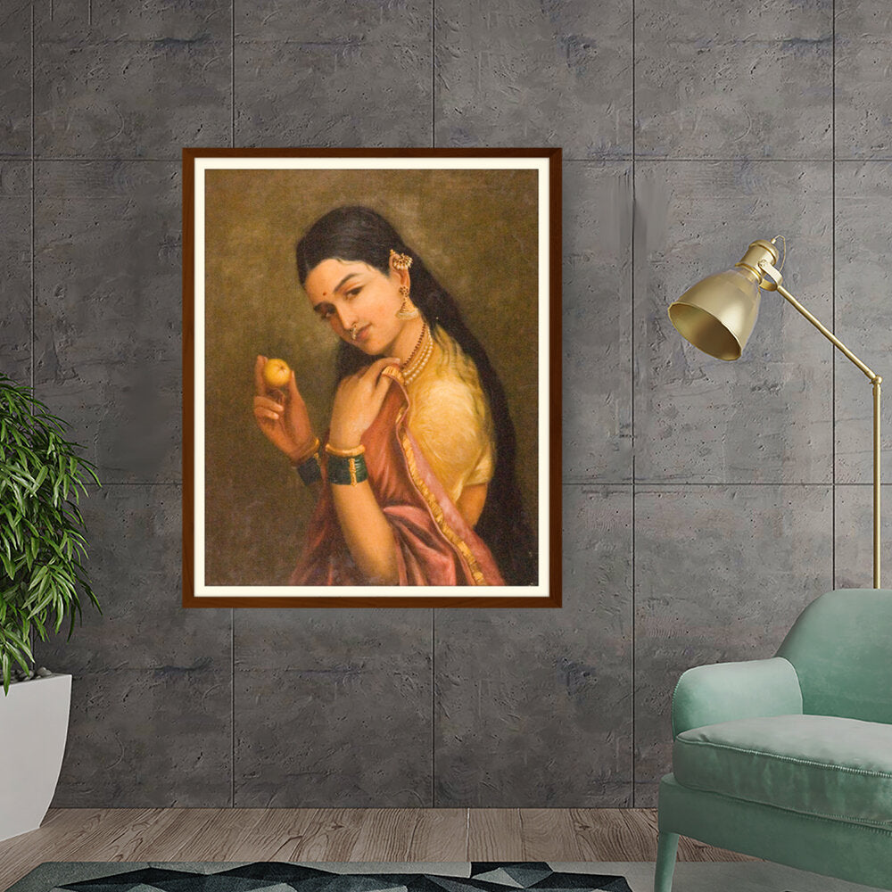 This stunning oil painting portrays a woman elegantly holding a fruit, exuding grace and cultural richness. The intricate details of her traditional attire and adornments give a glimpse into Indian heritage and beauty.