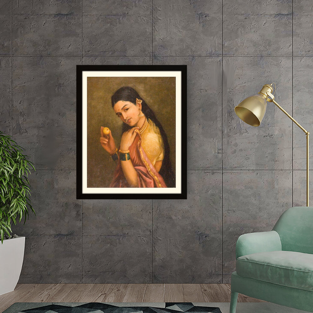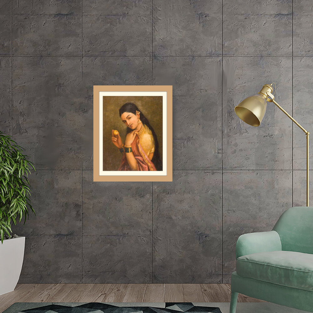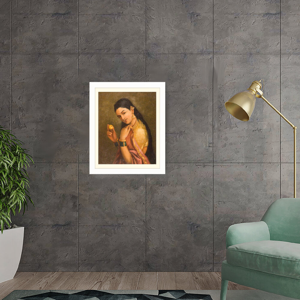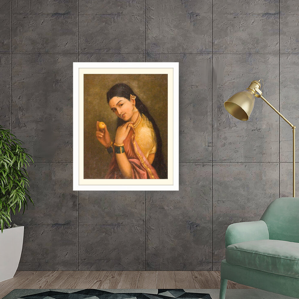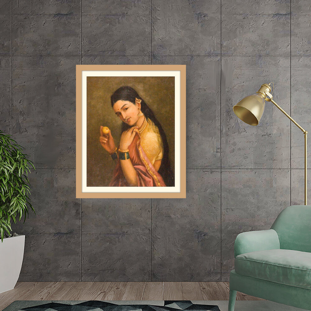 This stunning oil painting portrays a woman elegantly holding a fruit, exuding grace and cultural richness. The intricate details of her traditional attire and adornments give a glimpse into Indian heritage and beauty.