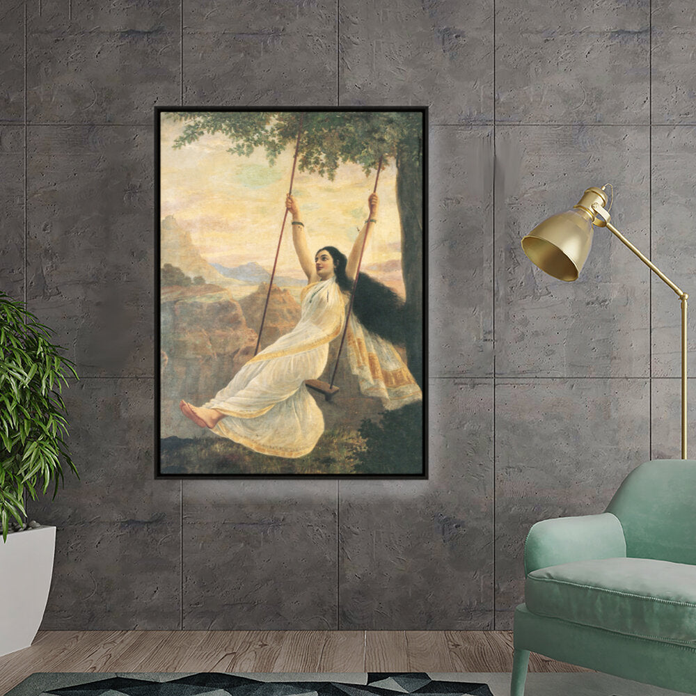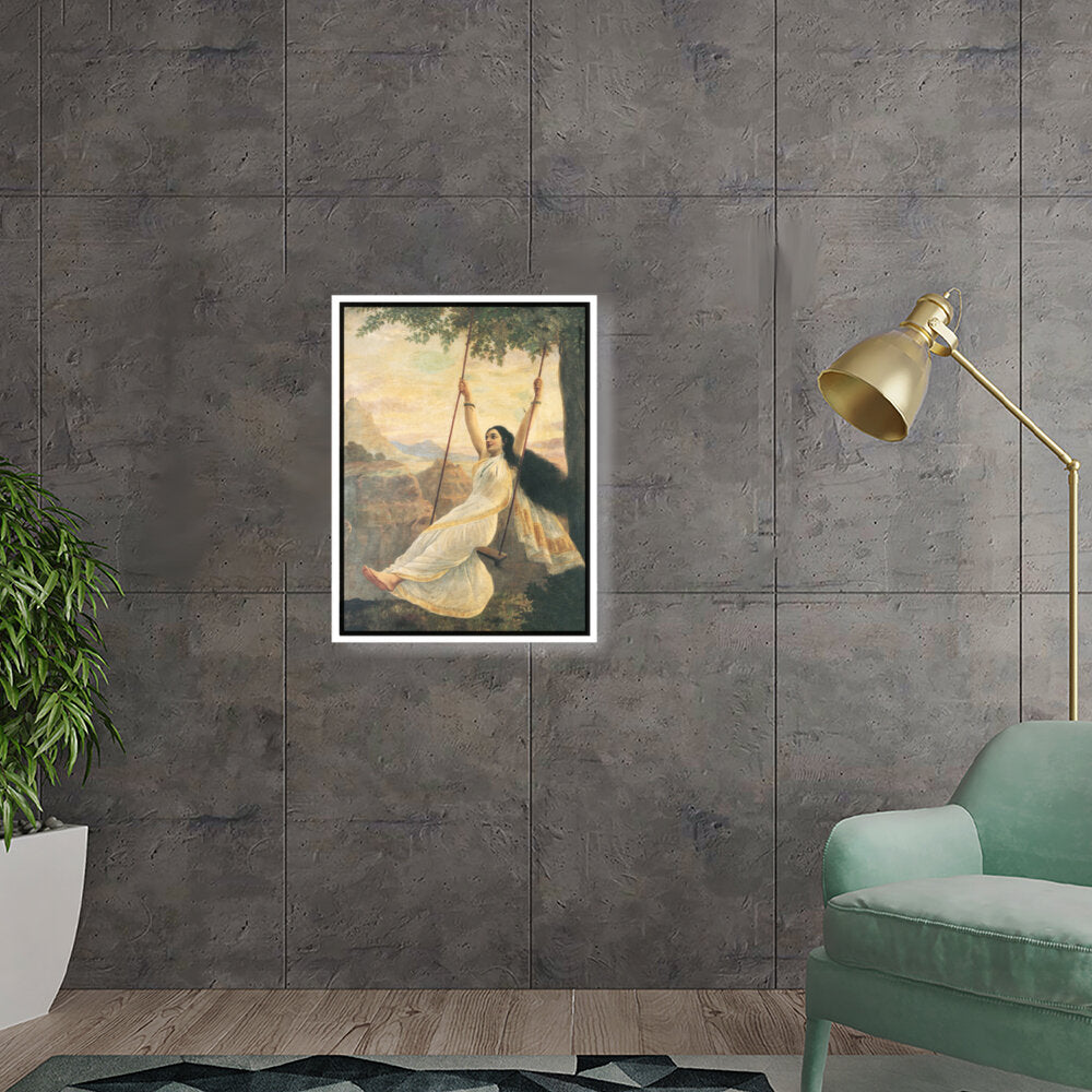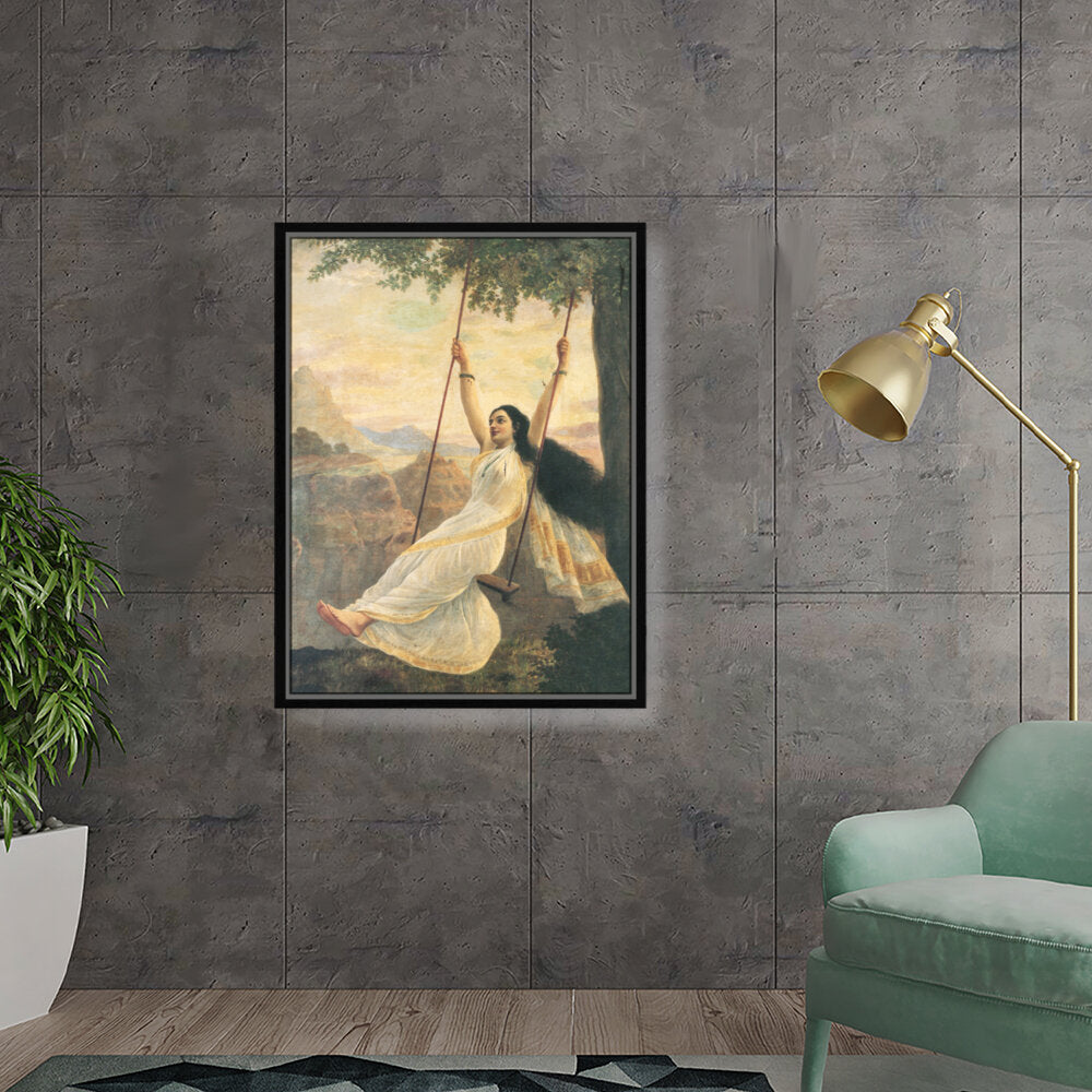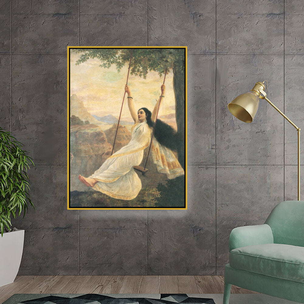 This captivating artwork features a woman in a flowing white saree, gracefully swinging under a tree. The serene landscape enhances the painting's romantic essence, making it a perfect addition for those seeking beauty and tranquility in their space.