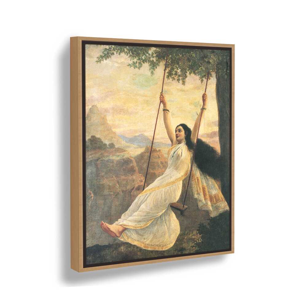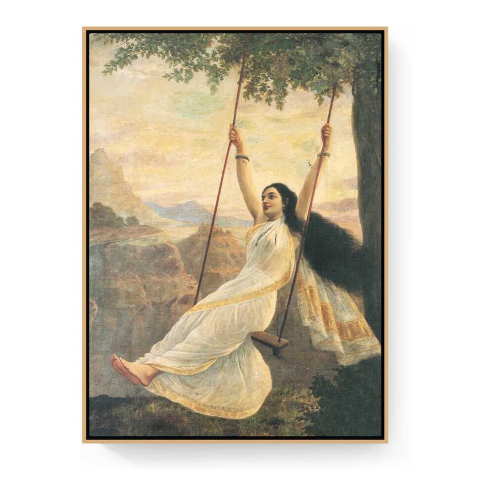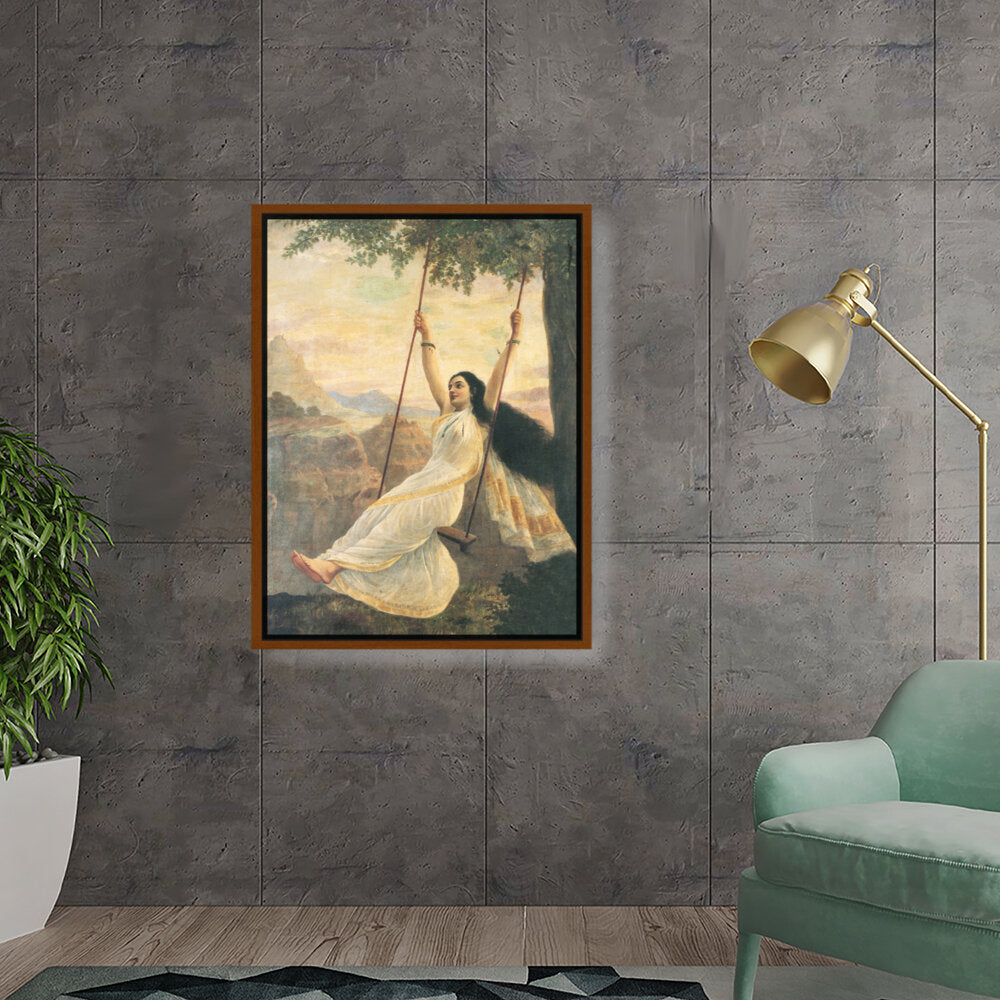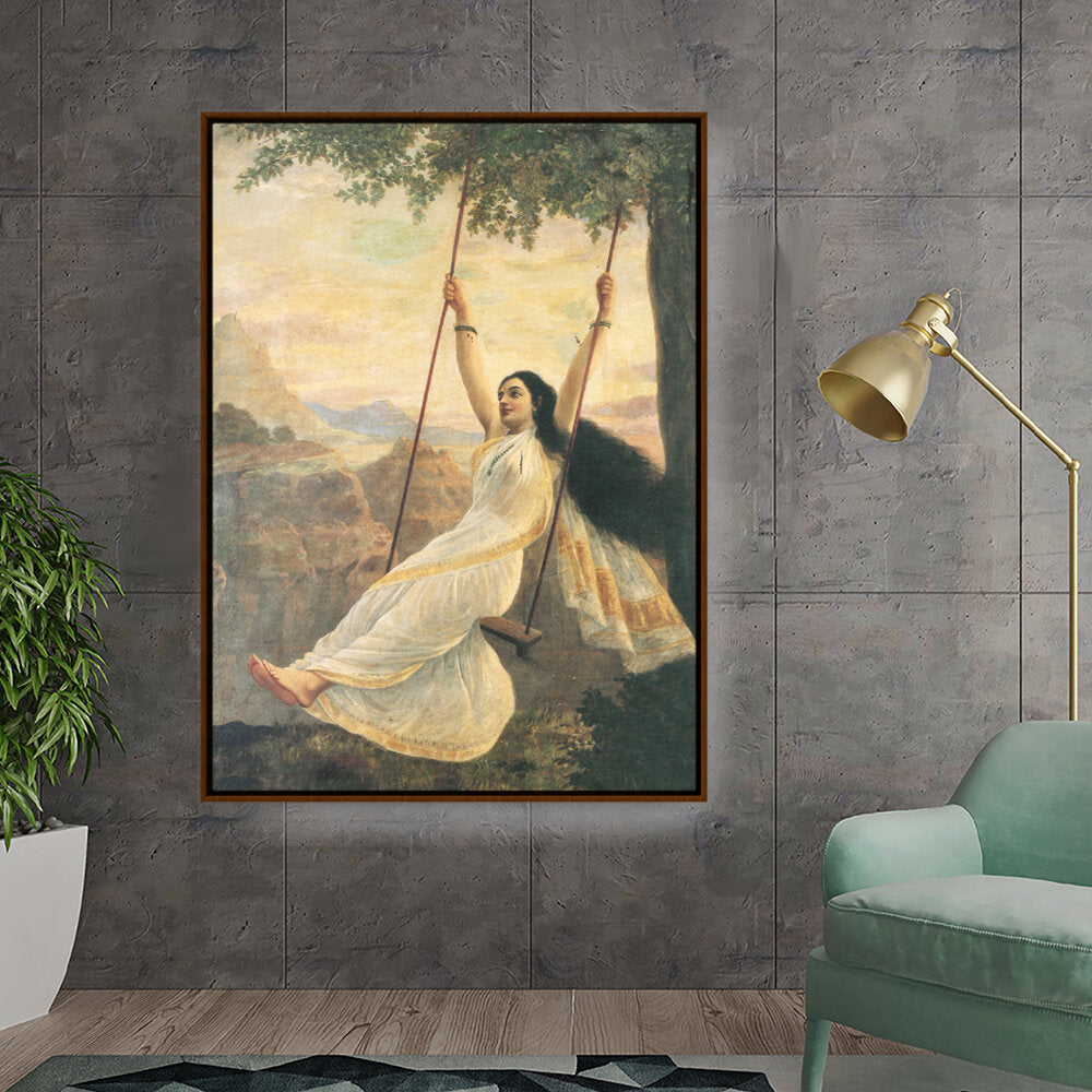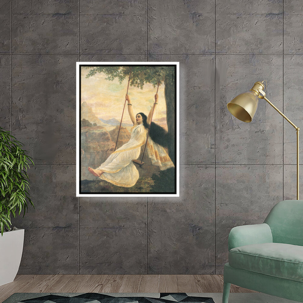 This captivating artwork features a woman in a flowing white saree, gracefully swinging under a tree. The serene landscape enhances the painting's romantic essence, making it a perfect addition for those seeking beauty and tranquility in their space.