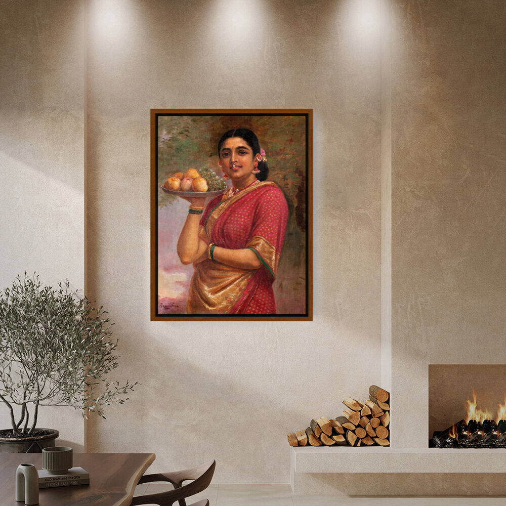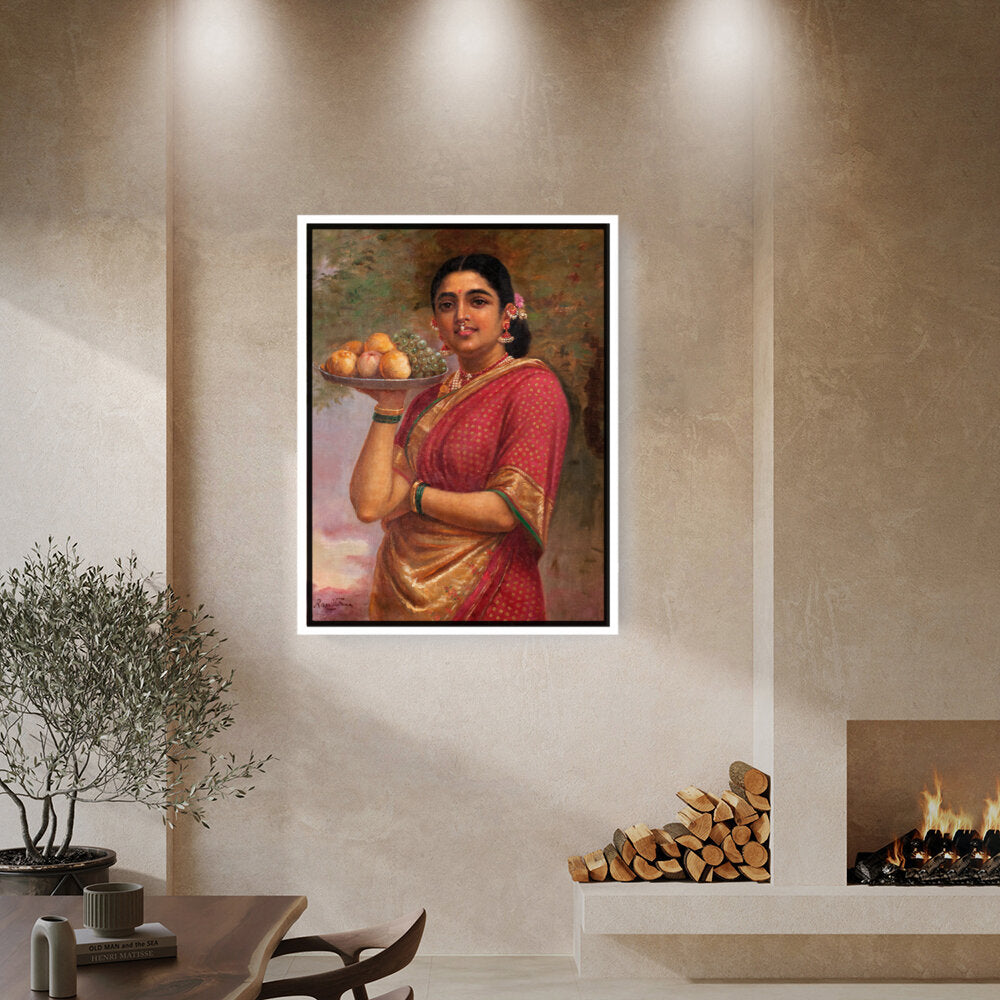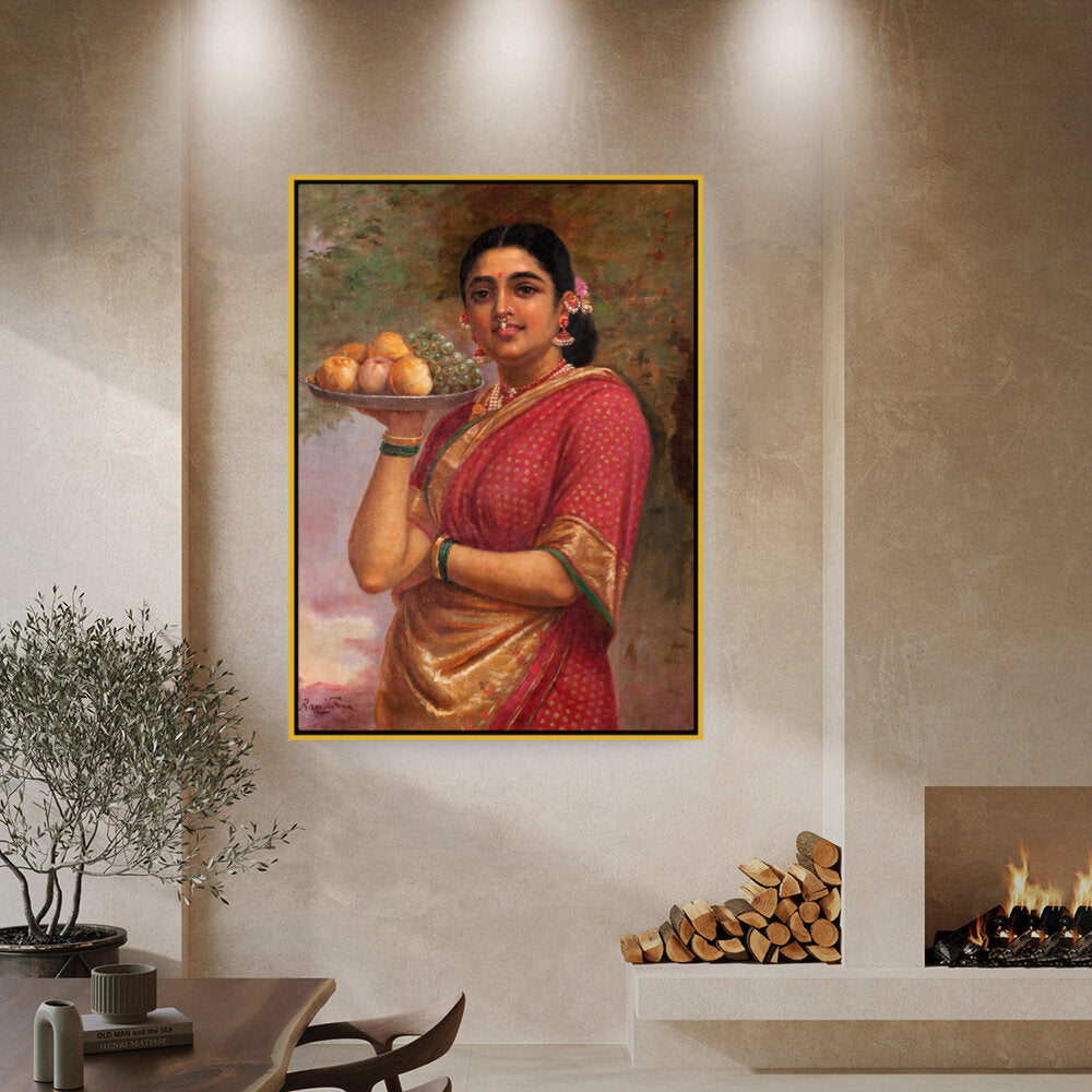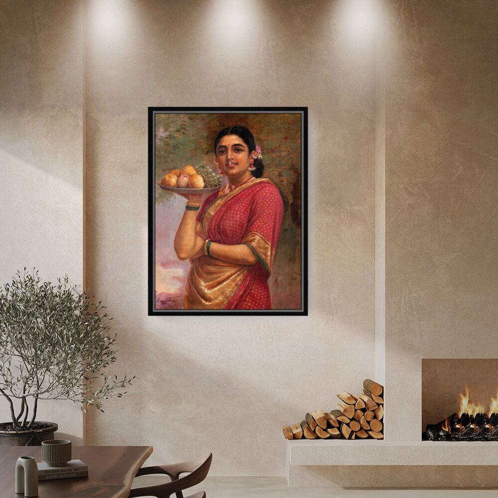 This exquisite portrait captures a woman adorned in a traditional sari, gracefully holding a platter of fruits. The vibrant colors and realistic details bring life to the scene, making it a perfect addition to a dining or living space.