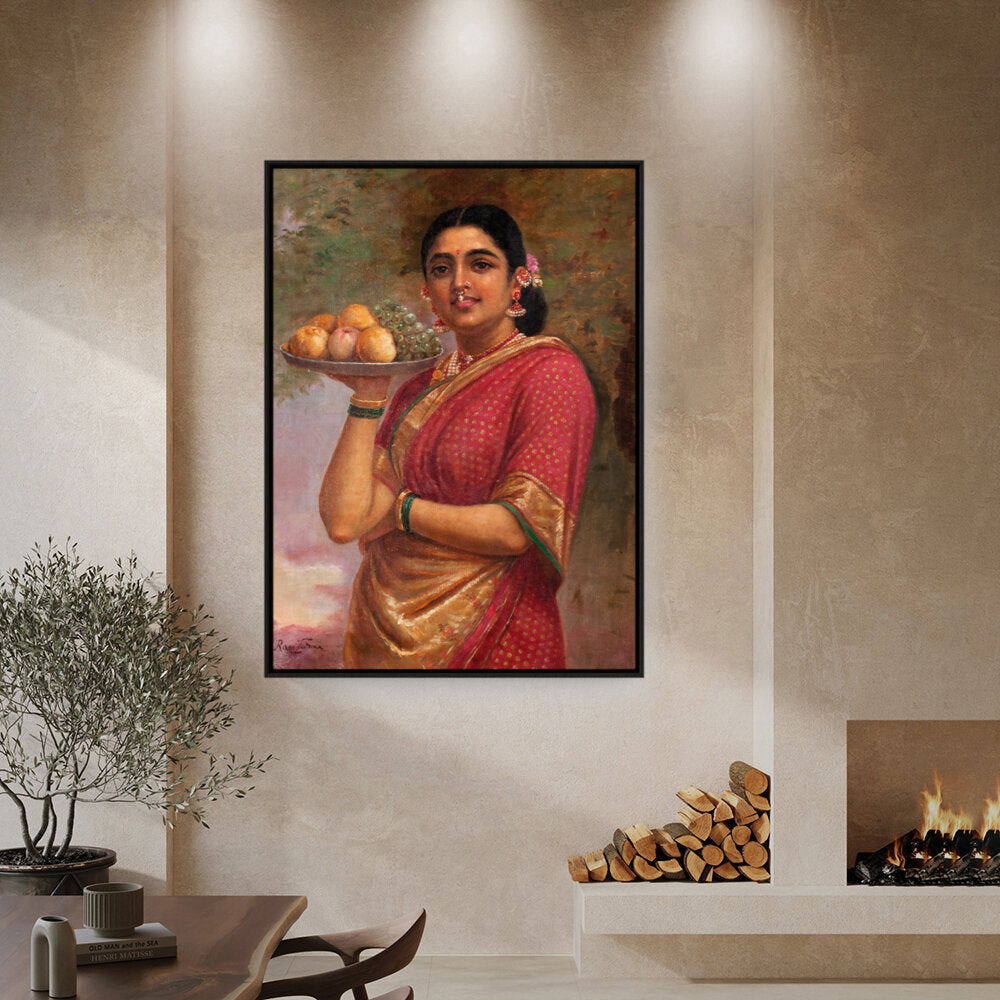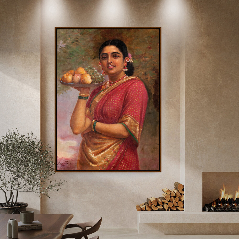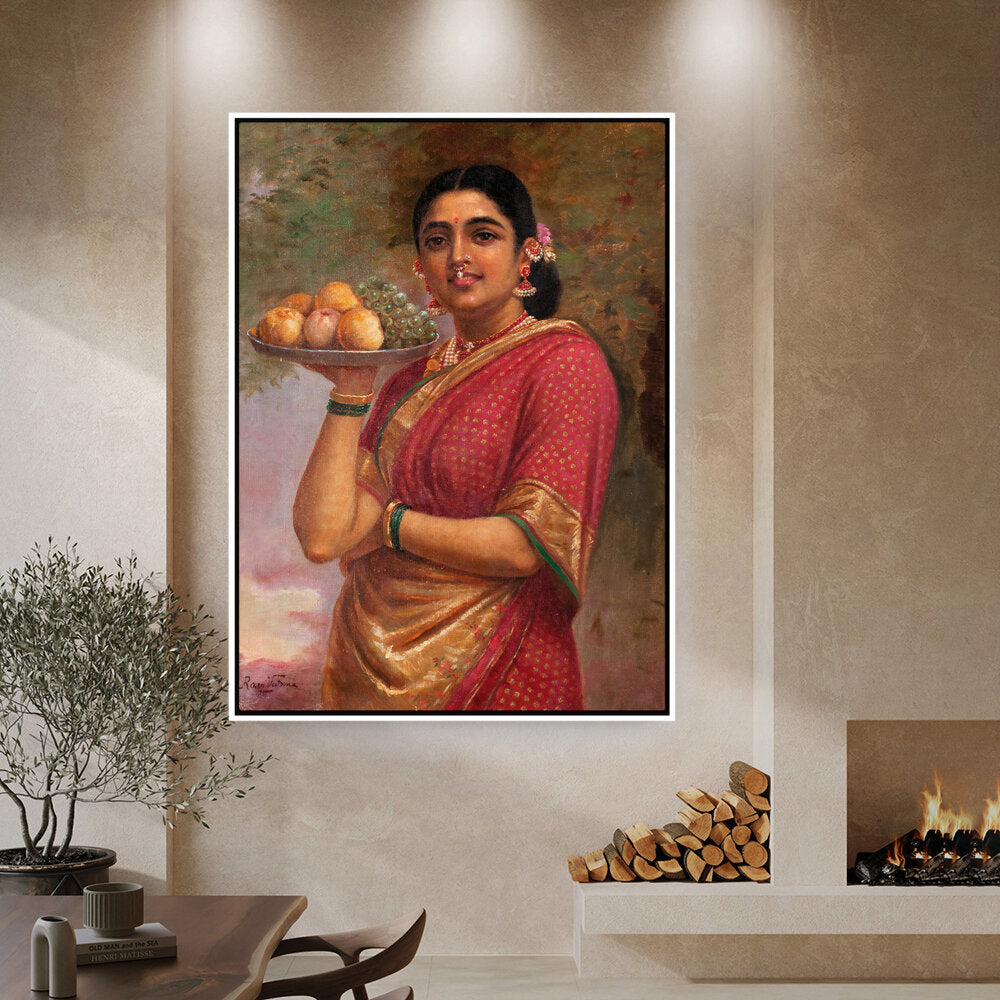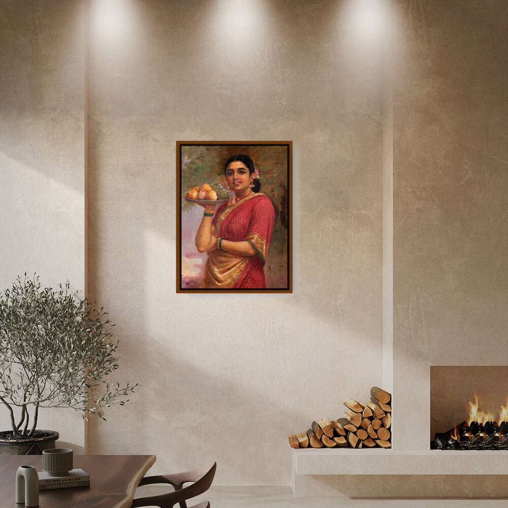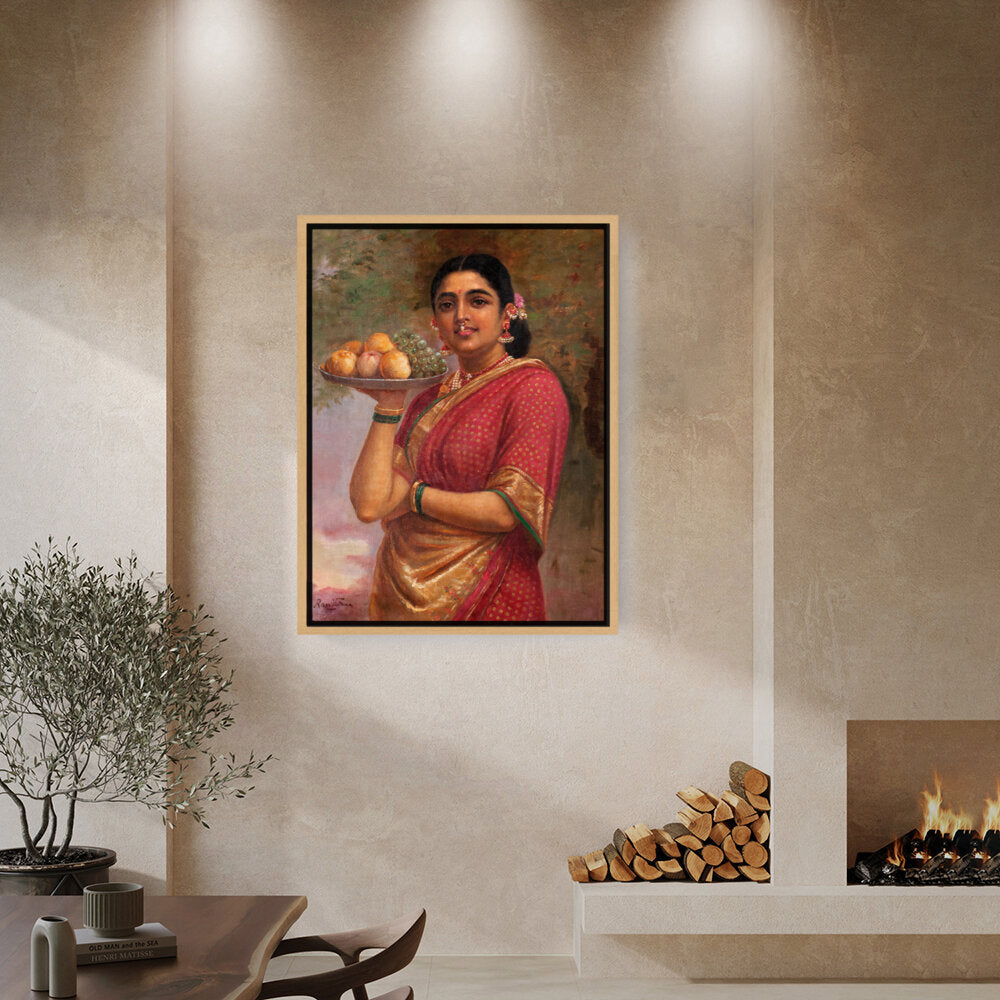 This exquisite portrait captures a woman adorned in a traditional sari, gracefully holding a platter of fruits. The vibrant colors and realistic details bring life to the scene, making it a perfect addition to a dining or living space.