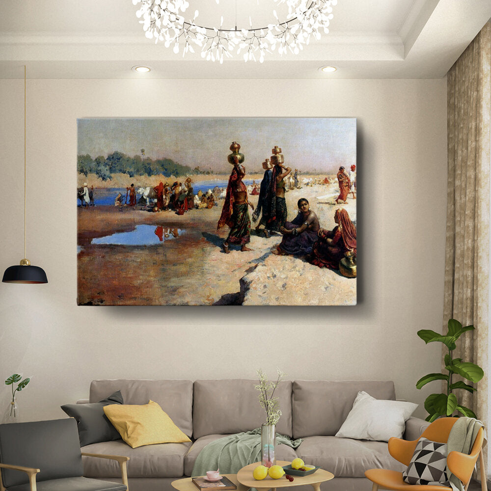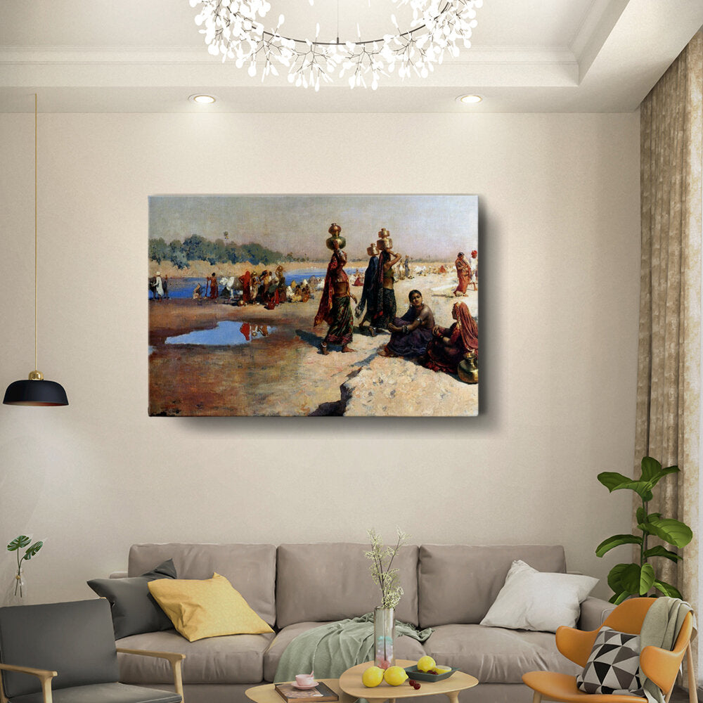This artwork depicts a vibrant scene of women carrying pots by the water, reflecting the daily life and cultural practices in India. The colors and composition capture the essence of community and tradition in a serene landscape.